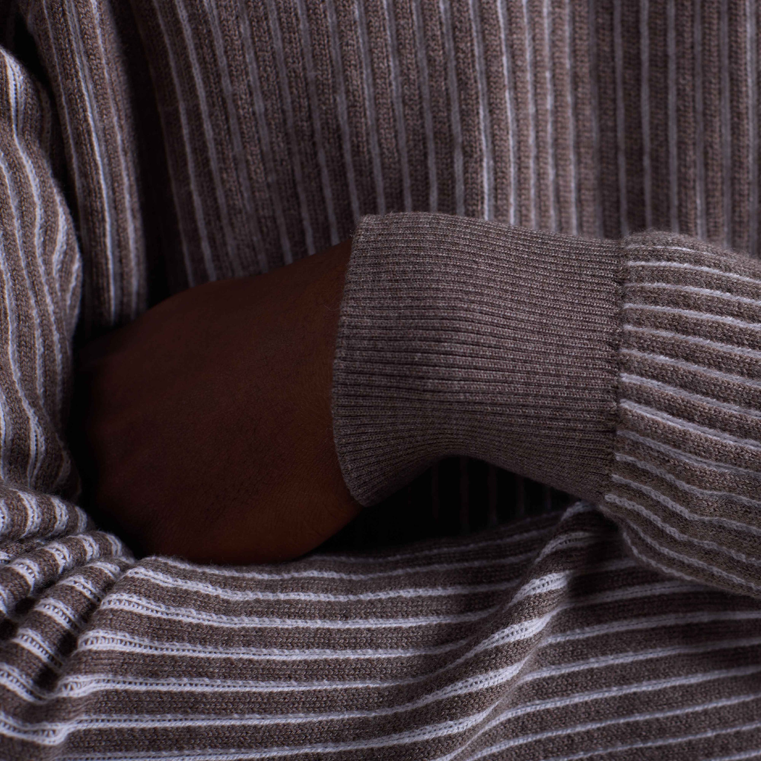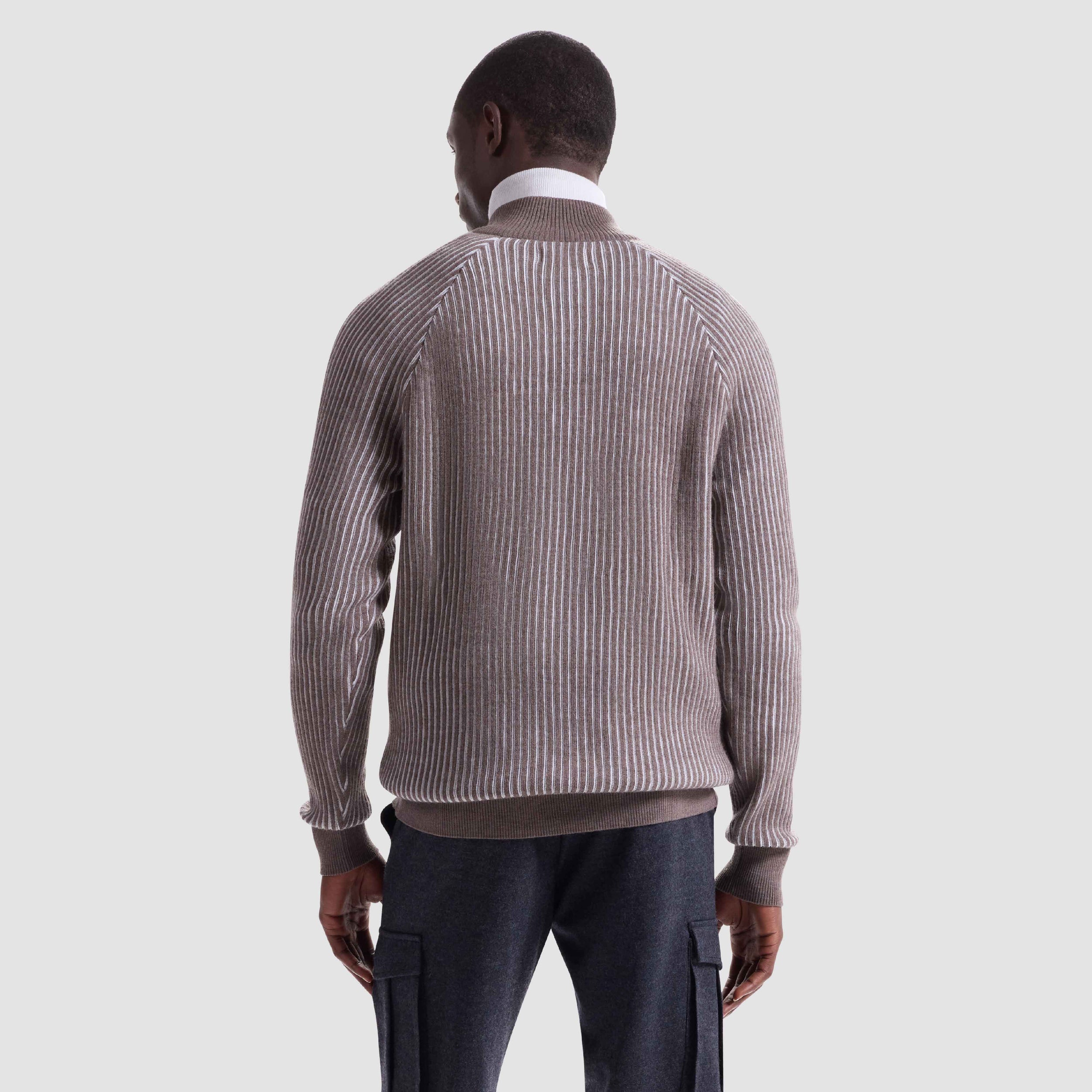 Crafted from 100% extrafine Merino wool, this long sleeve quarter zip sweater features a two-tone rib knit pattern that adds subtle contrast and visual depth. The solid ribbed mock neck, cuffs, and hem provide a clean, structured finish, balancing the textured body. A versatile piece that combines warmth and sophistication with a contemporary twist.