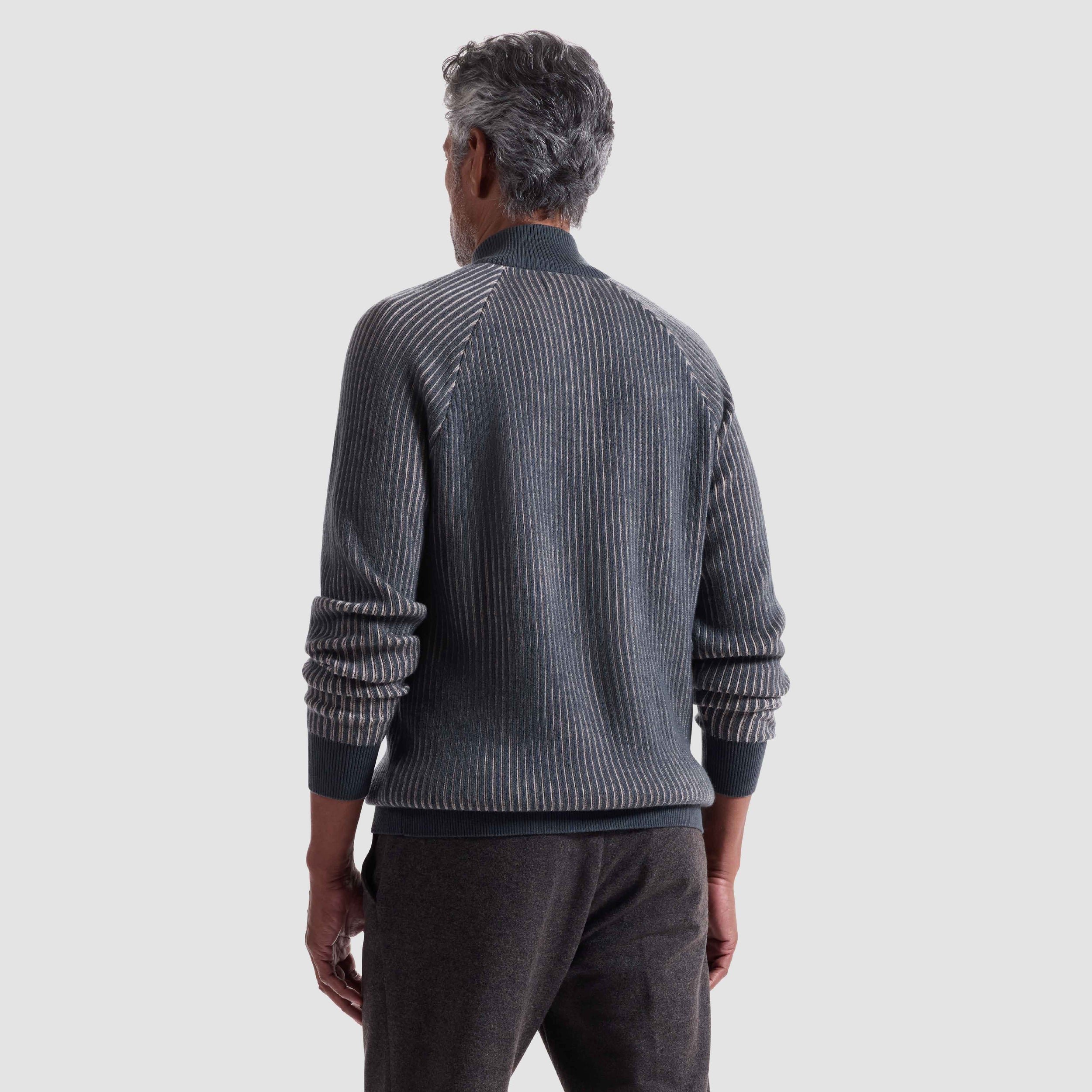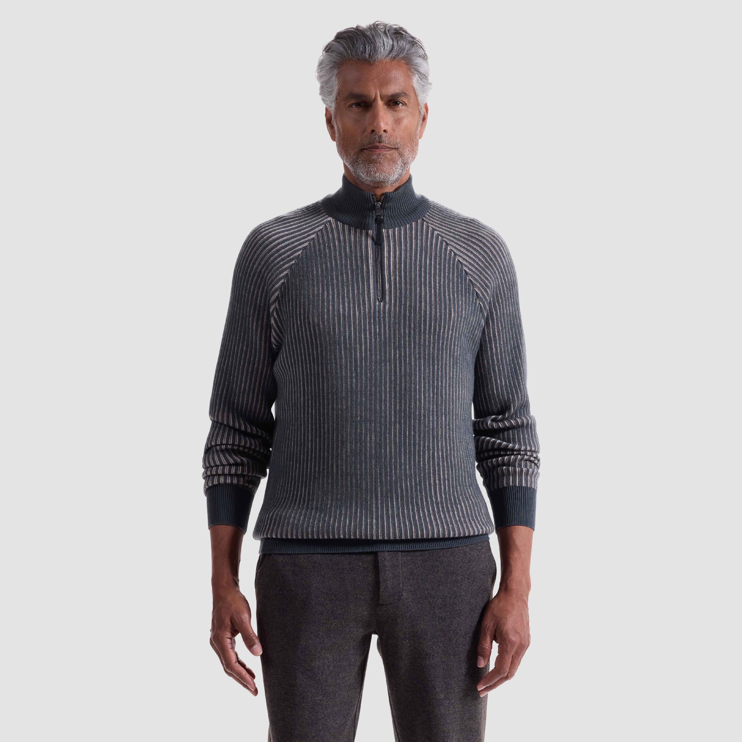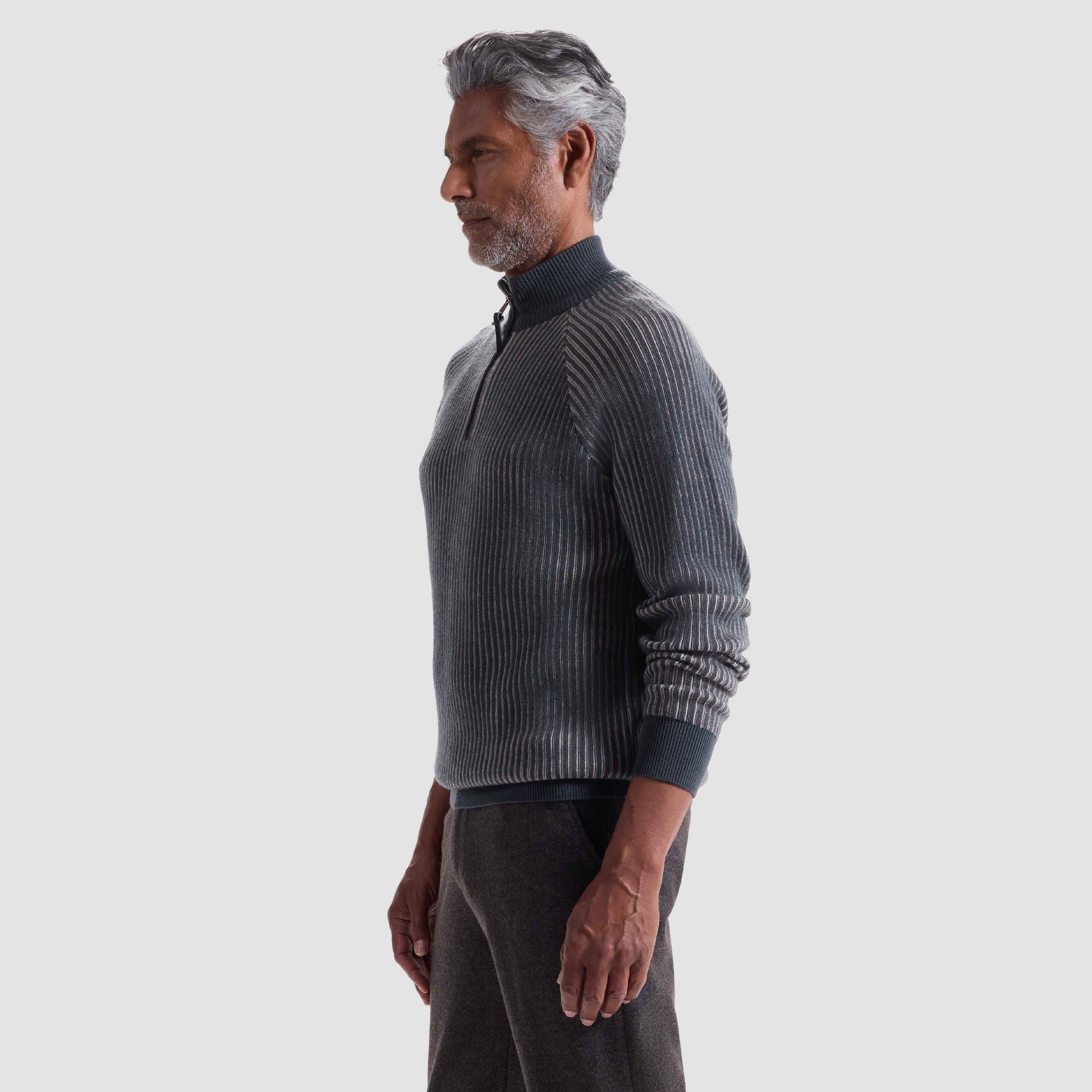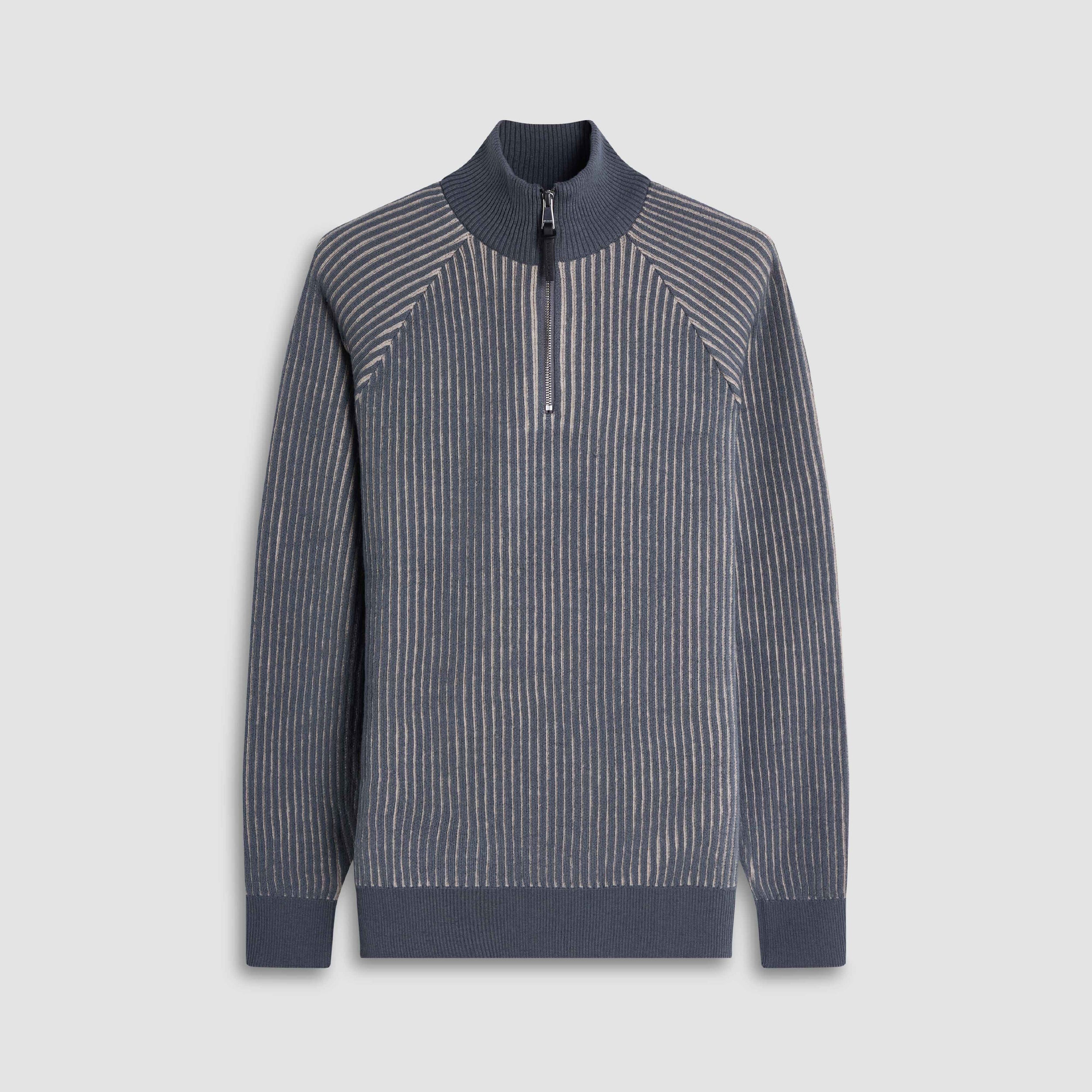 Crafted from 100% extrafine Merino wool, this long sleeve quarter zip sweater features a two-tone rib knit pattern that adds subtle contrast and visual depth. The solid ribbed mock neck, cuffs, and hem provide a clean, structured finish, balancing the textured body. A versatile piece that combines warmth and sophistication with a contemporary twist.