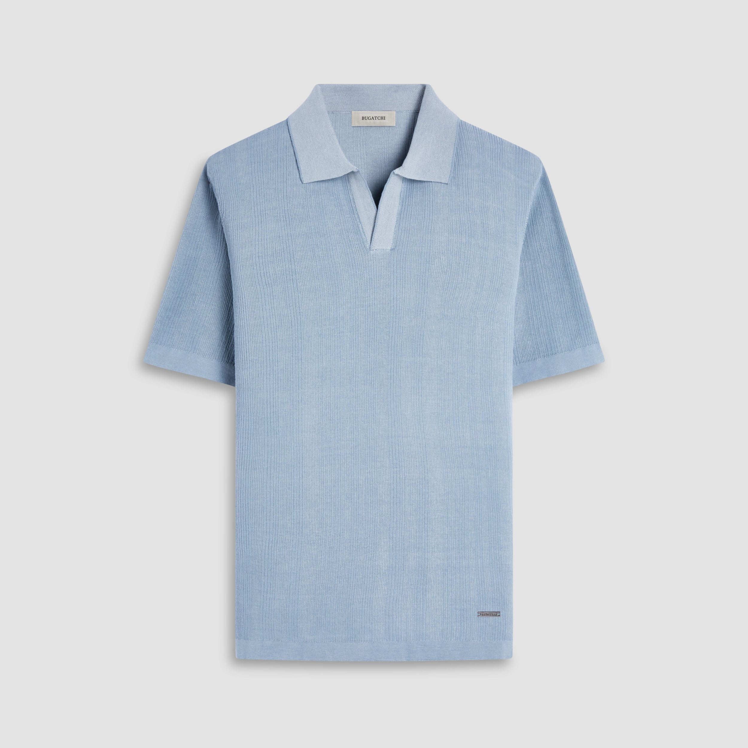 This short-sleeve Johnny collar sweater, made from a luxurious cotton and silk blend, showcases a stylish two-tone rib stitch that adds texture and depth. The tonal bird's eye collar features a refined contrast tipping detail, elevating its sophisticated design. The flat knit cuffs and waist provide a sleek, structured finish. Lightweight and versatile, this sweater offers a polished look, perfect for both casual and smart occasions.