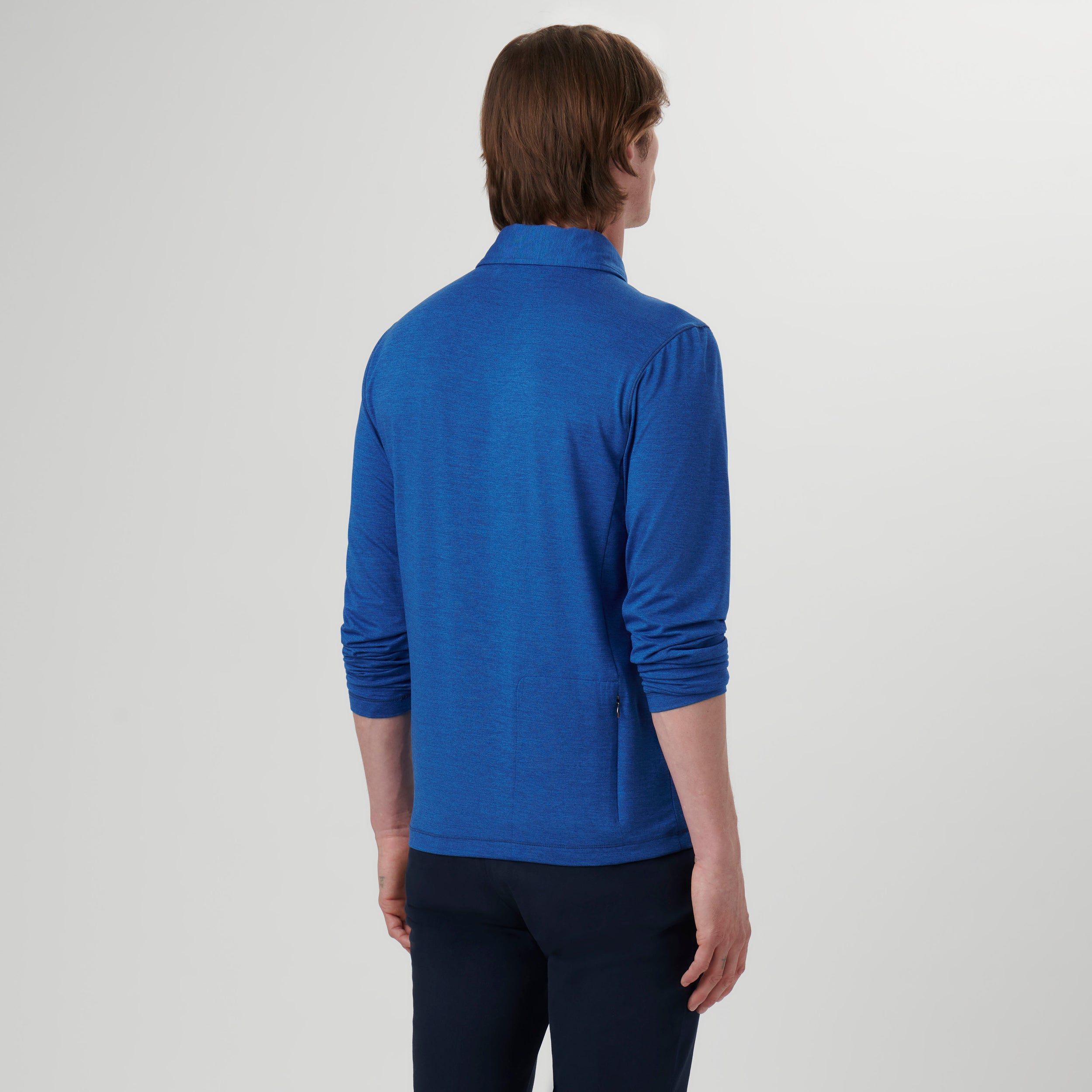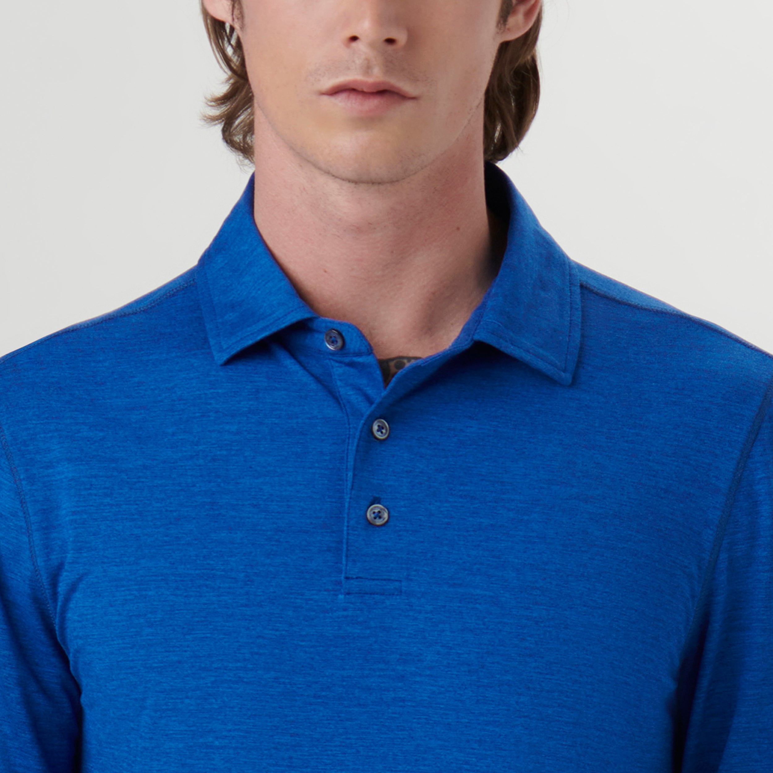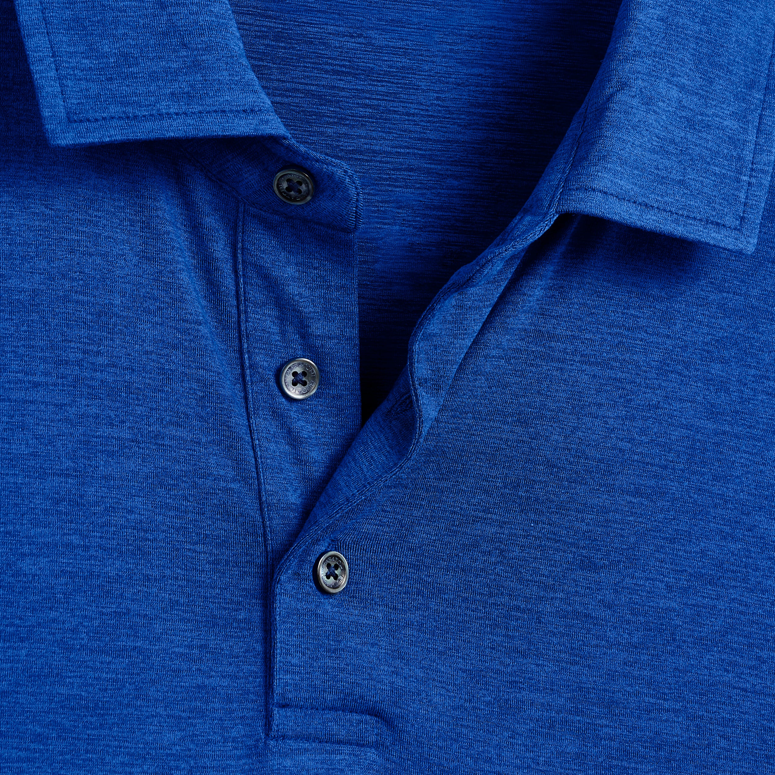 Long-sleeved polo in solid 4-way stretch performance fabric with a three button placket, genuine shell buttons, self fabric collar and back pocket with invisible zipper. This garment protects against UV rays (UPF50+).