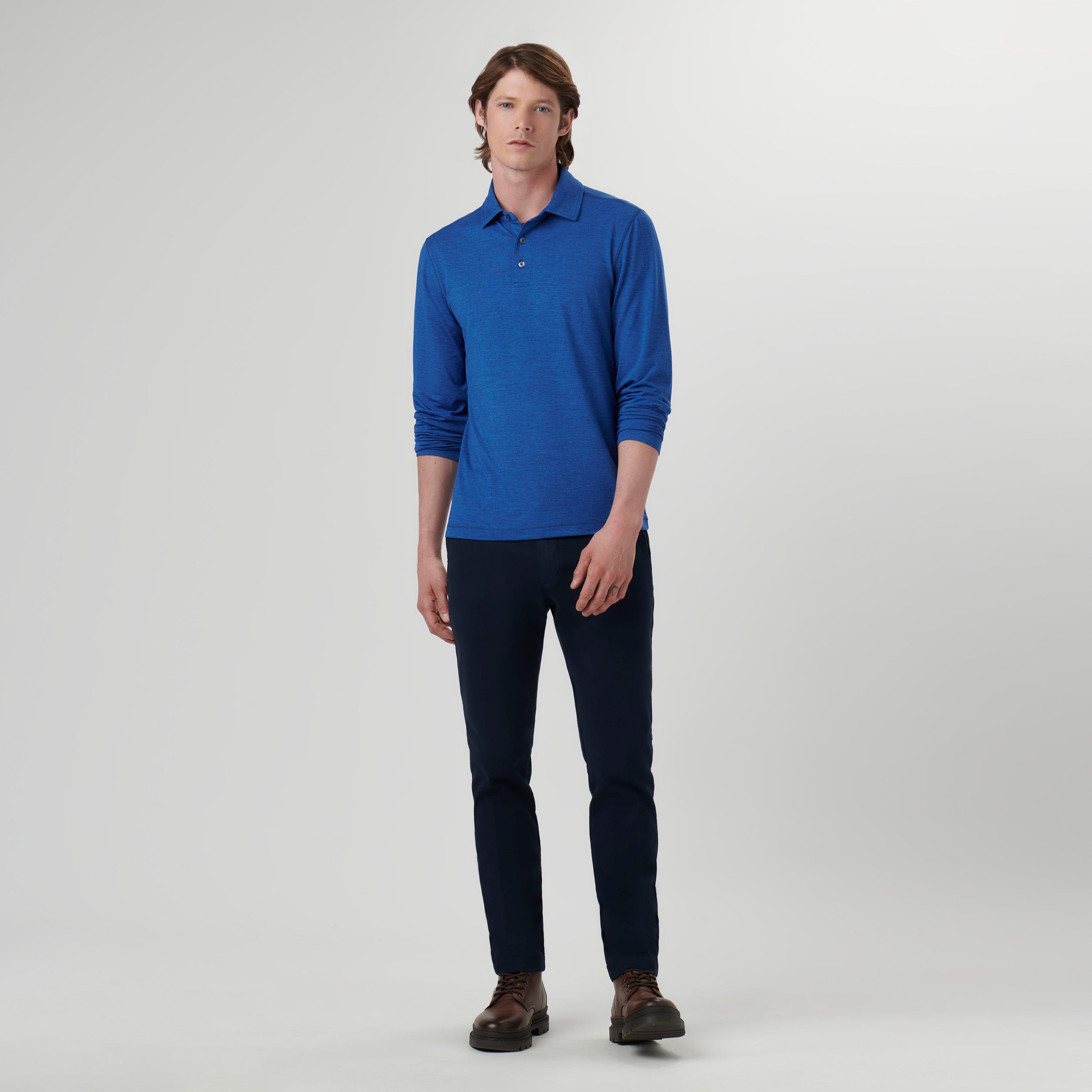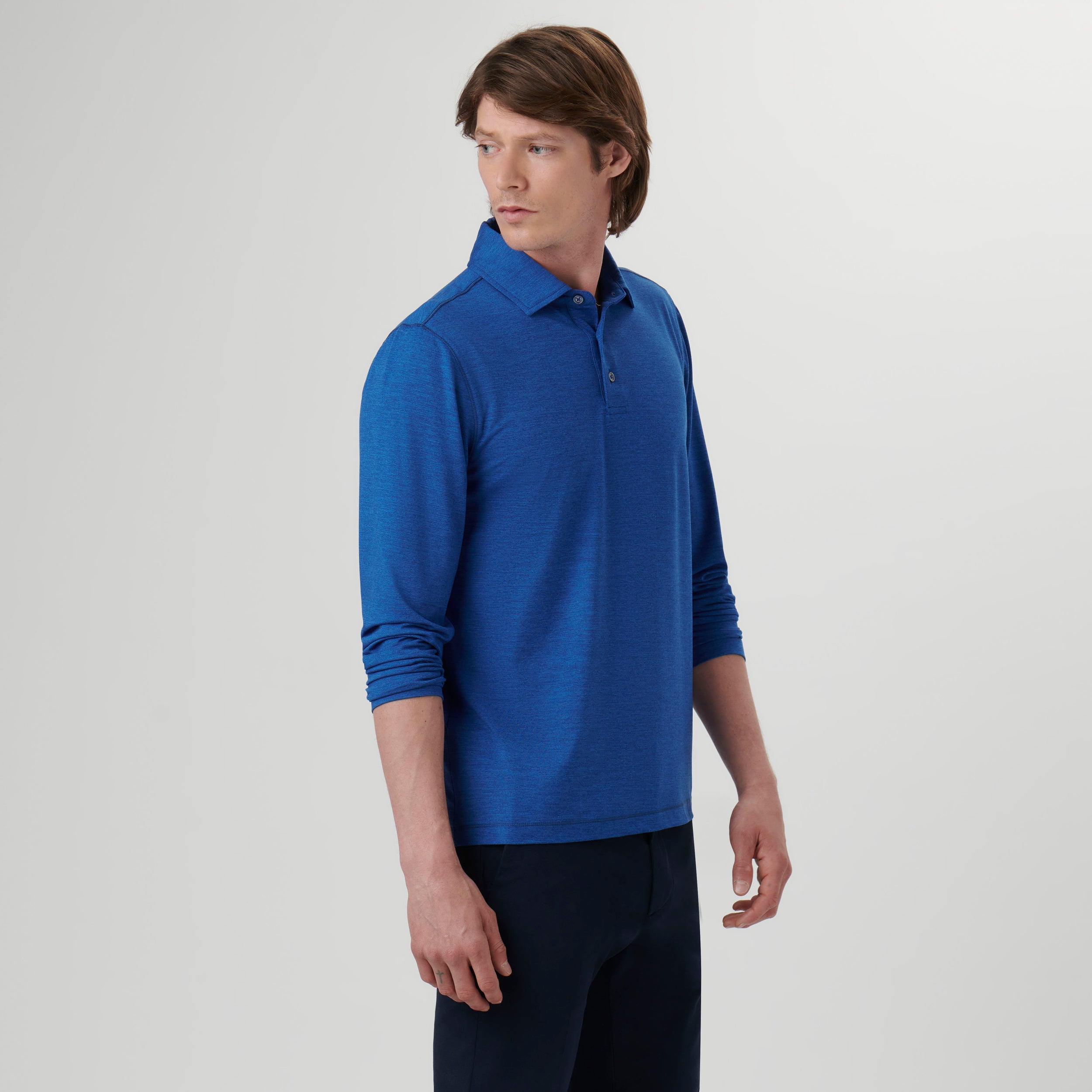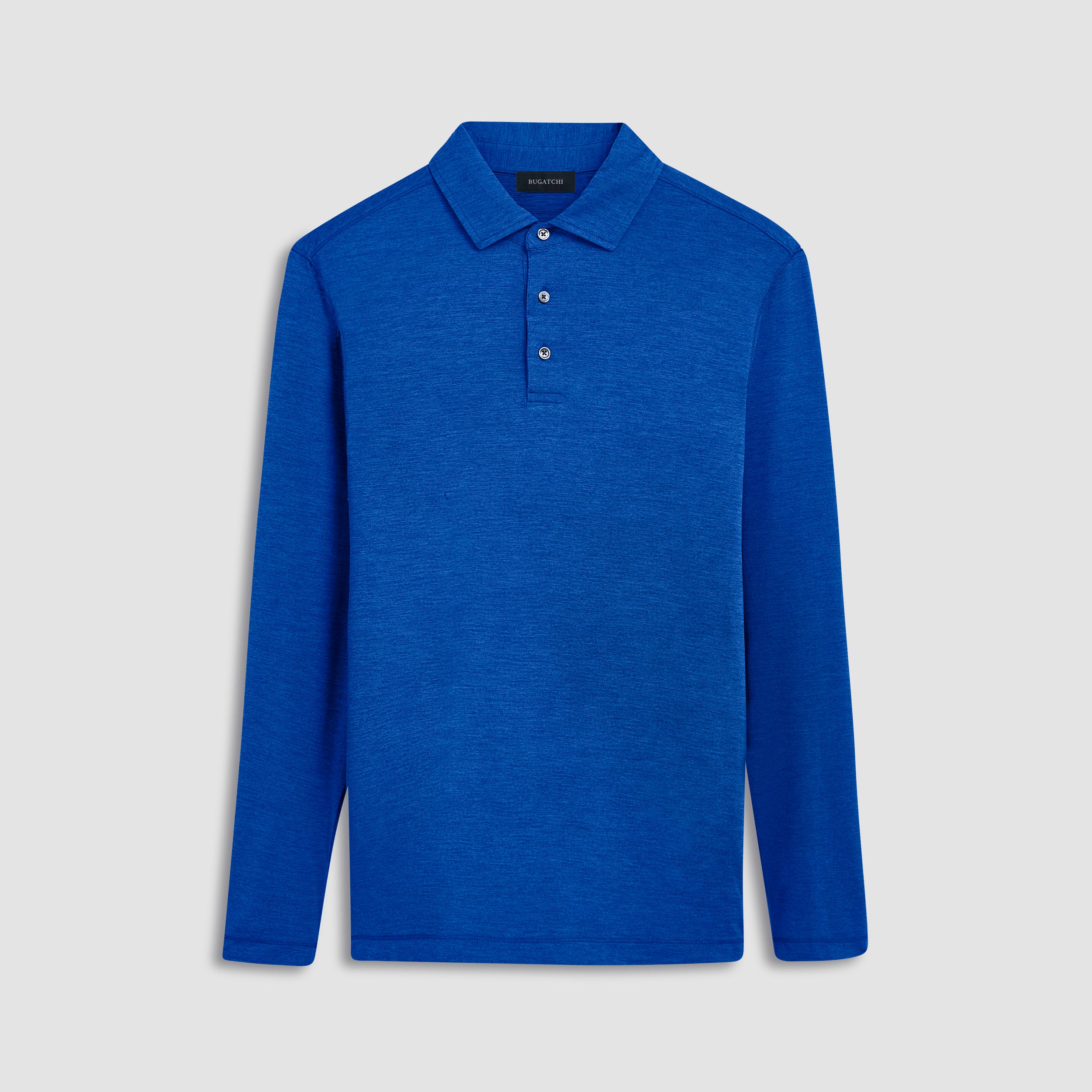 Long-sleeved polo in solid 4-way stretch performance fabric with a three button placket, genuine shell buttons, self fabric collar and back pocket with invisible zipper. This garment protects against UV rays (UPF50+).