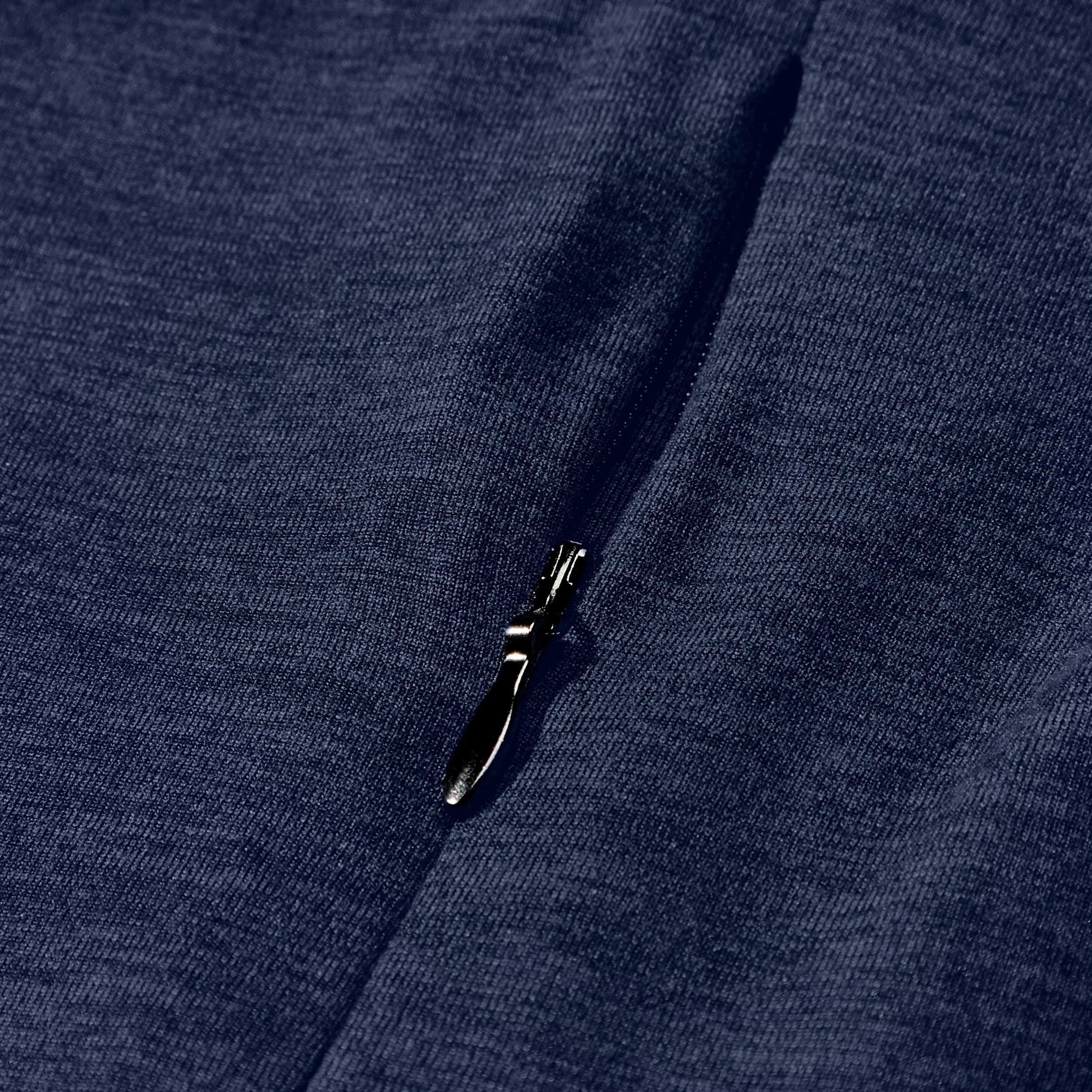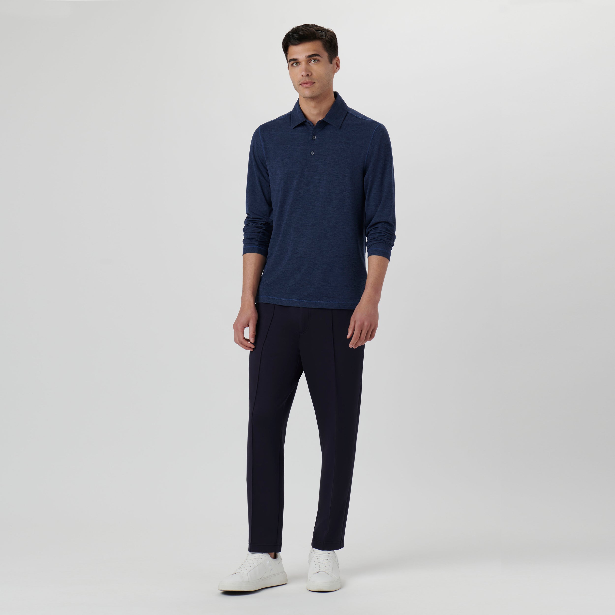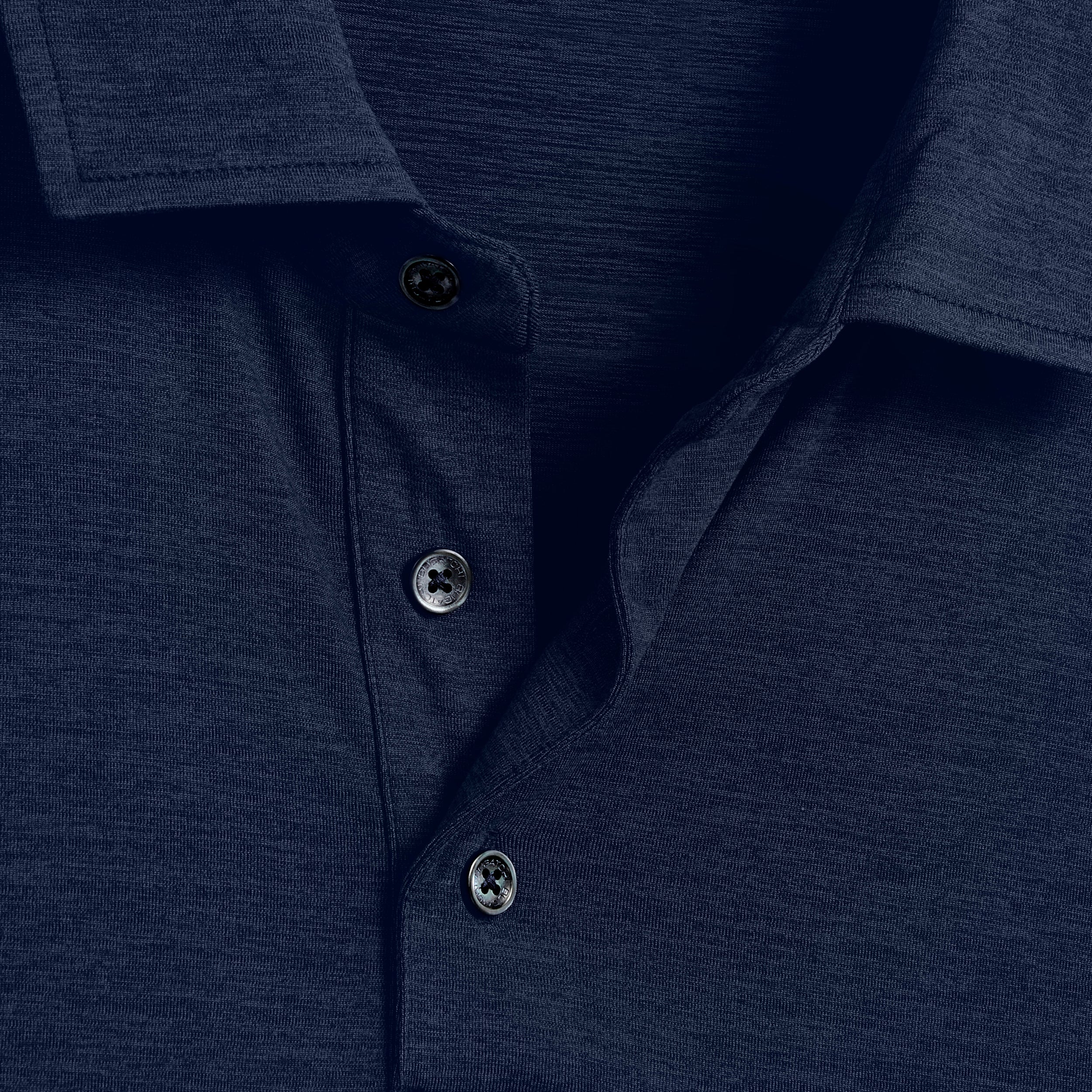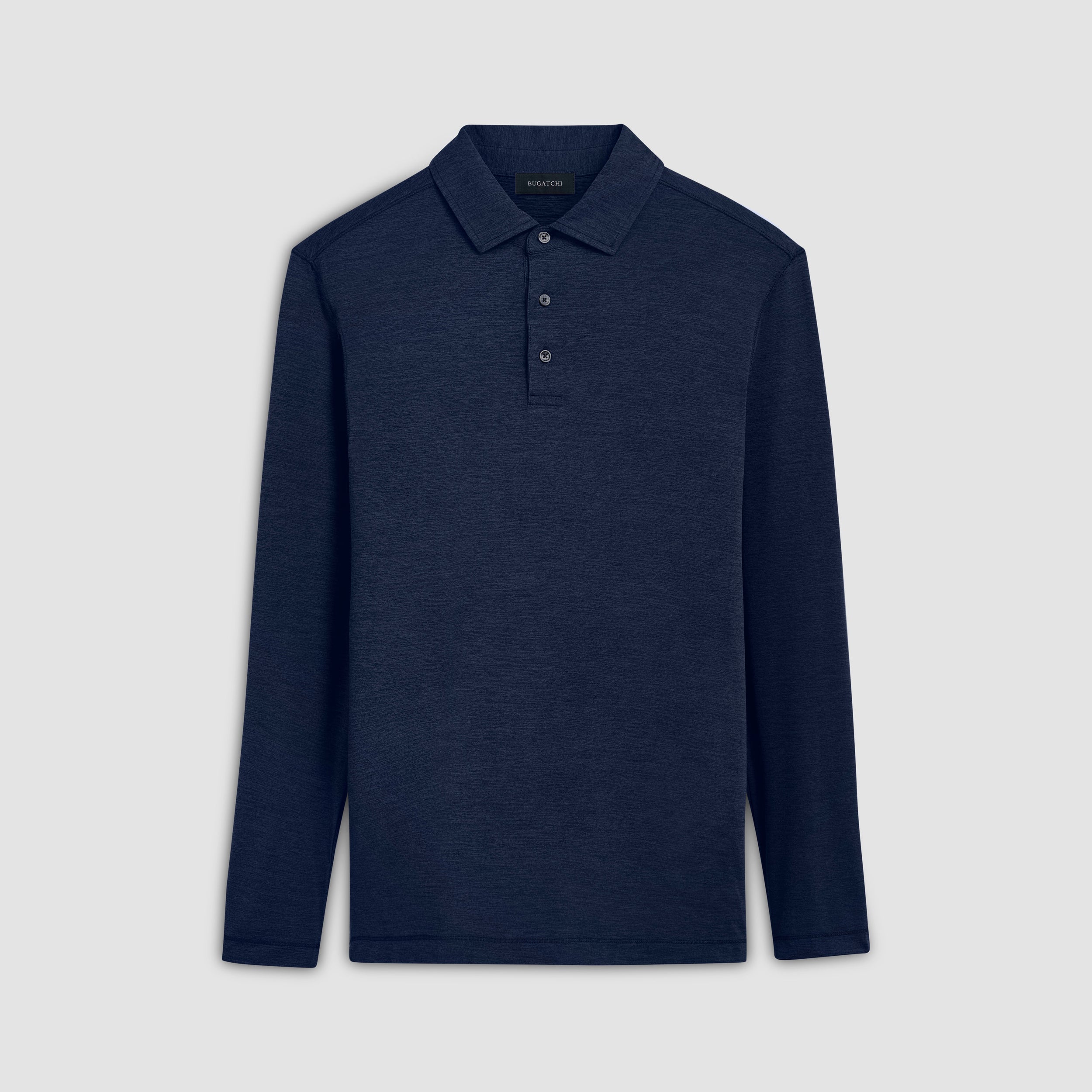 Long-sleeved polo in solid 4-way stretch performance fabric with a three button placket, genuine shell buttons, self fabric collar and back pocket with invisible zipper. This garment protects against UV rays (UPF50+).