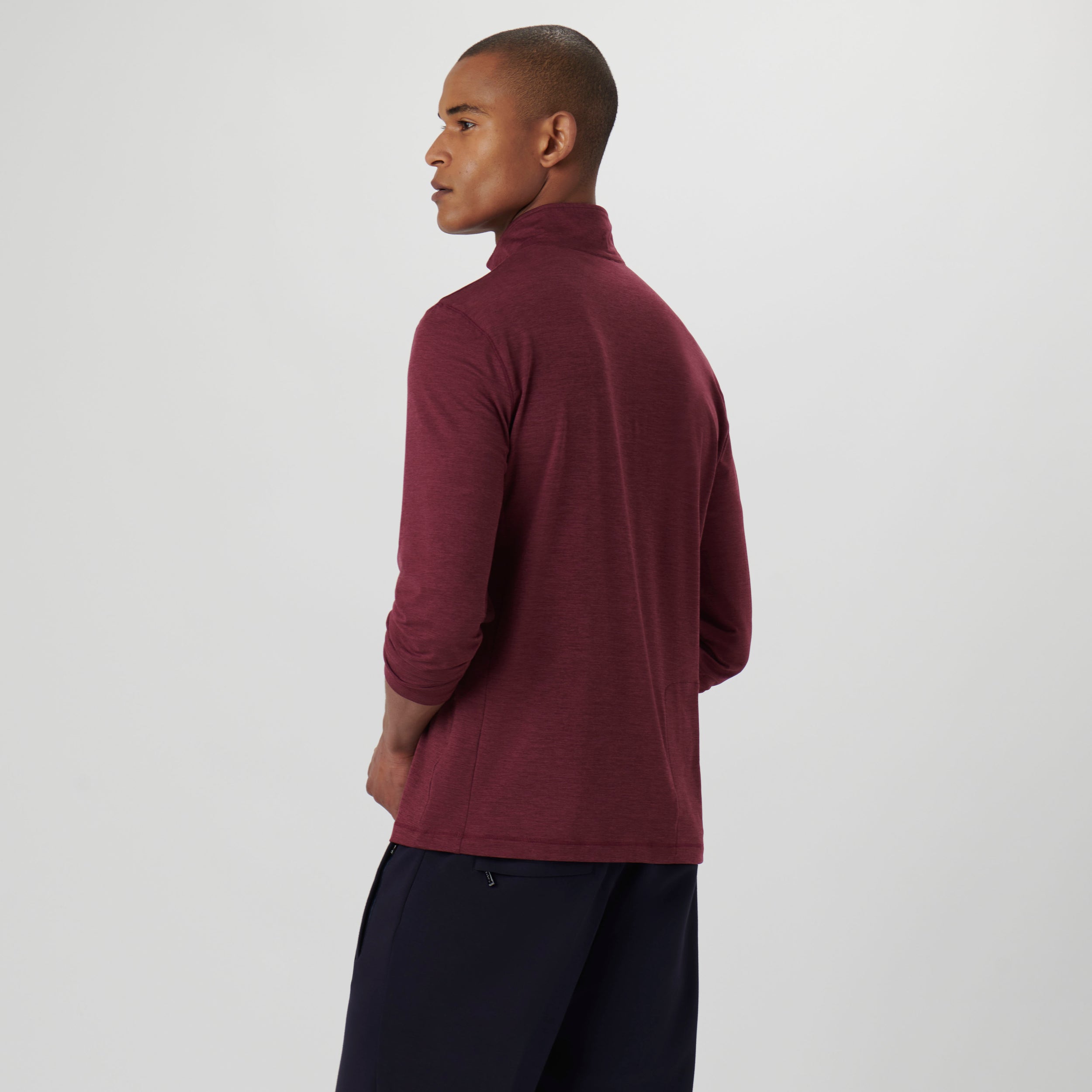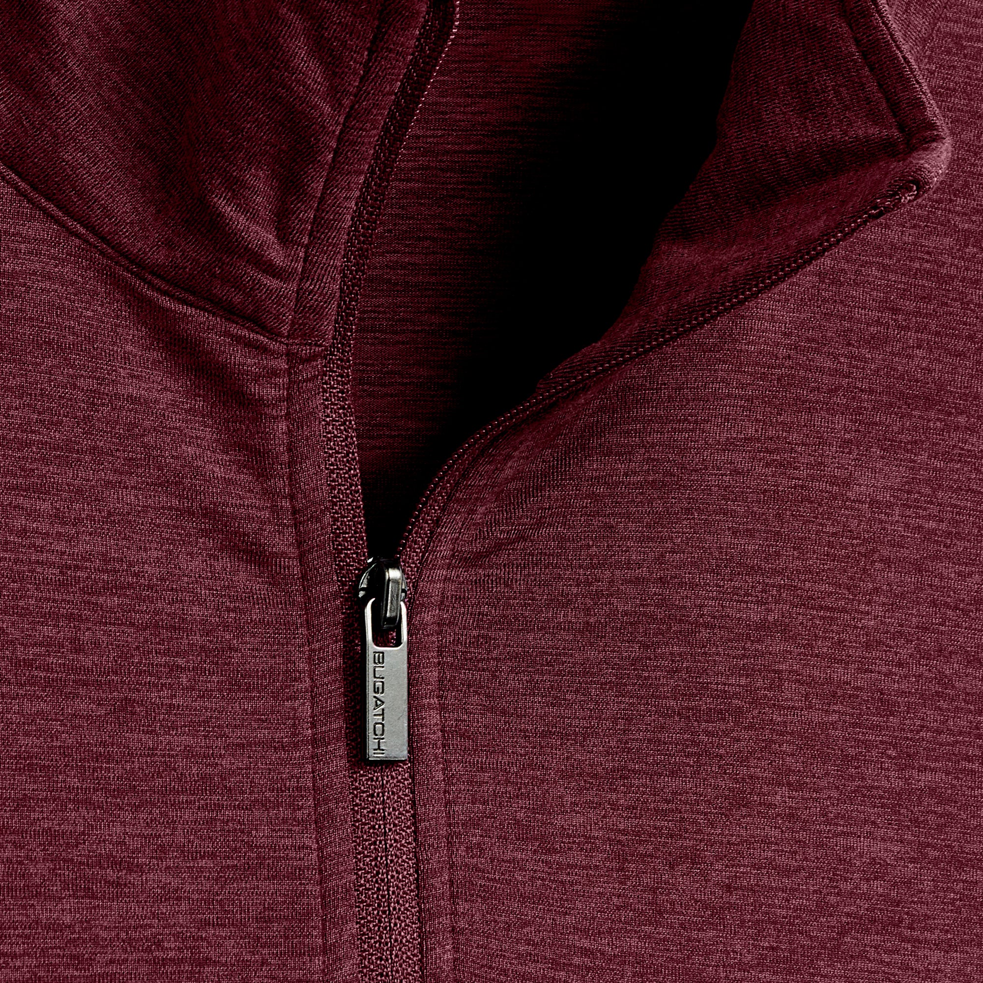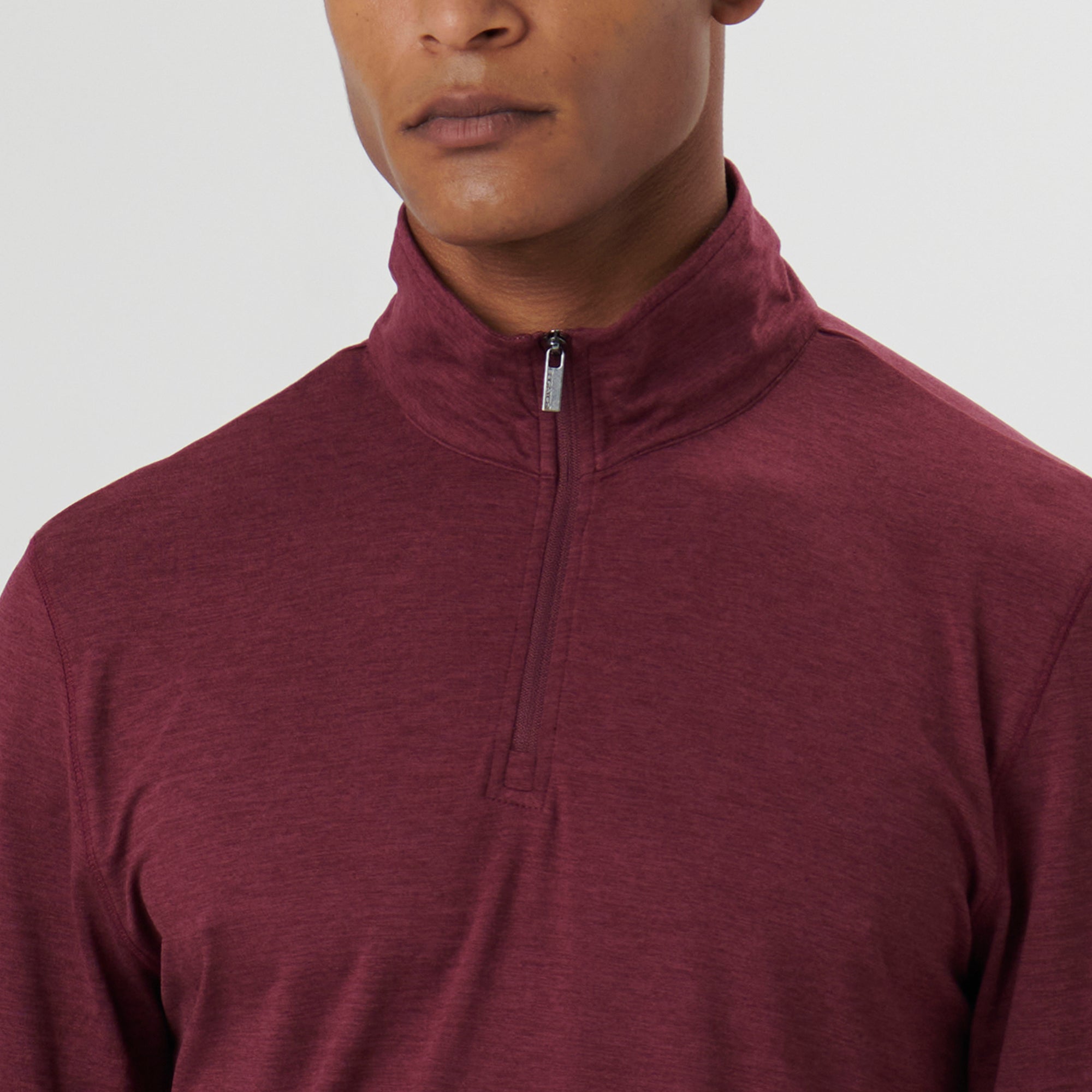 Long-sleeved pullover in solid 4-way stretch performance fabric with quarter zipper closure, self fabric collar and back pocket with invisible zipper. This garment protects against UV rays (UPF50+).
