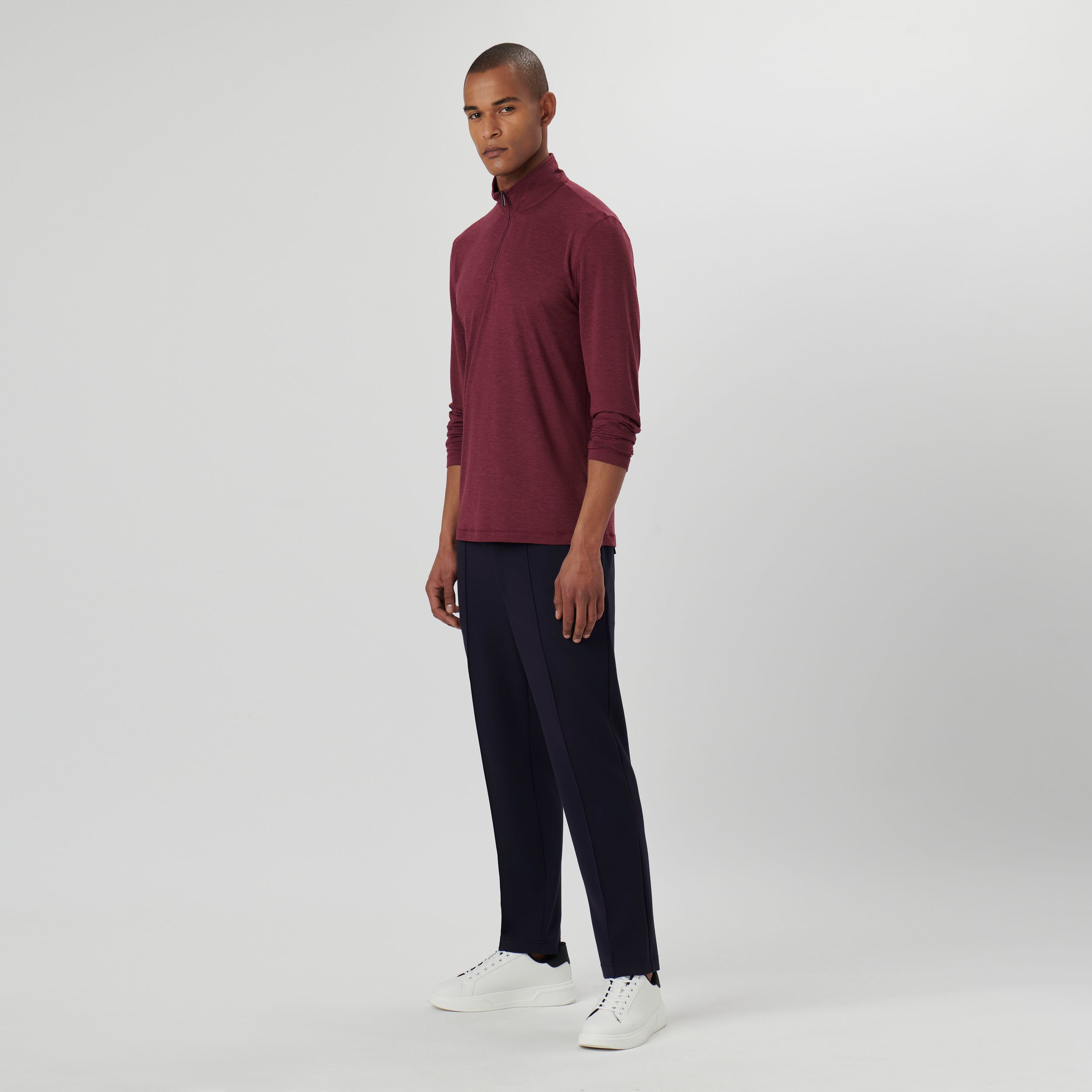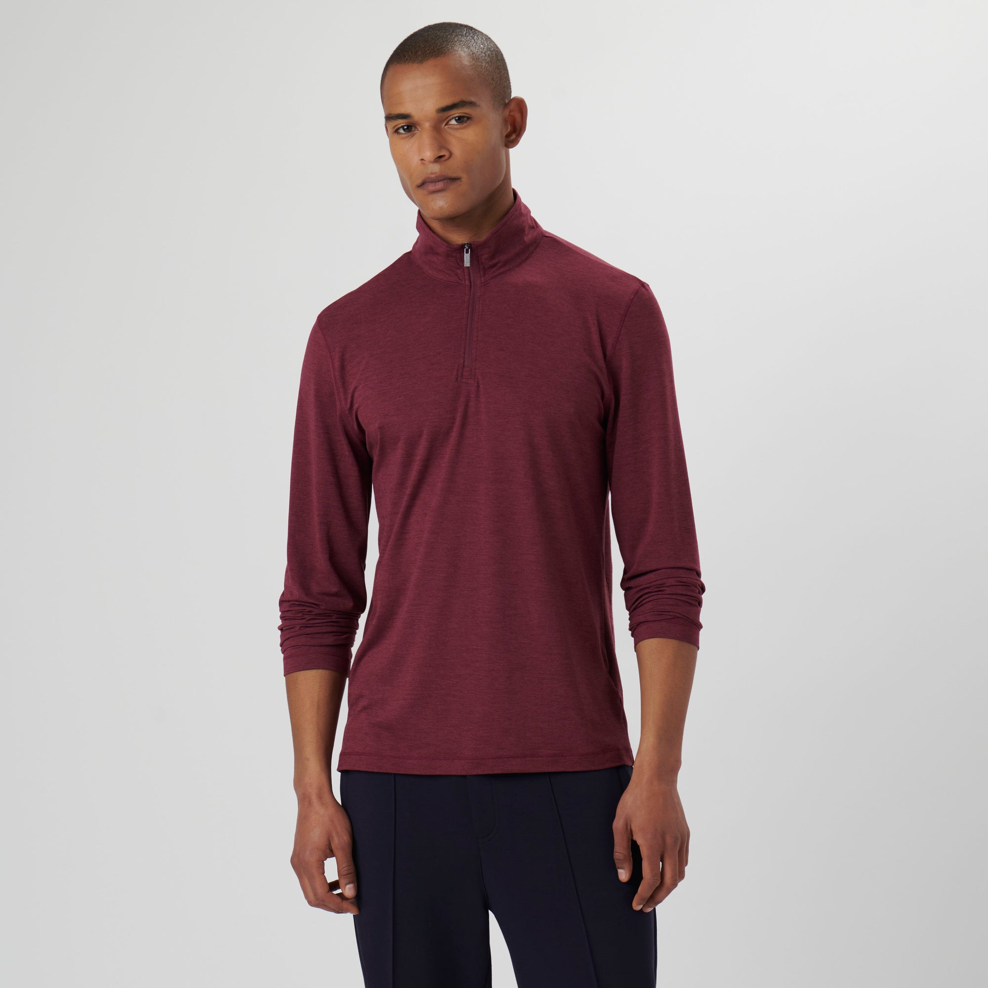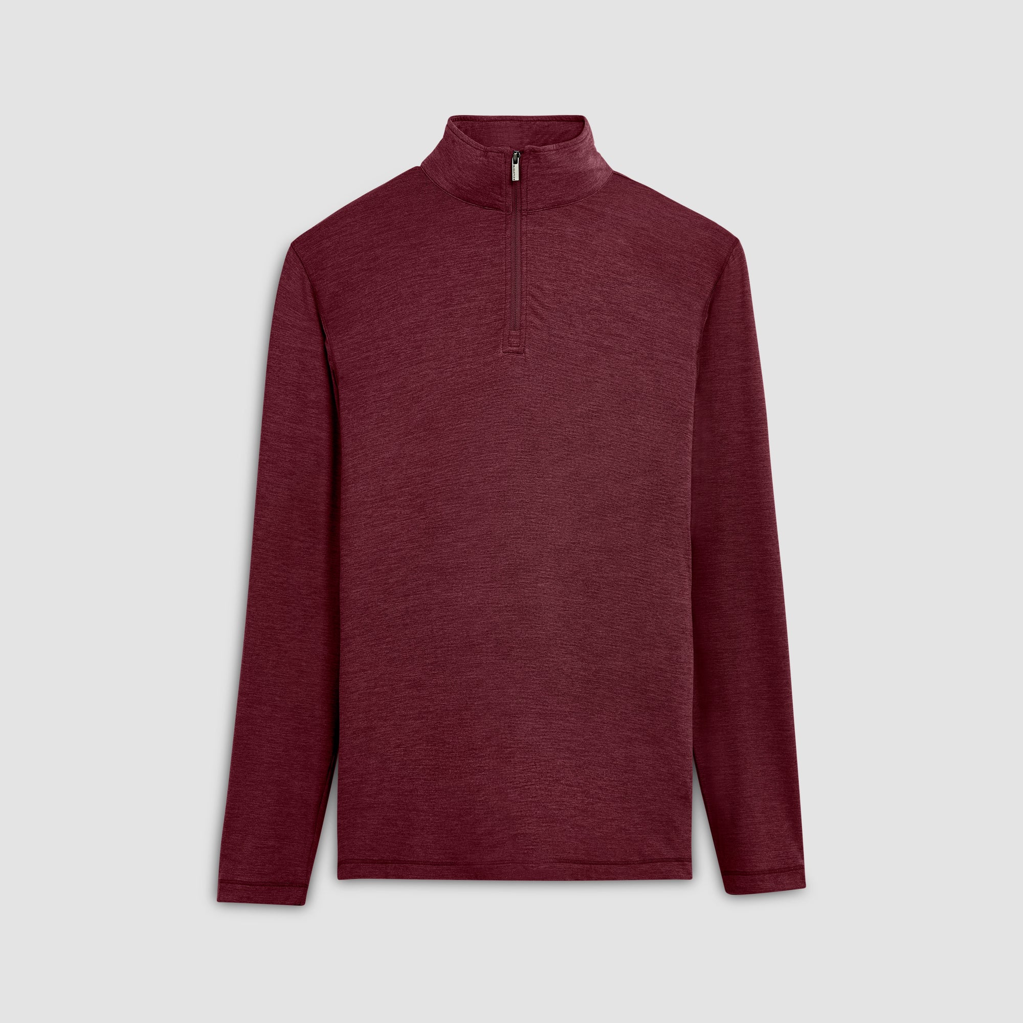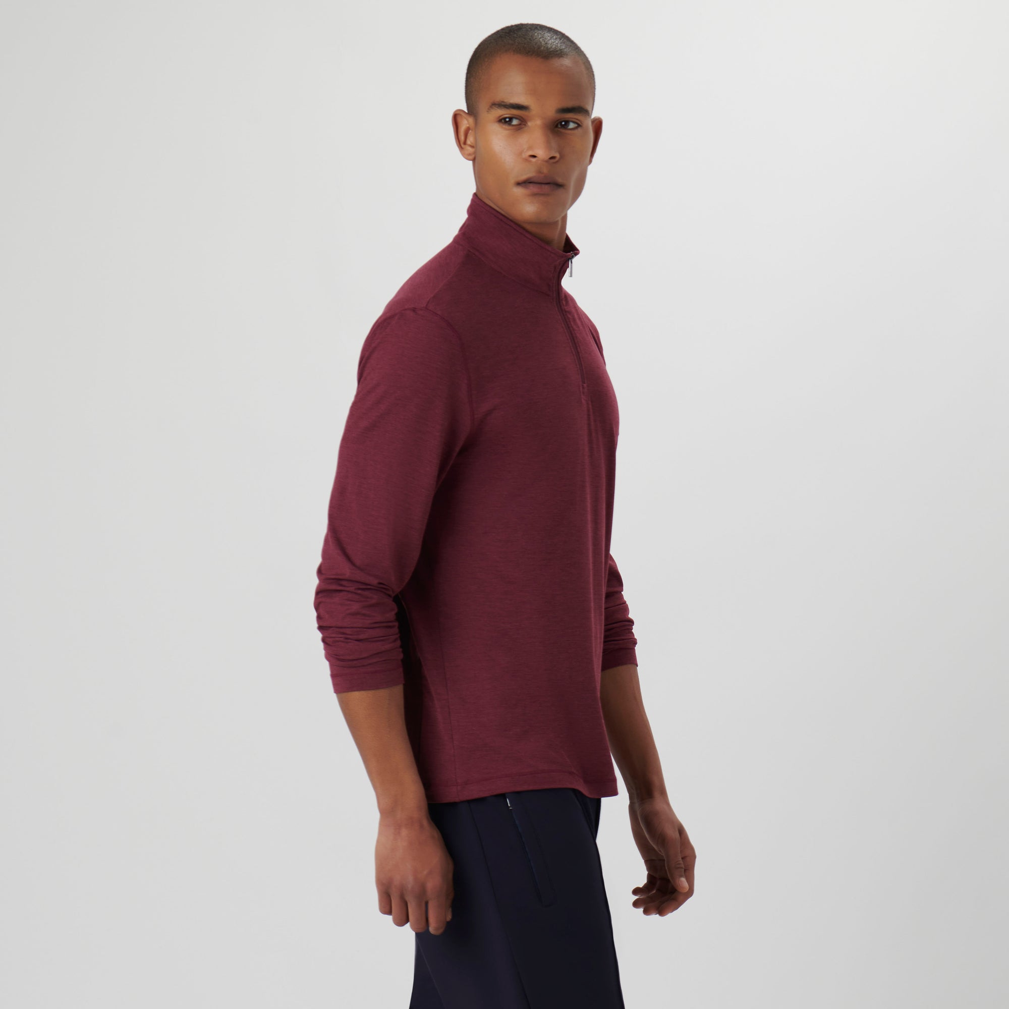Long-sleeved pullover in solid 4-way stretch performance fabric with quarter zipper closure, self fabric collar and back pocket with invisible zipper. This garment protects against UV rays (UPF50+).