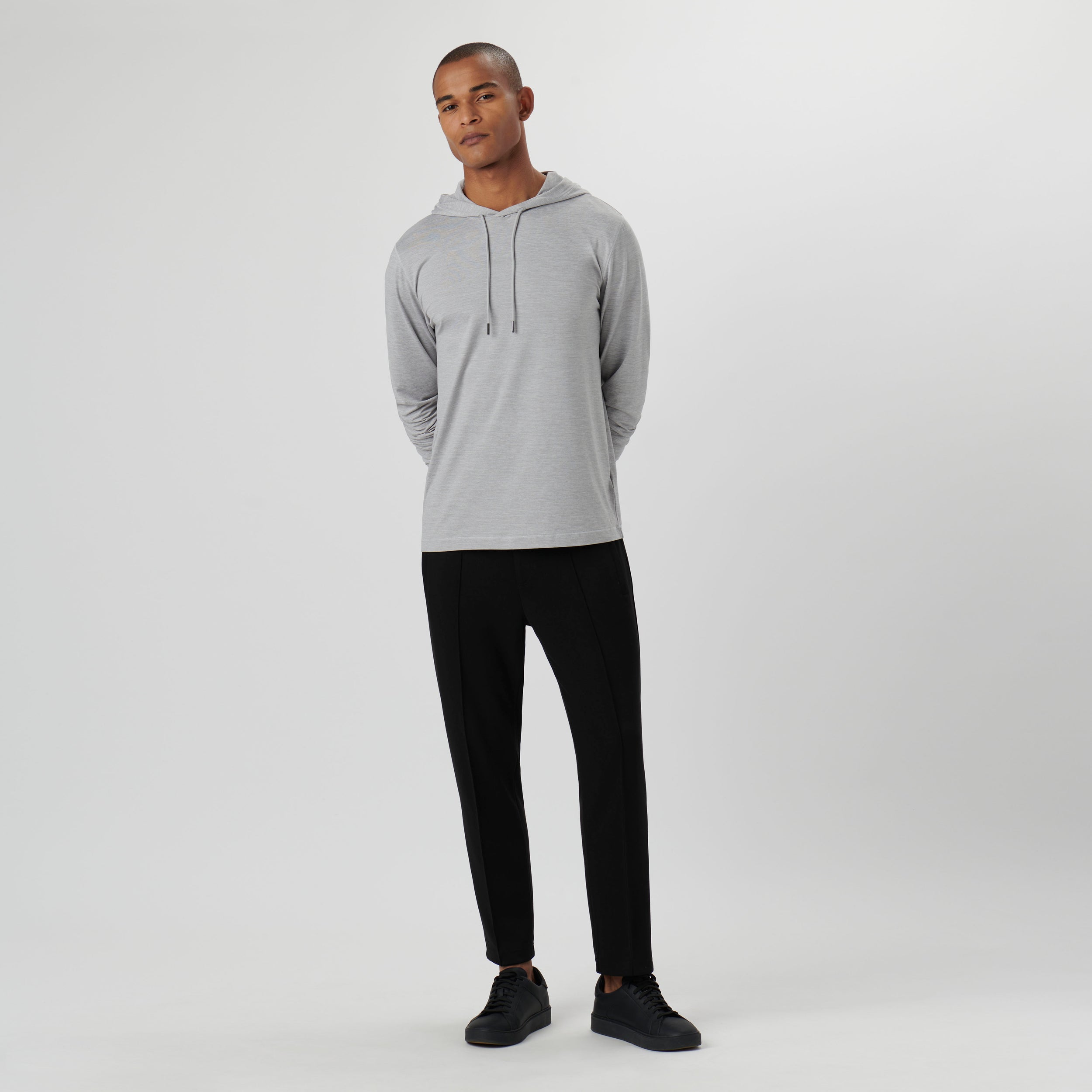 Long-sleeved hoodie in solid 4-way stretch performance fabric with adjustable drawstring hood and back pocket with invisible zipper. This garment protects against UV rays (UPF50+).
