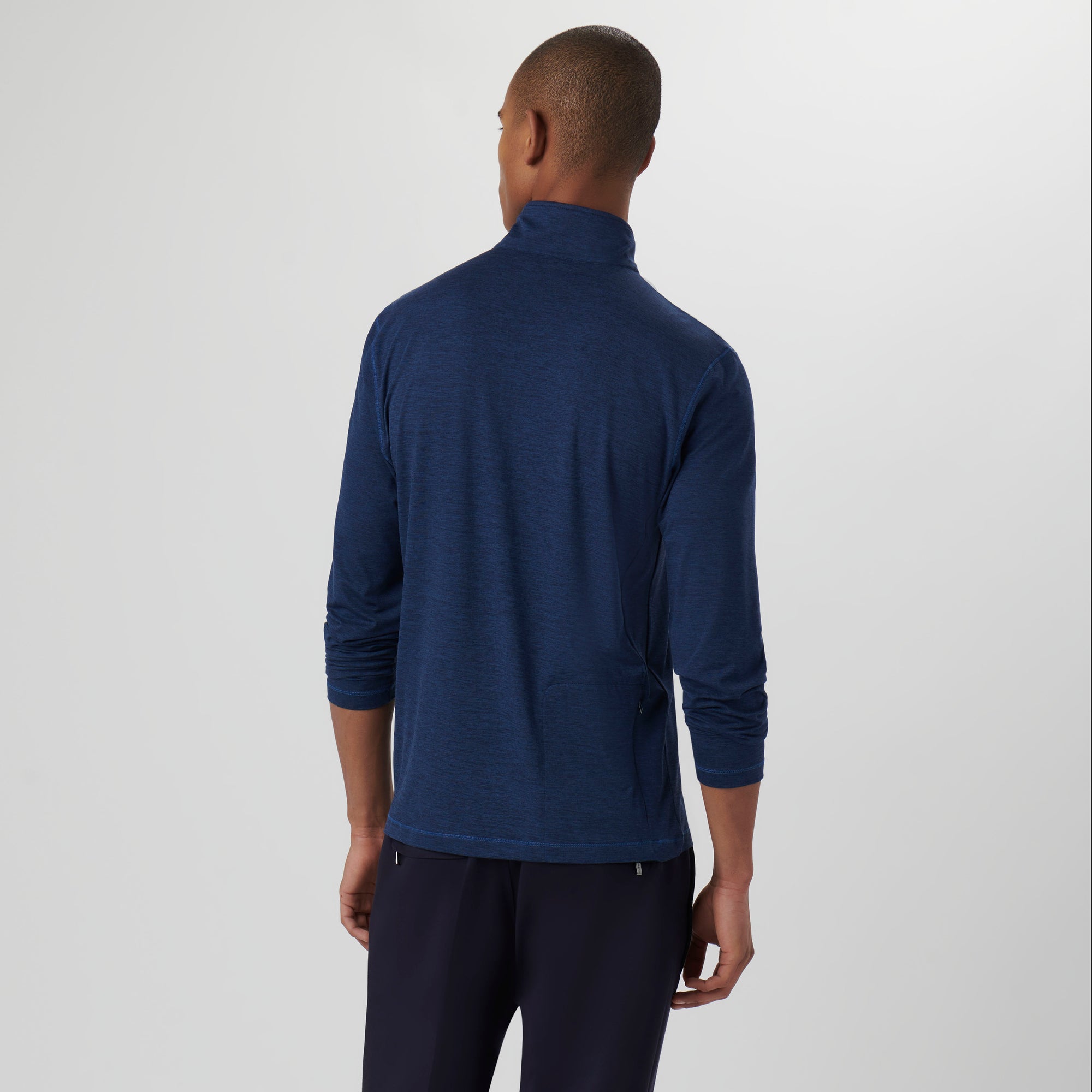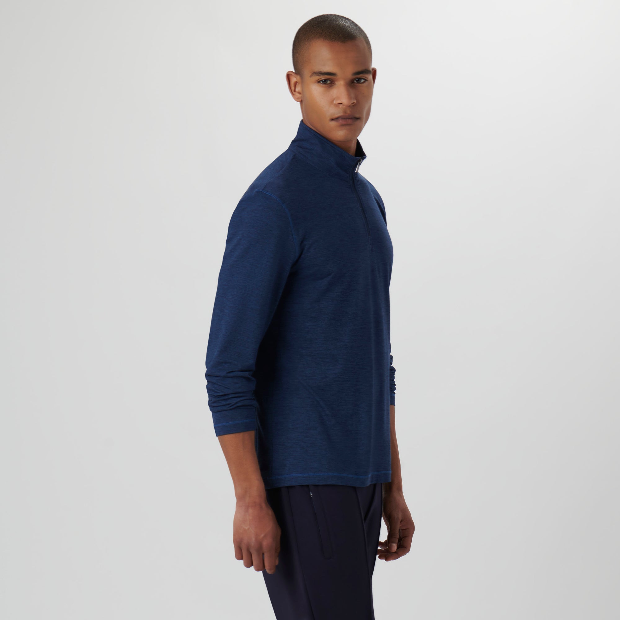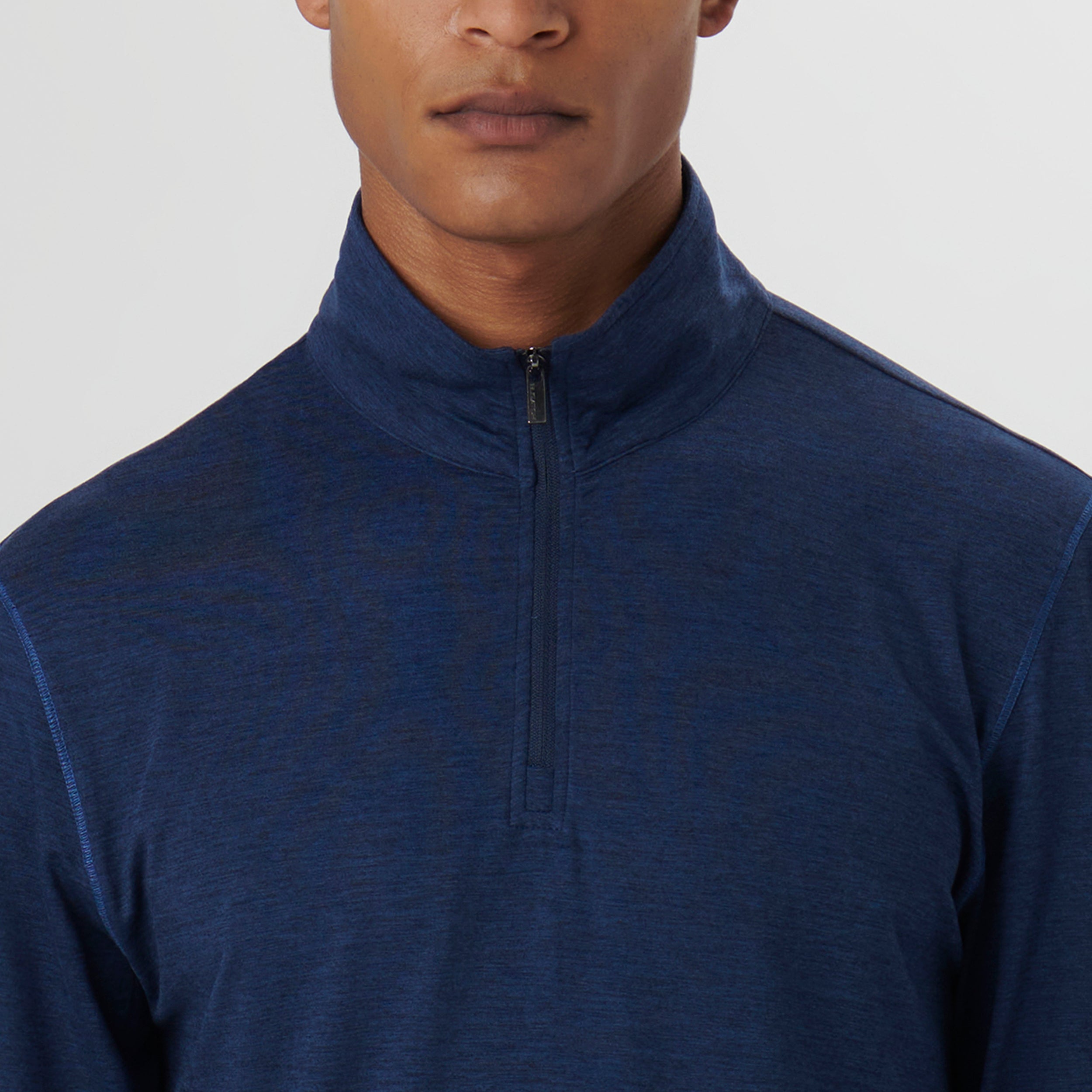 Long-sleeved pullover in solid 4-way stretch performance fabric with quarter zipper closure, self fabric collar and back pocket with invisible zipper. This garment protects against UV rays (UPF50+).