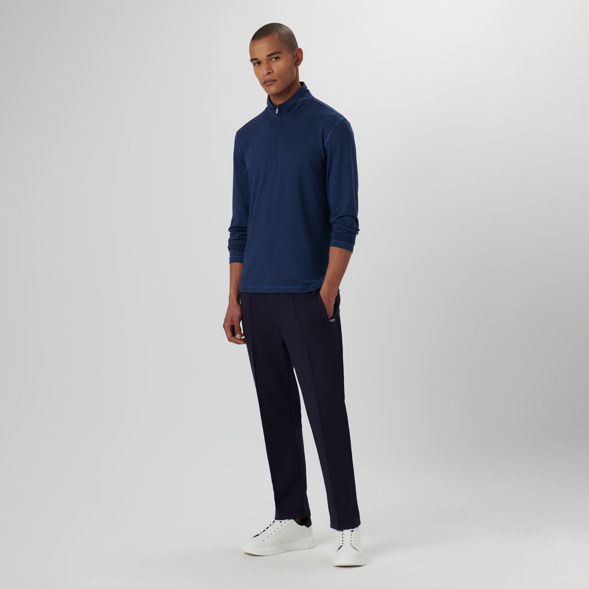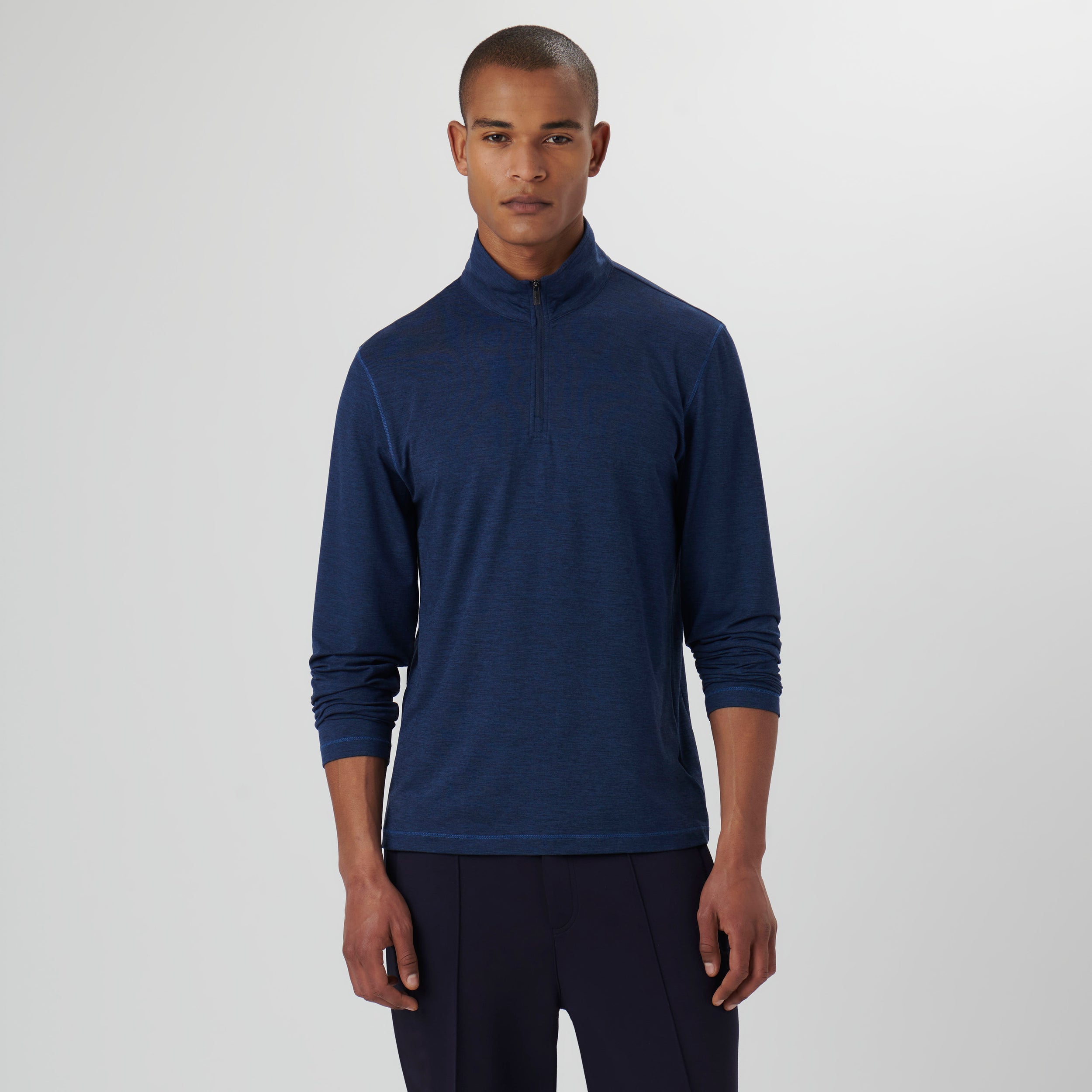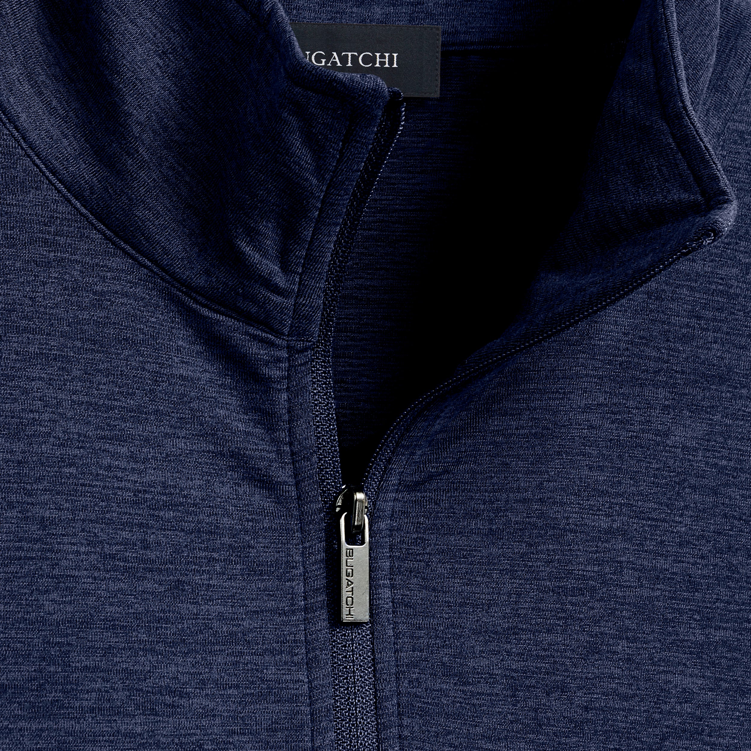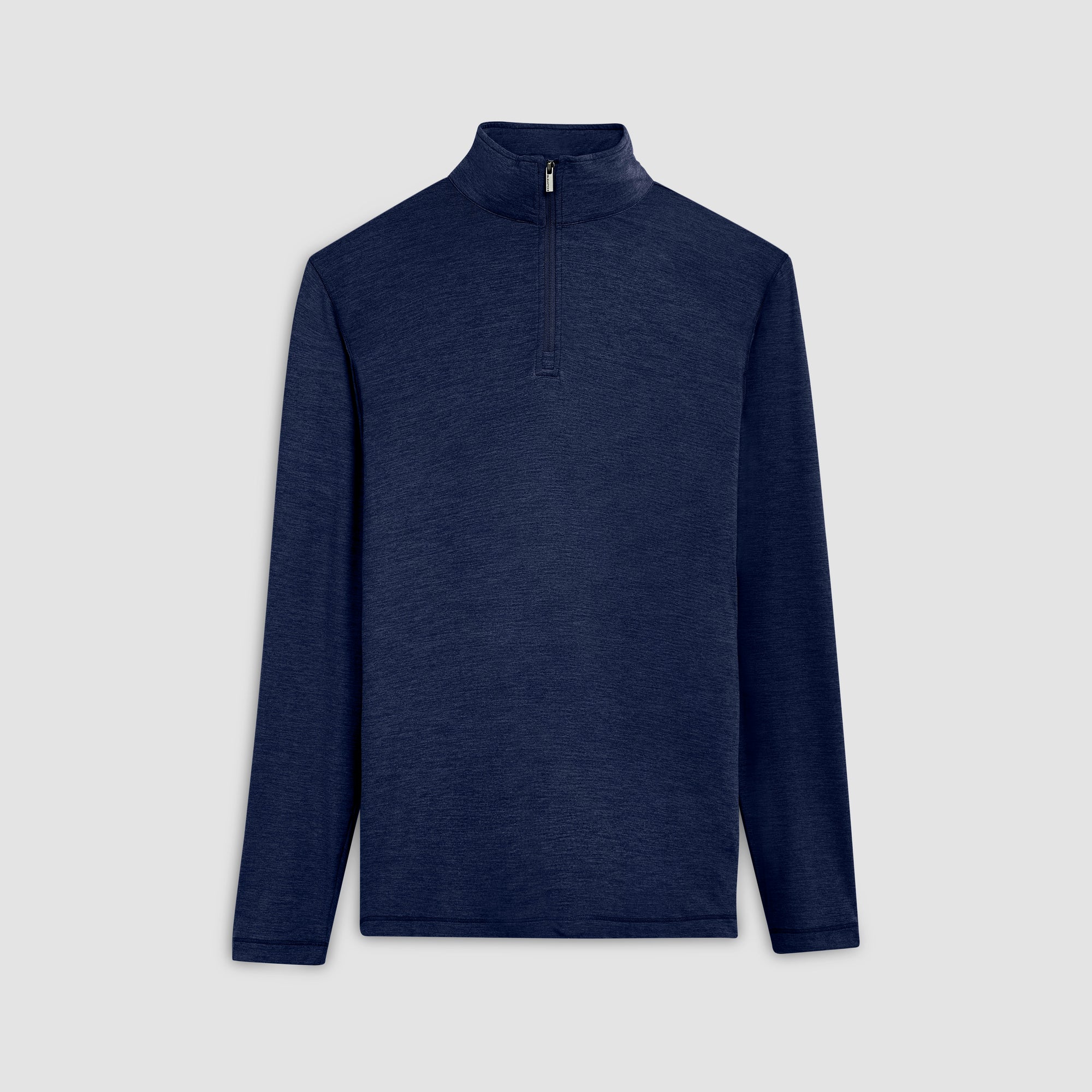 Long-sleeved pullover in solid 4-way stretch performance fabric with quarter zipper closure, self fabric collar and back pocket with invisible zipper. This garment protects against UV rays (UPF50+).