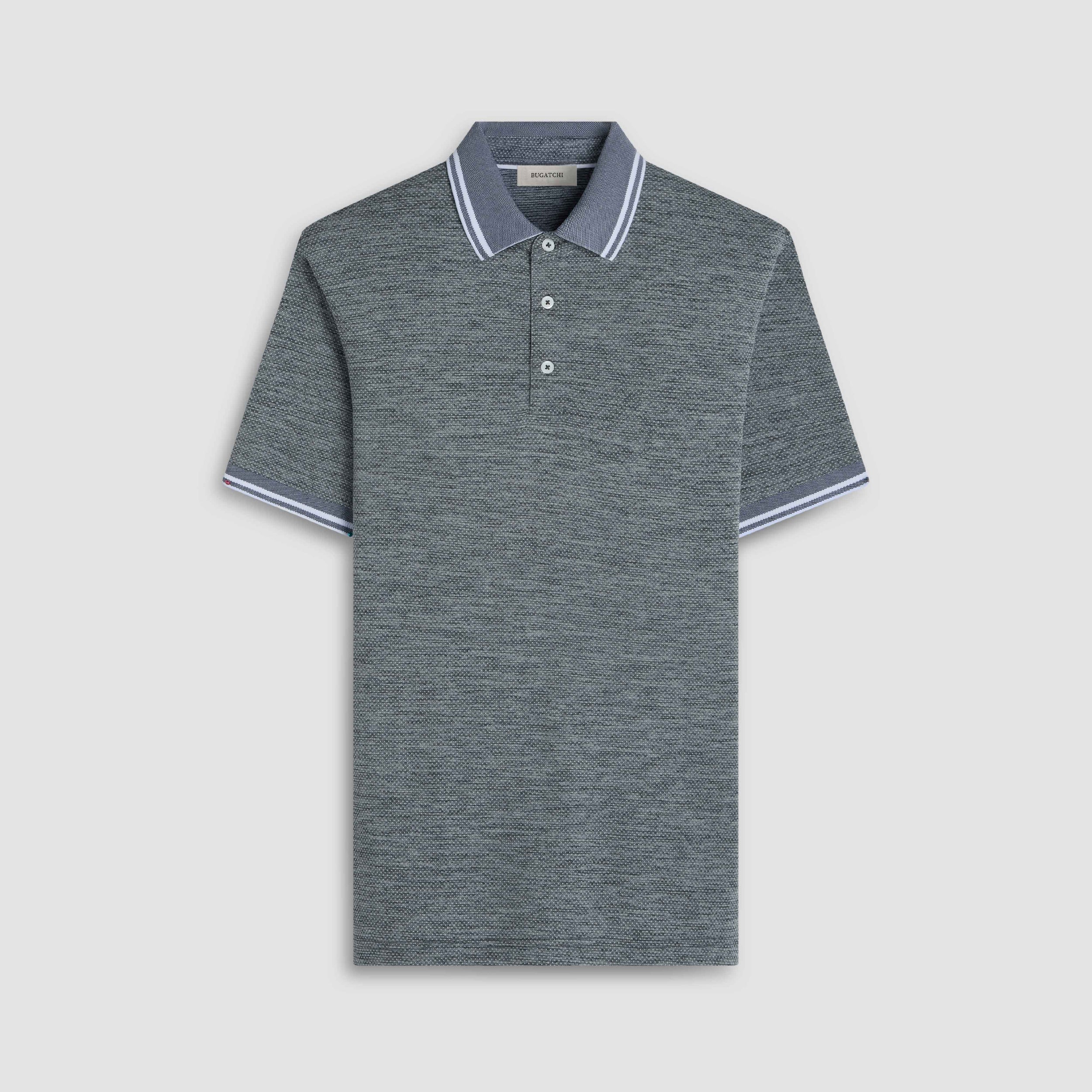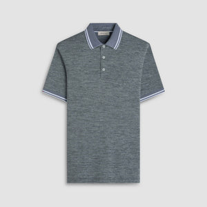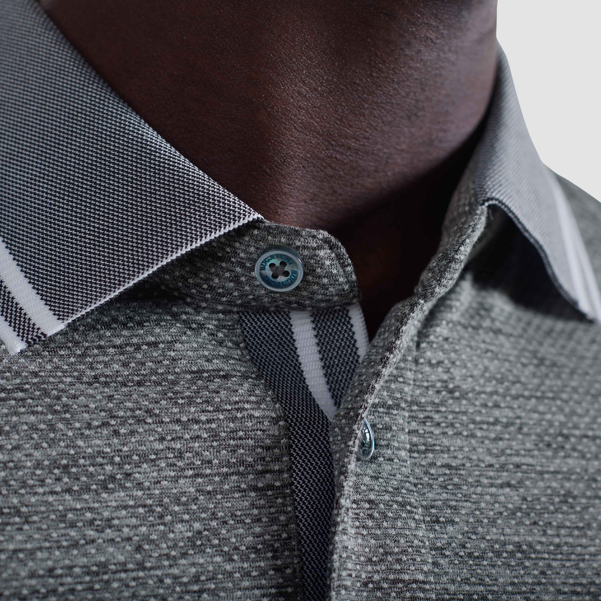 Stay cool and protected in this premium performance short sleeve polo featuring SPF 50+ sun protection and a refined melange micro-dot texture. Designed for laid-back weekends, resort days, and golf, it features mother-of-pearl buttons and a striking bird's eye rib collar and cuffs accented with double stripe detailing. Side vents enhance airflow, delivering both comfort and style.