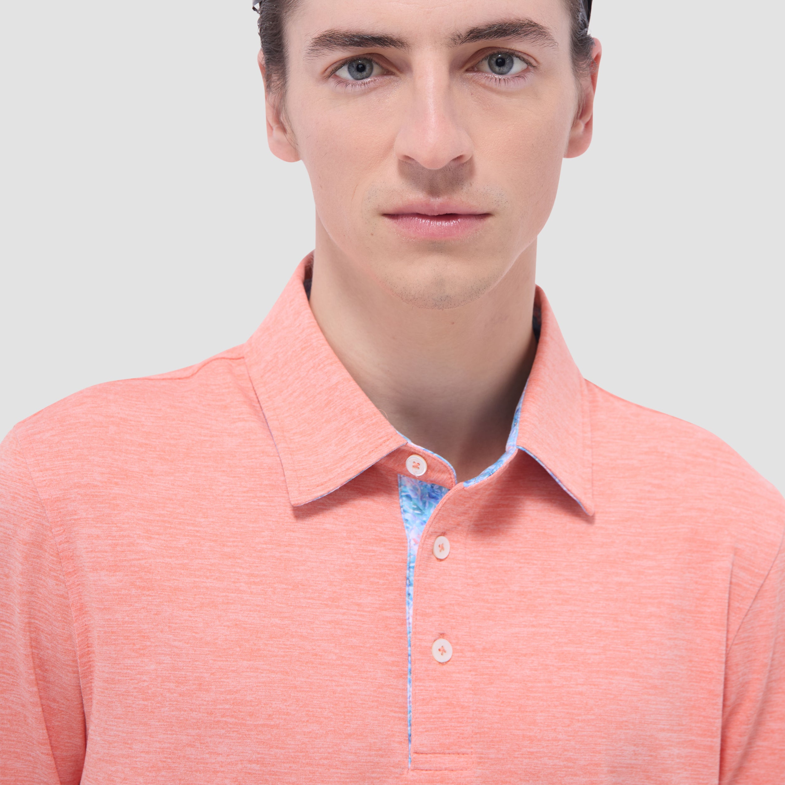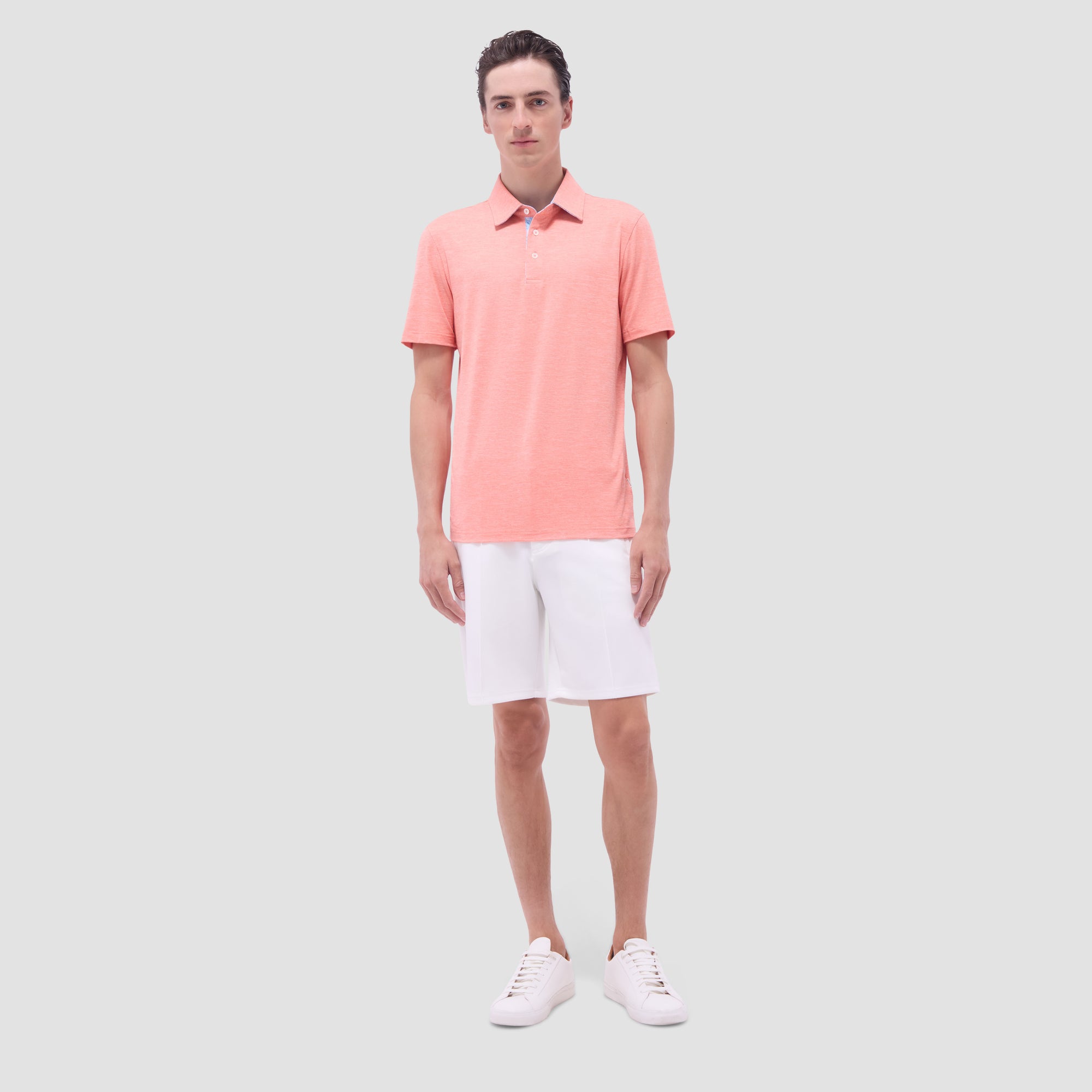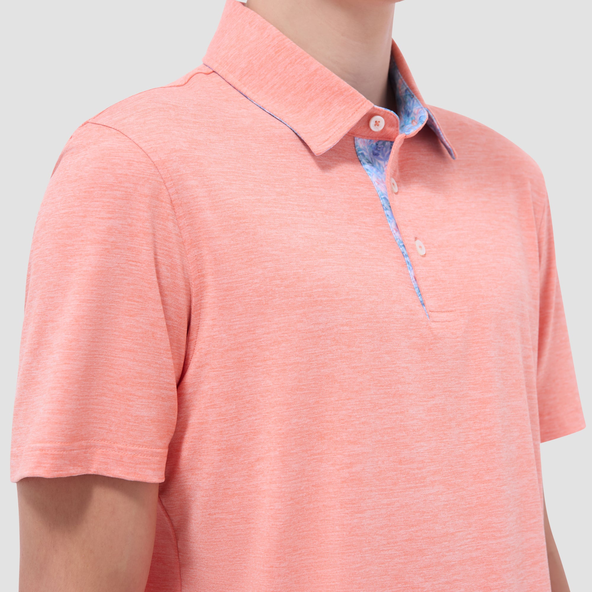 Enjoy incredible comfort and added sun protection with this short-sleeve polo shirt crafted from premium performance fabric with 4-way stretch and UPF50+ protection. It features a classic three-button placket, mother-of-pearl buttons, a self fabric collar, and is accented with a printed pattern. Always stay cool and protected on the golf course, boat, or at an outdoor gathering.
