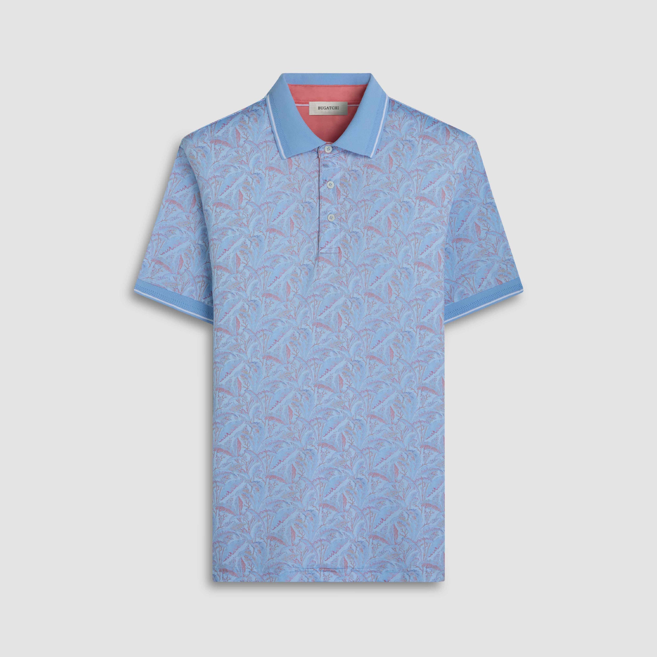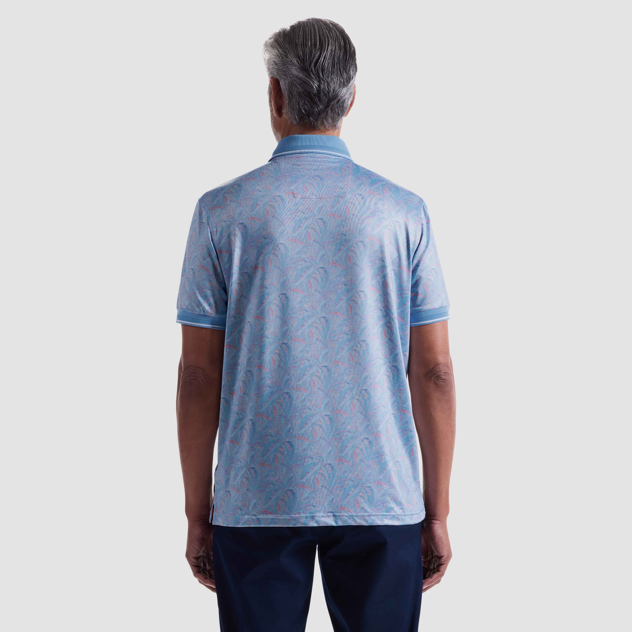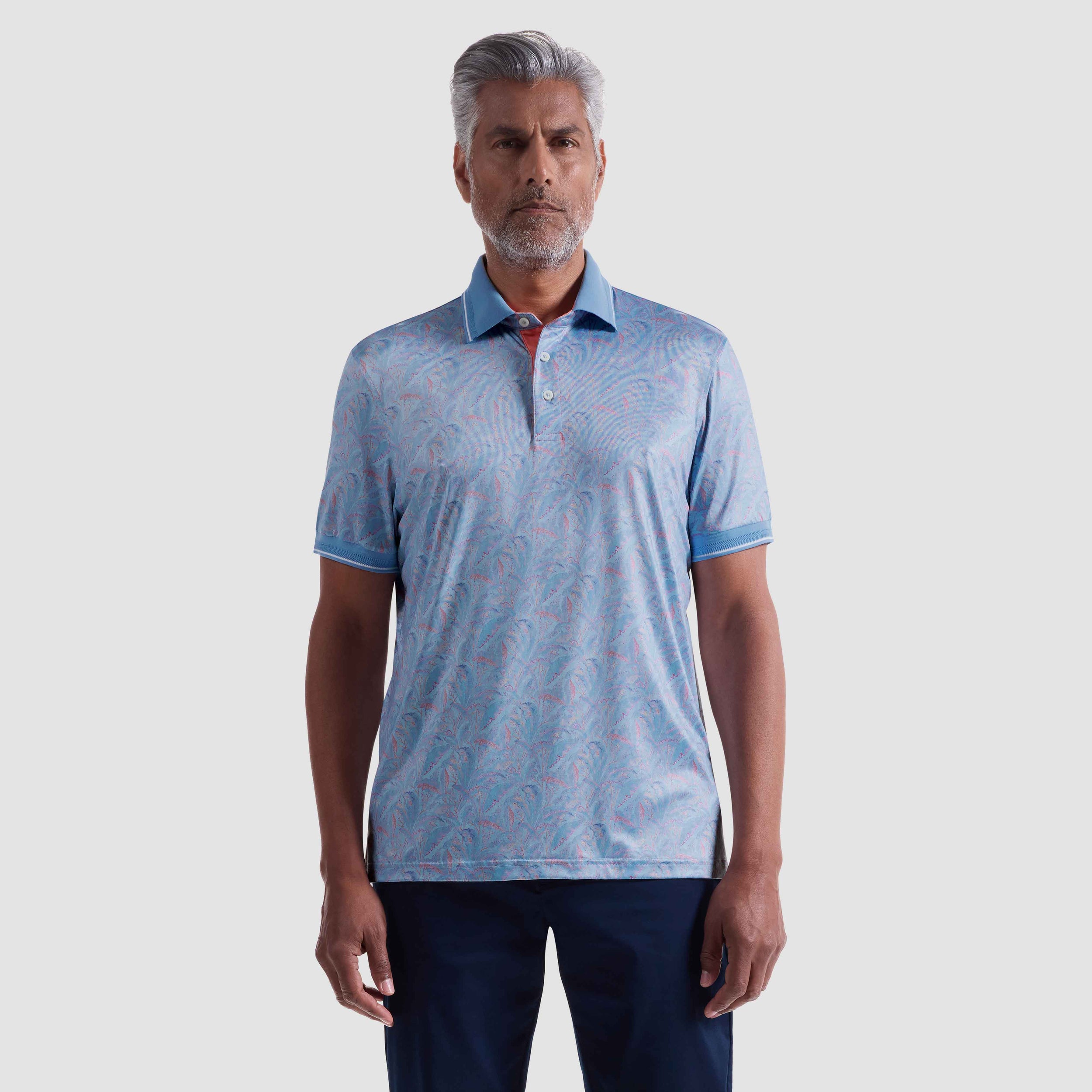 Crafted from a premium performance fabric with SPF 50+ sun protection, this short sleeve polo features a leaf print and a three-button closure. The solid rib collar and cuffs are accented with herringbone stitch and contrast stripe detailing, while the solid inner yoke, mother-of-pearl buttons and side vents complete the design. Ideal for golf, resort days, and laid-back weekends.