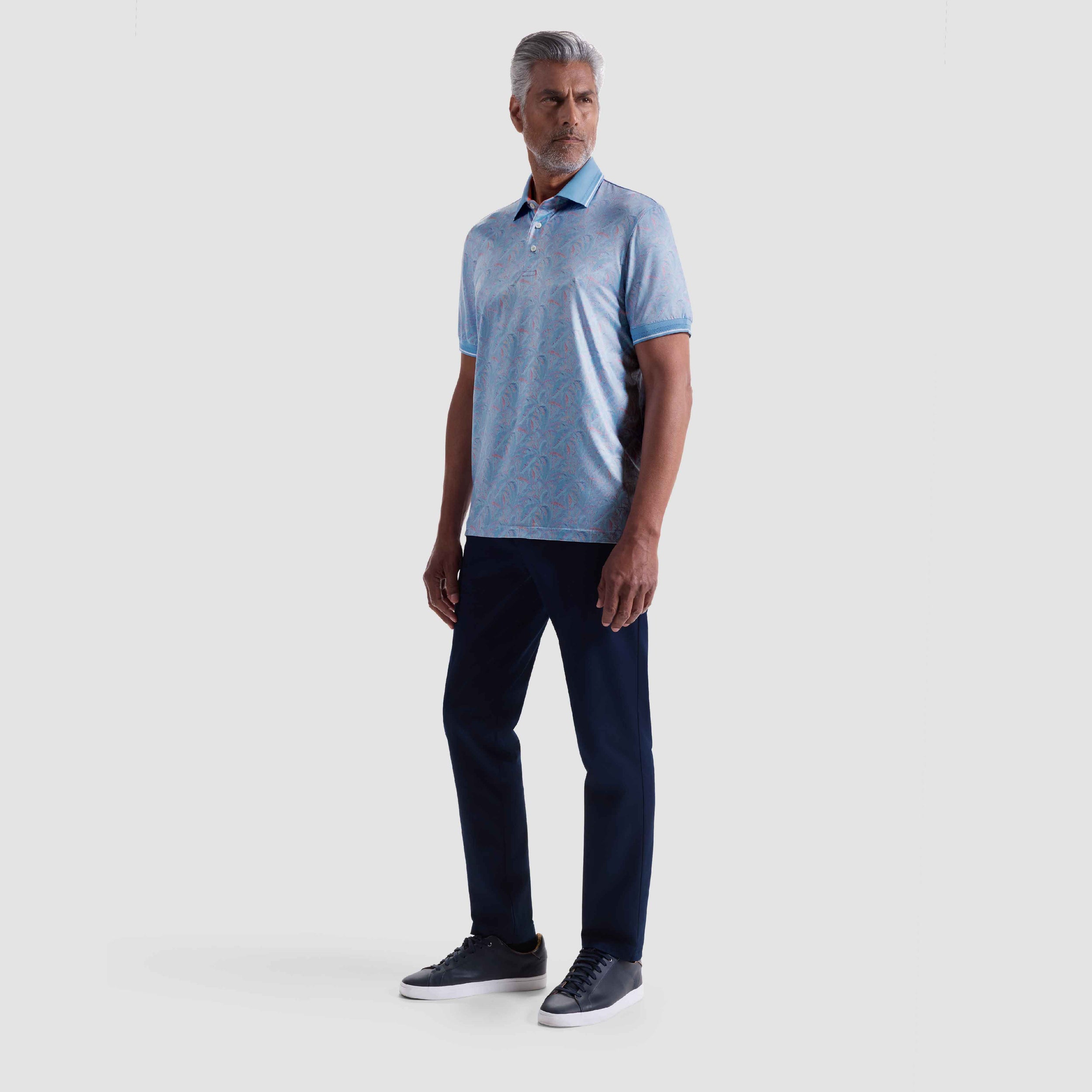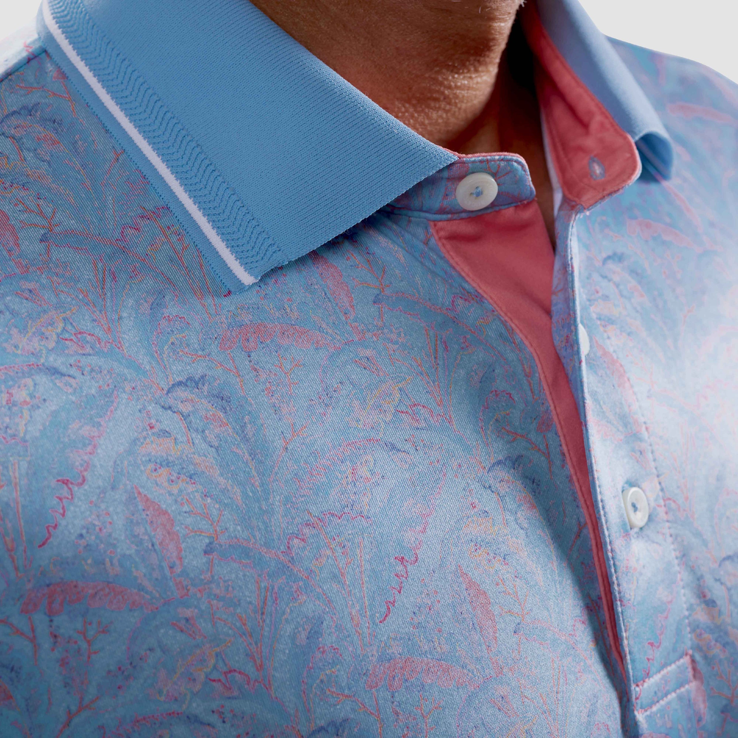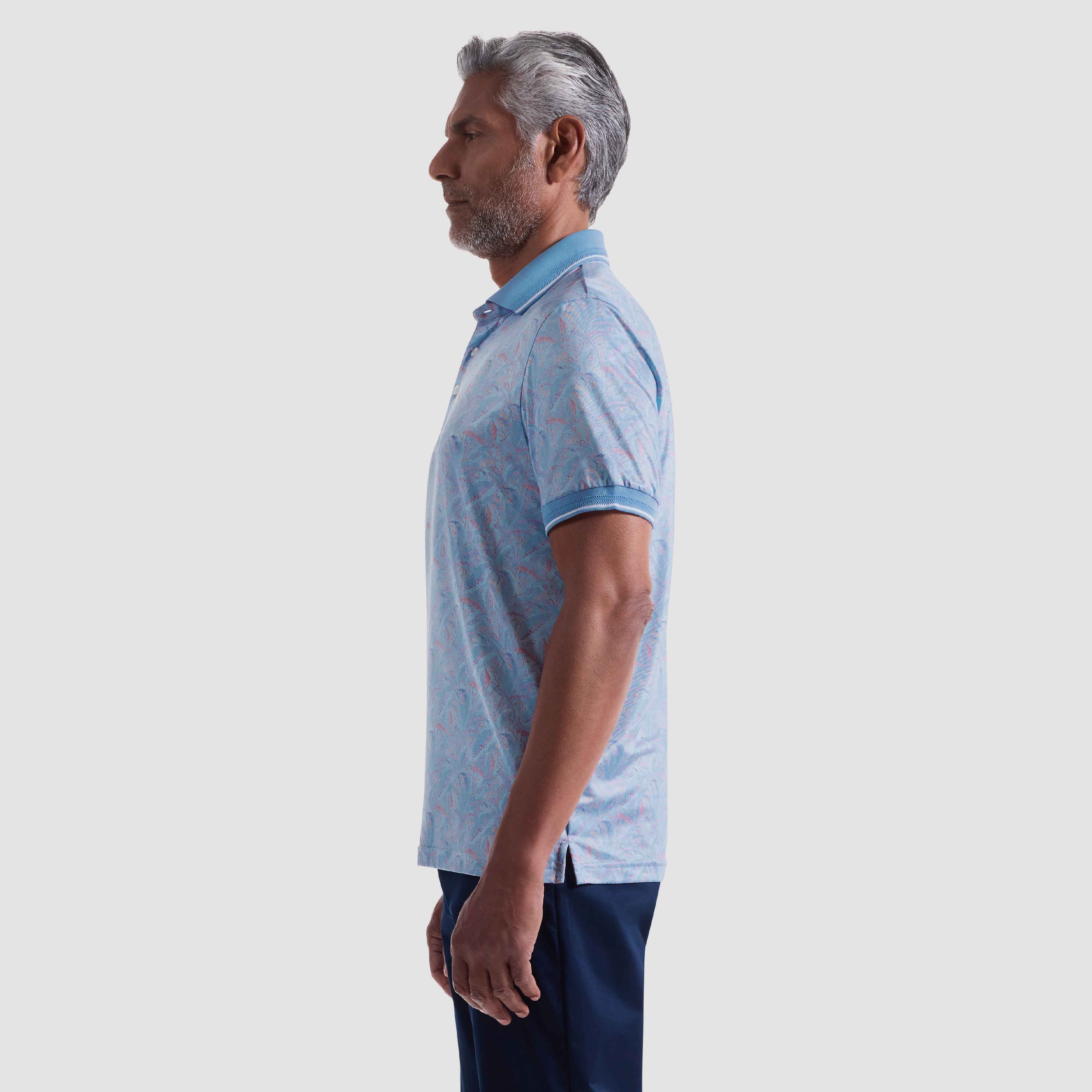 Crafted from a premium performance fabric with SPF 50+ sun protection, this short sleeve polo features a leaf print and a three-button closure. The solid rib collar and cuffs are accented with herringbone stitch and contrast stripe detailing, while the solid inner yoke, mother-of-pearl buttons and side vents complete the design. Ideal for golf, resort days, and laid-back weekends.