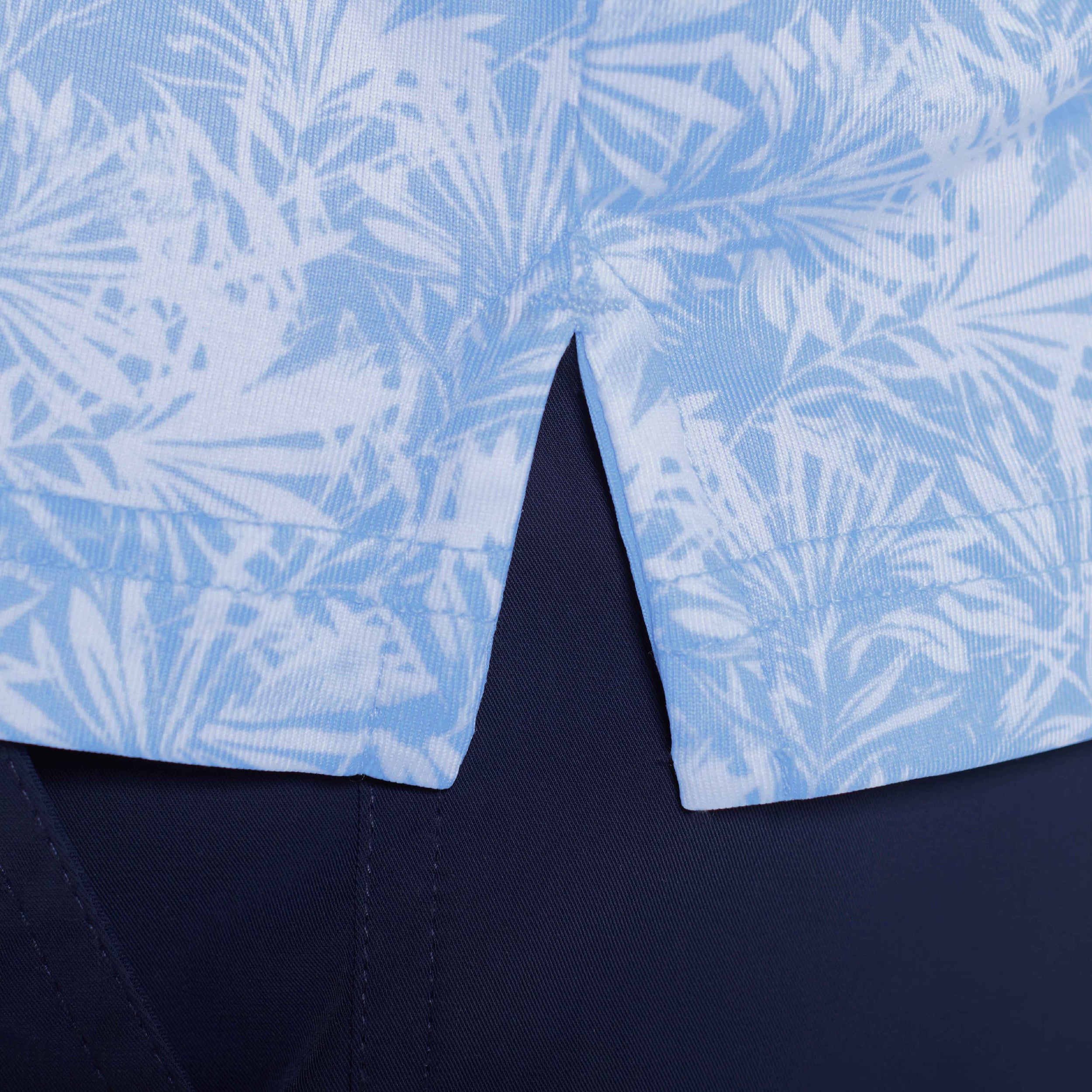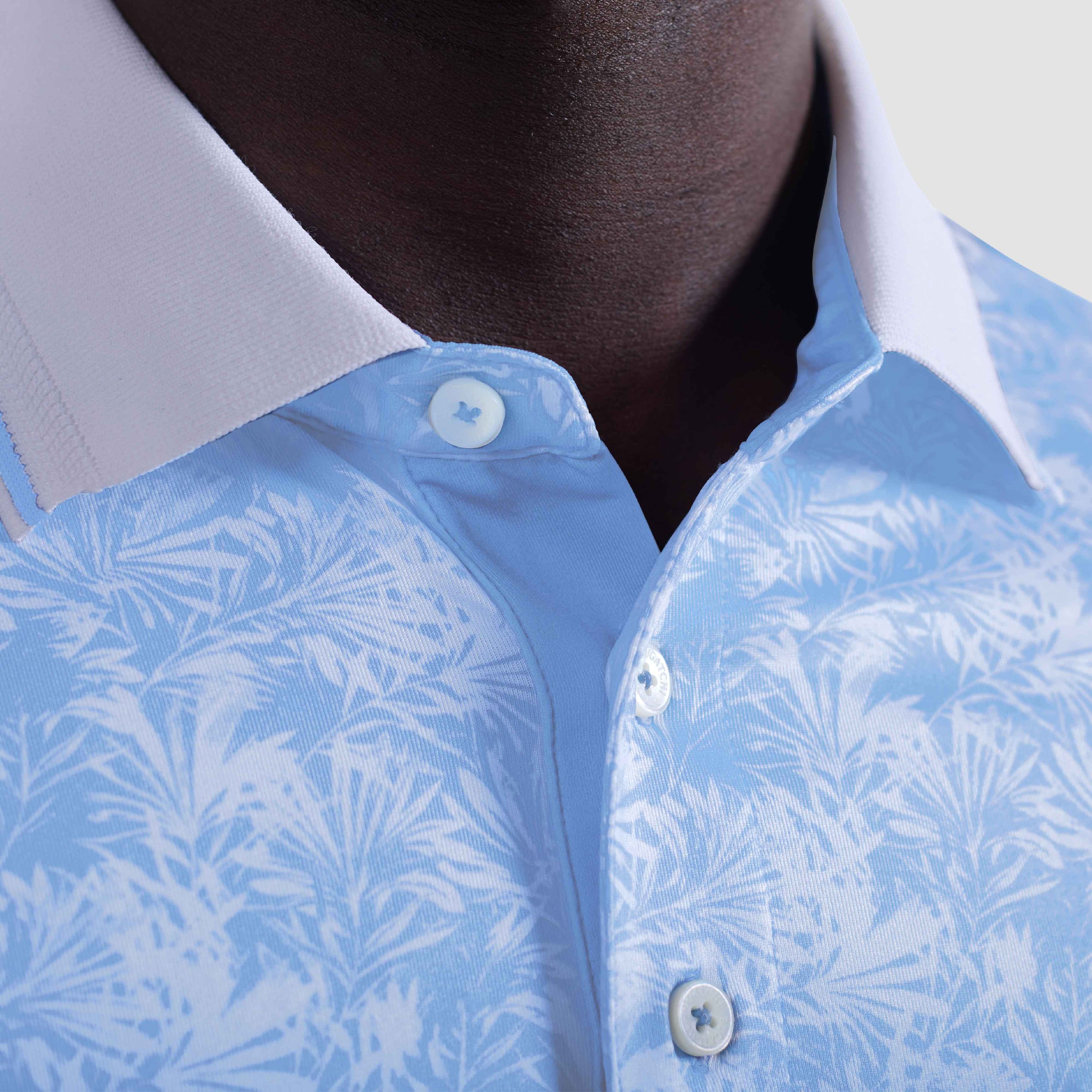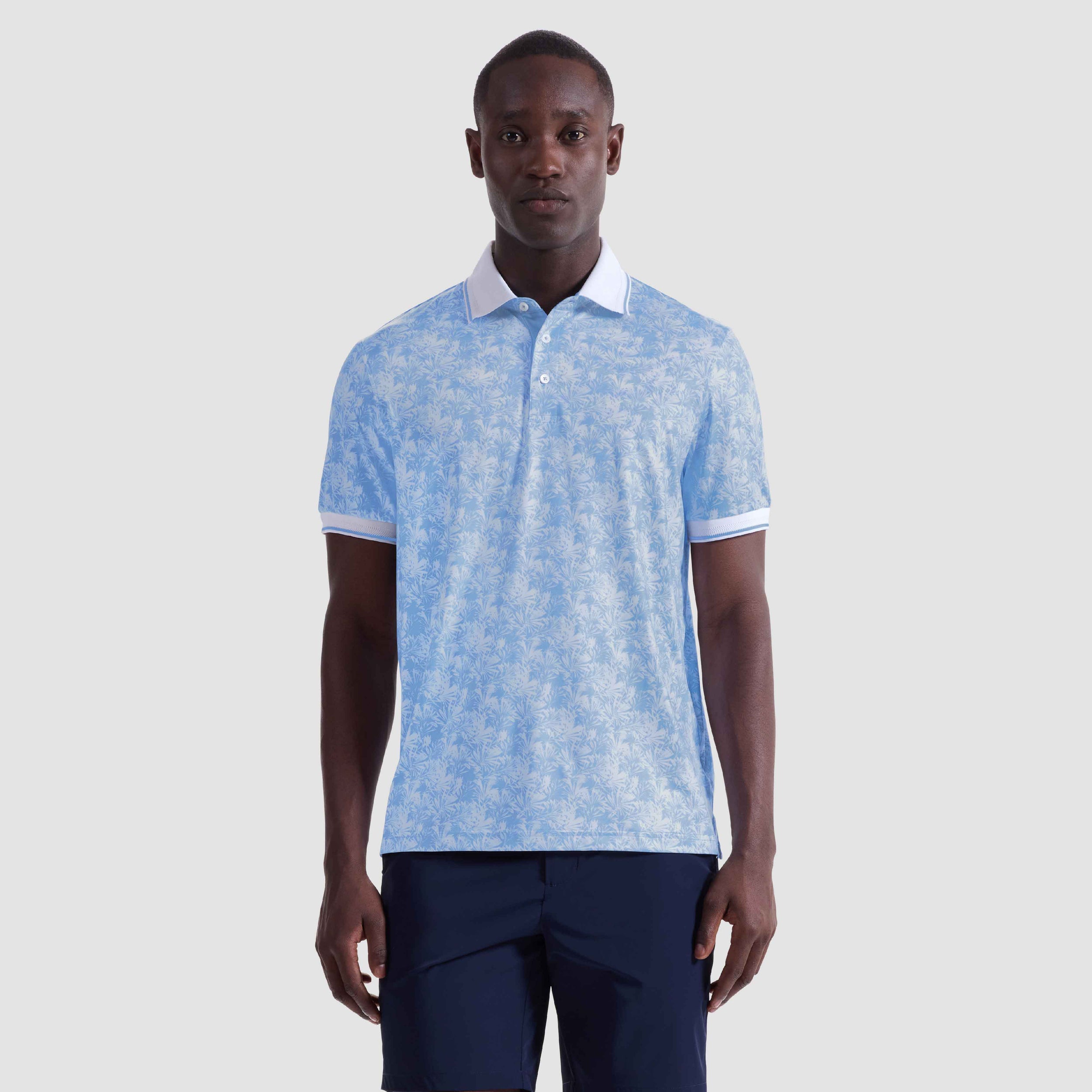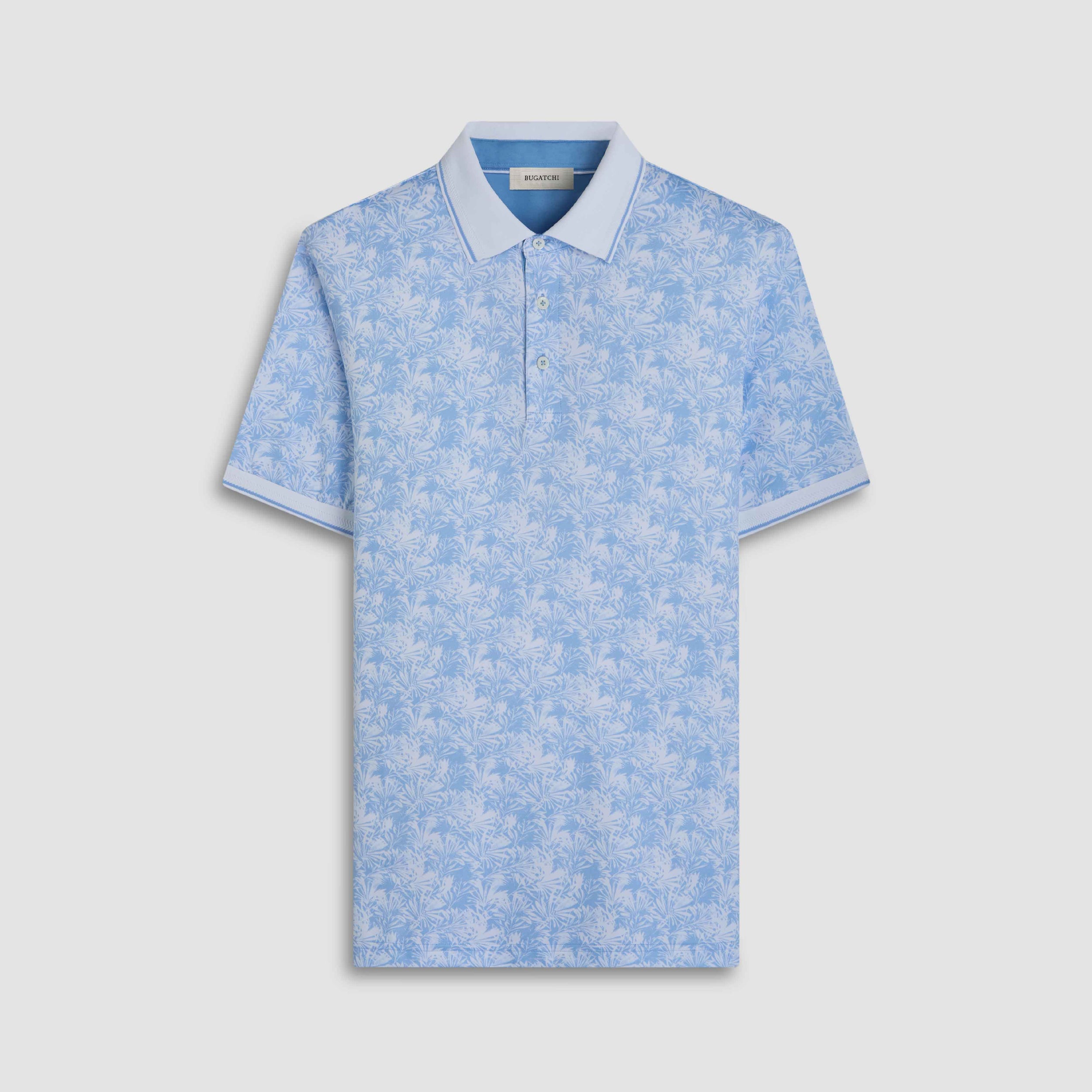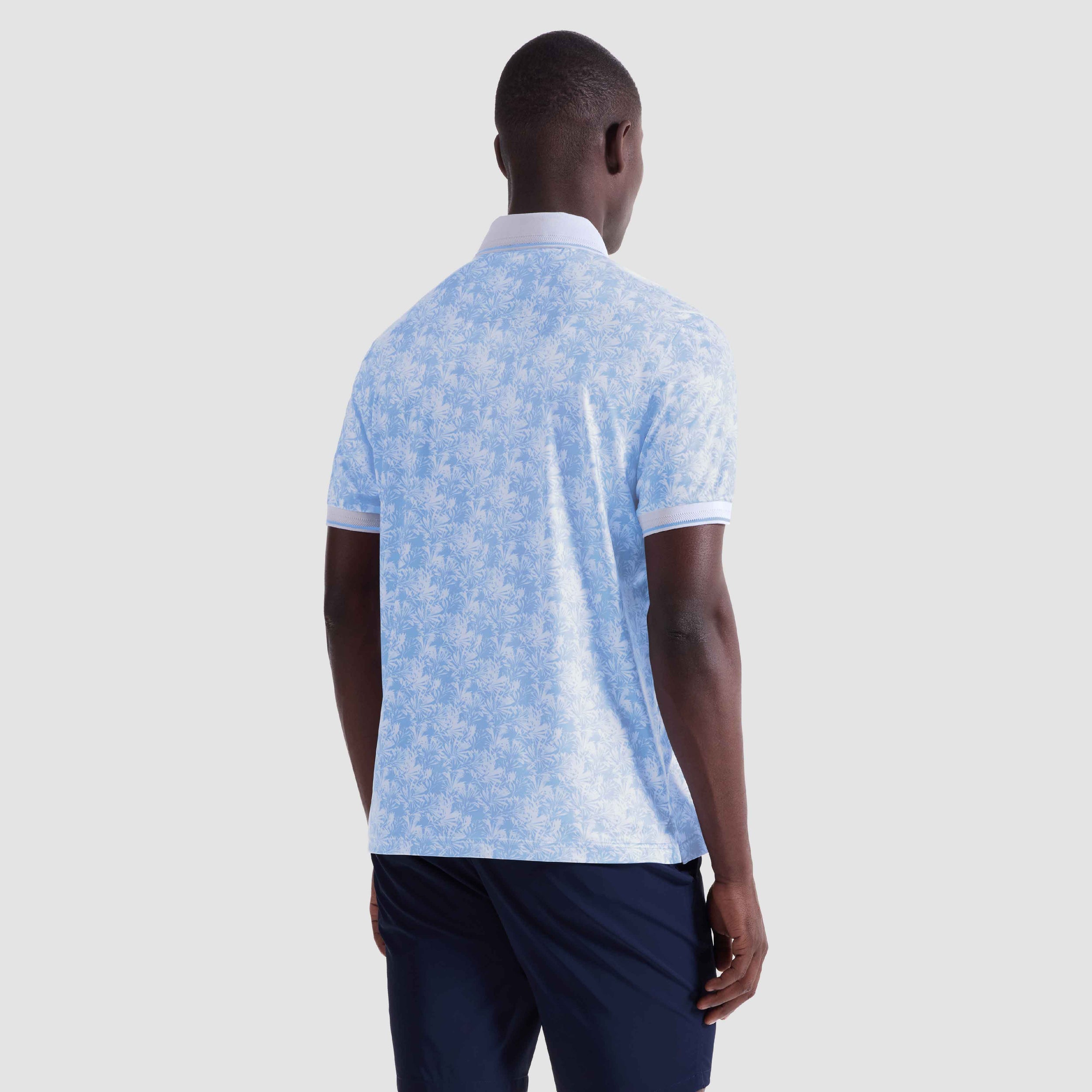 Crafted from a premium performance fabric with SPF 50+ sun protection, this short sleeve polo features a leaf print and a three-button closure. The solid rib collar and cuffs are accented with herringbone stitch and contrast stripe detailing, while the solid inner yoke, mother-of-pearl buttons and side vents complete the design. Ideal for golf, resort days, and laid-back weekends.