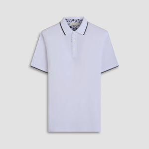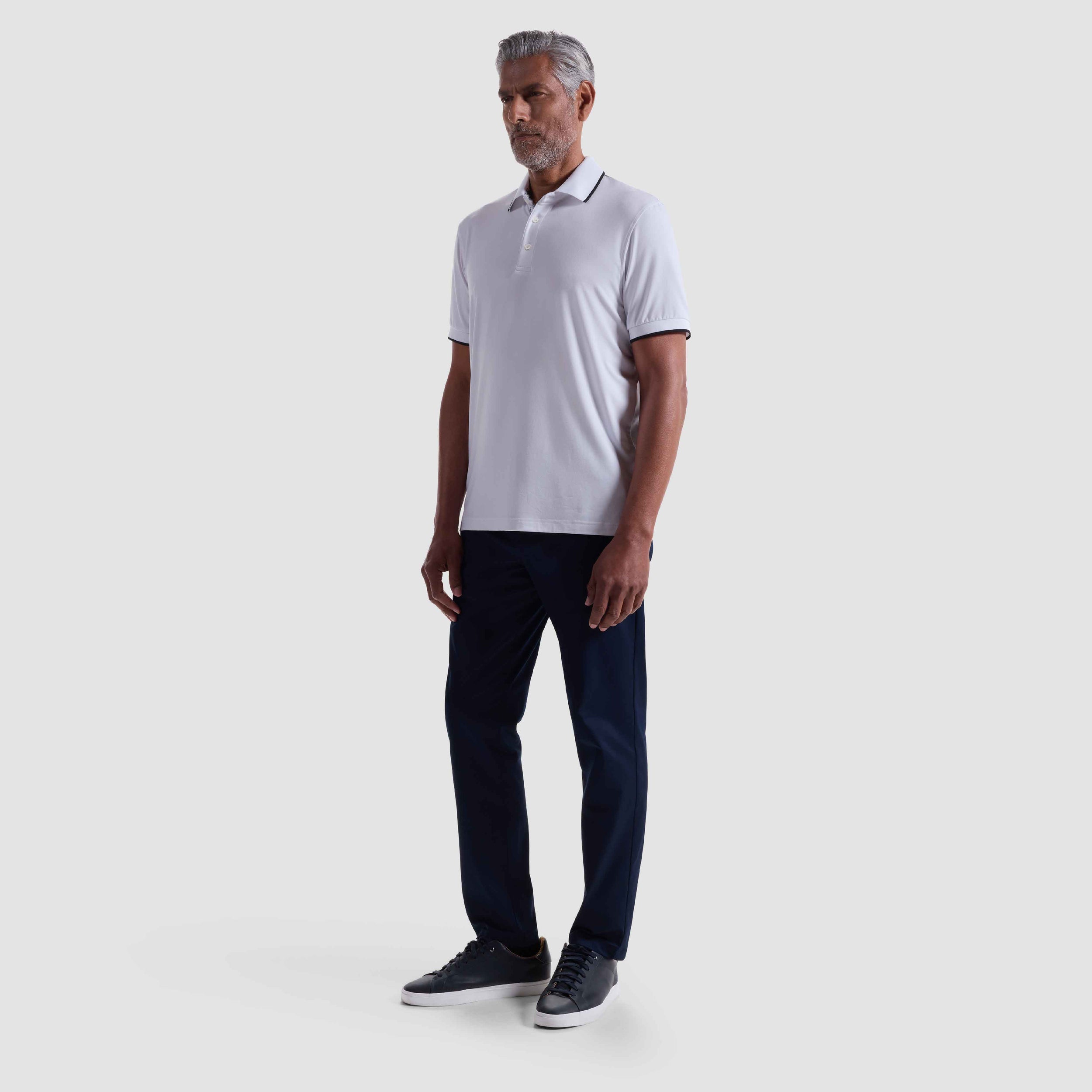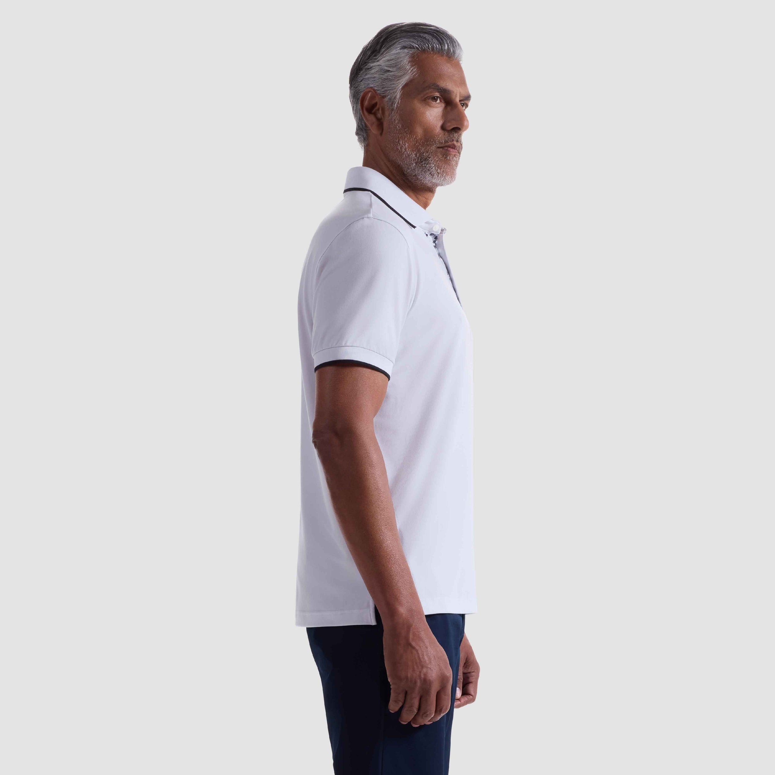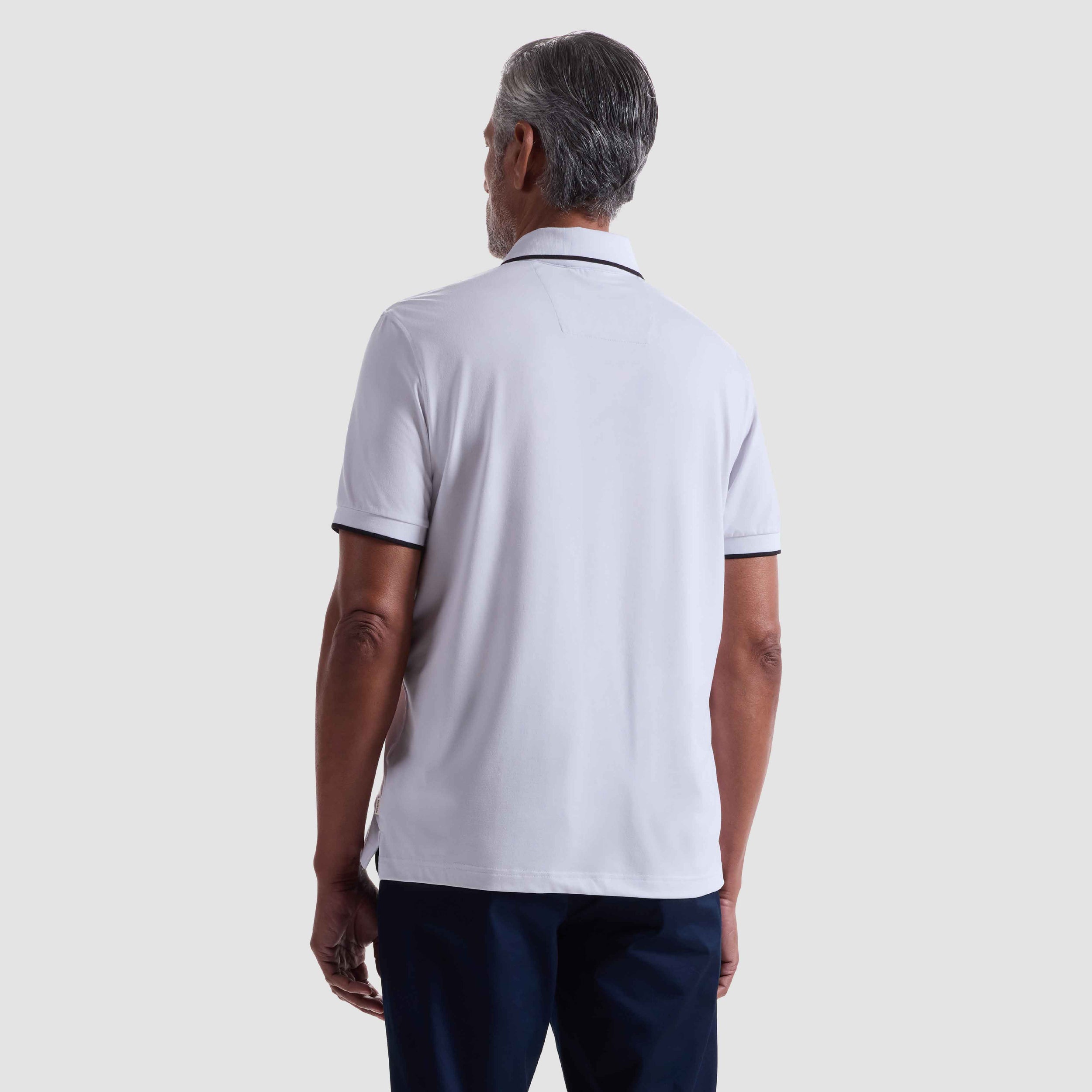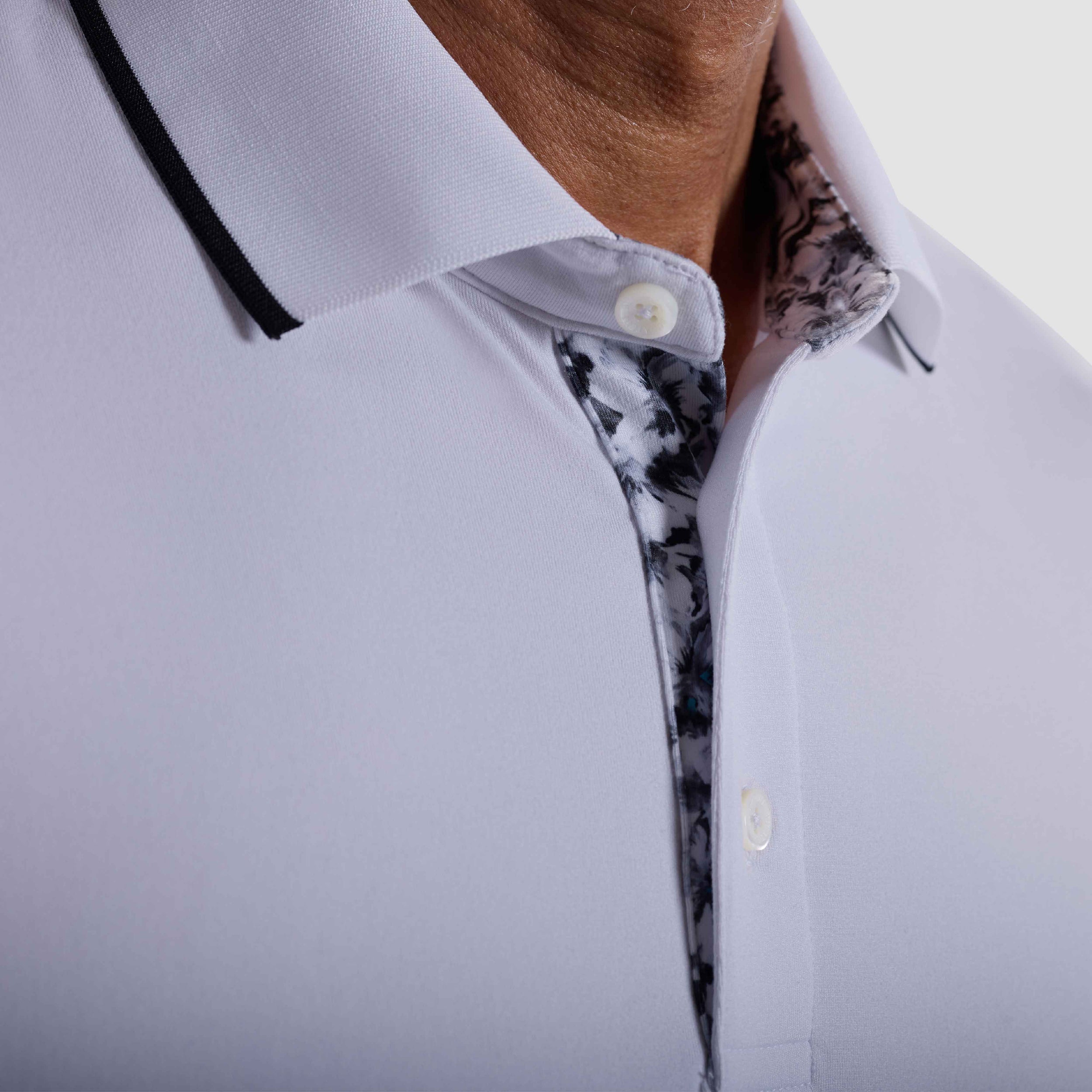 Crafted from a premium performance fabric with SPF 50+ sun protection, this short sleeve polo is designed for mobility and comfort. The melange pattern is accented with a printed contrast pattern inside the placket and yoke. Featuring mother-of-pearl buttons and elasticized solid rib collar and cuffs with tipping detail, it offers a polished, sporty look. Side vents provide added breathability, making it ideal for golf, resort days, and laid-back weekends.