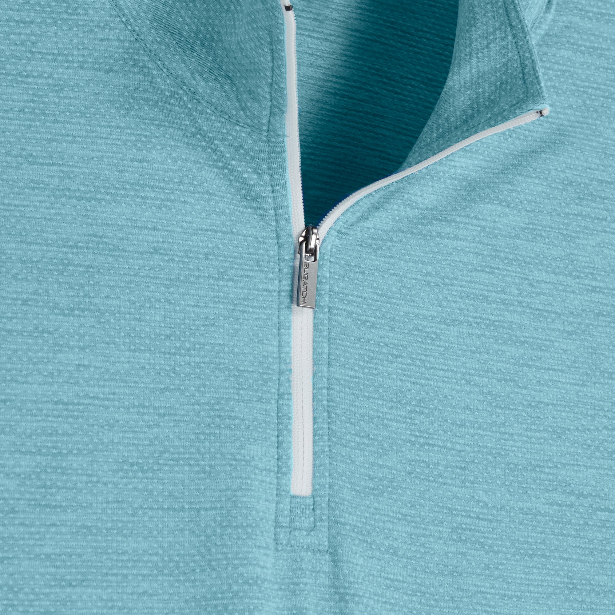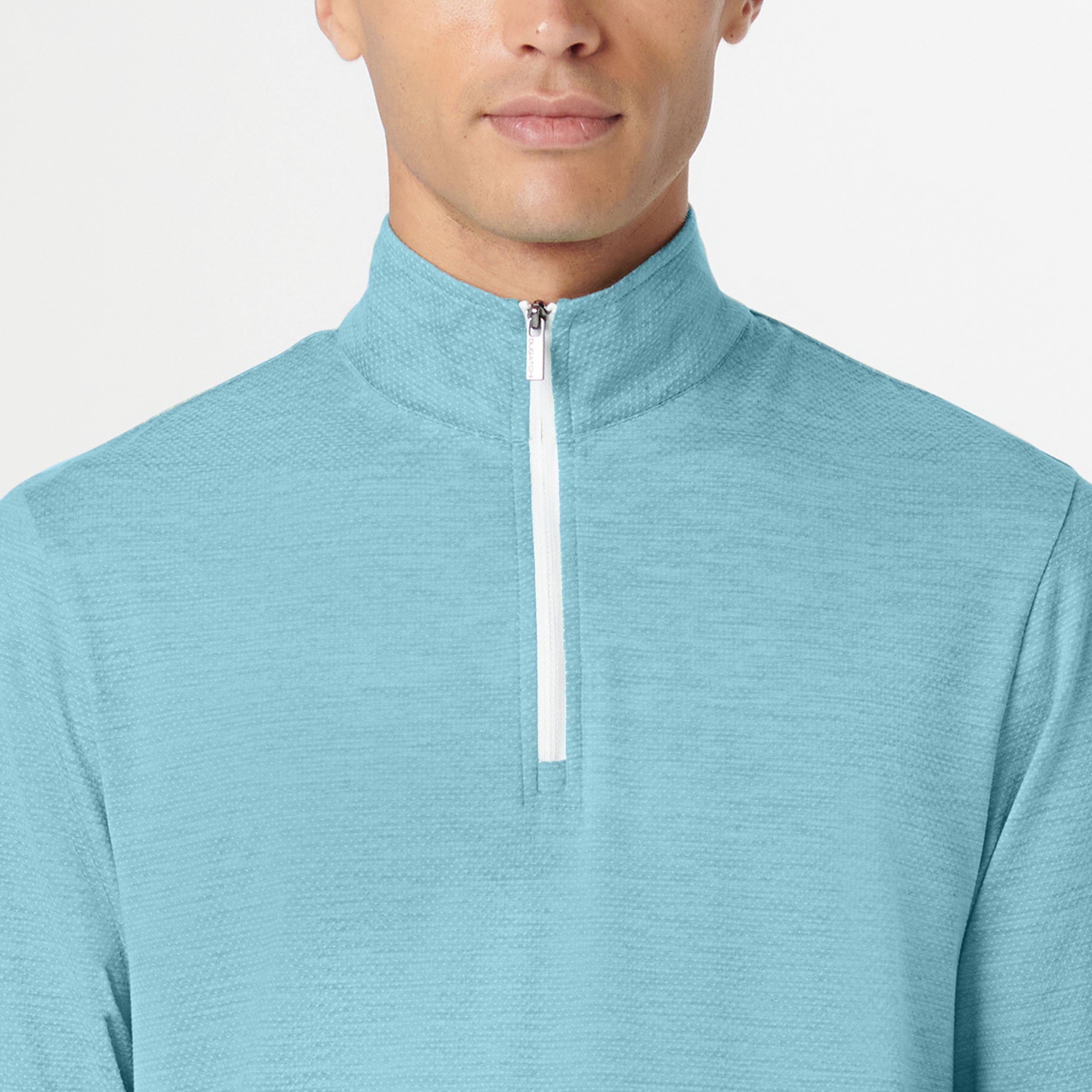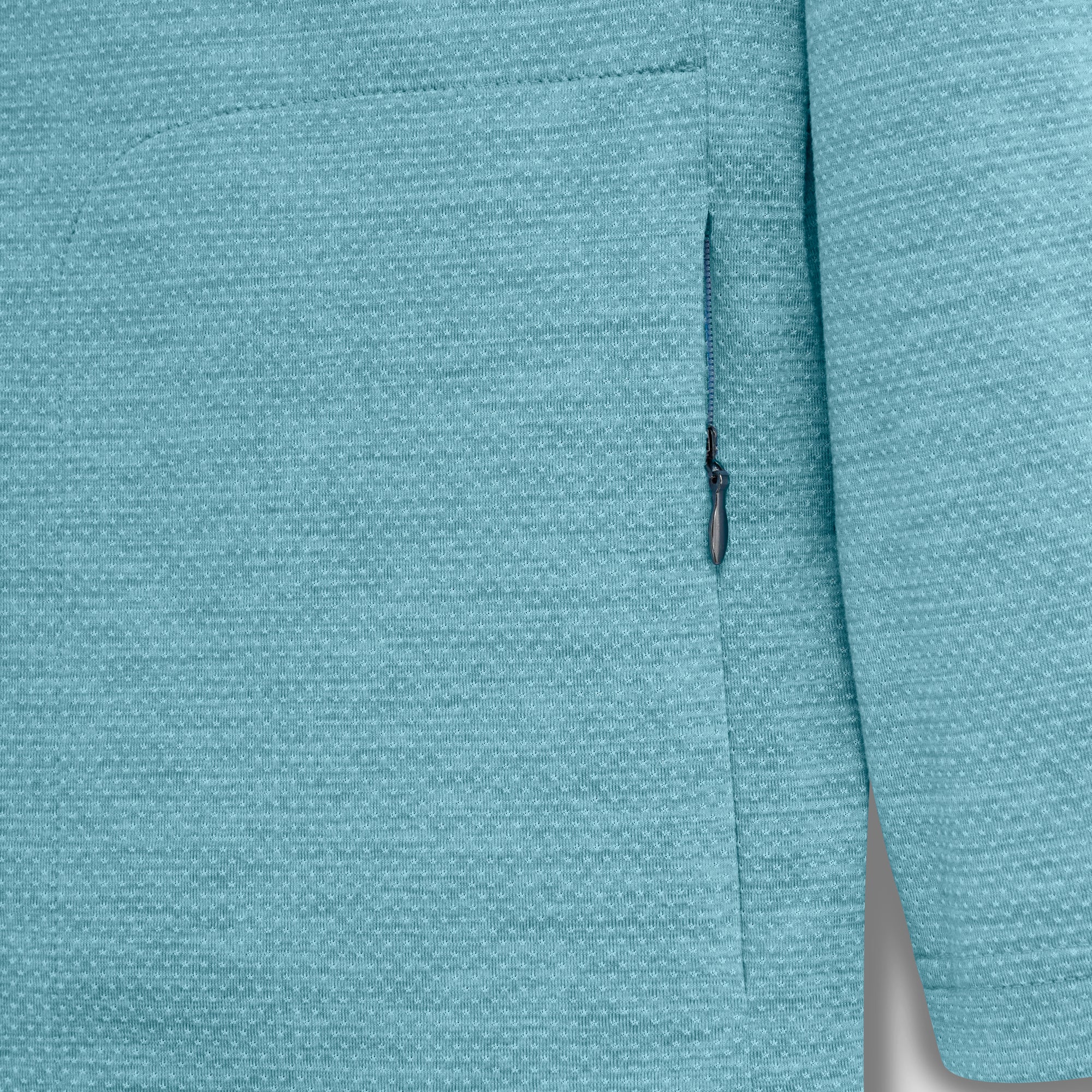 This performance quarter zip pullover in a stylish speckled heather pattern features a mock neck. Beyond style, this garment offers UV50 SPF protection, making it perfect for outdoor activities.