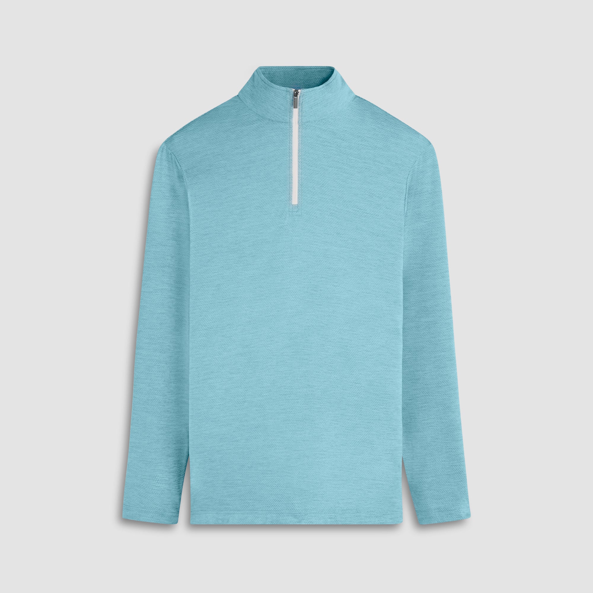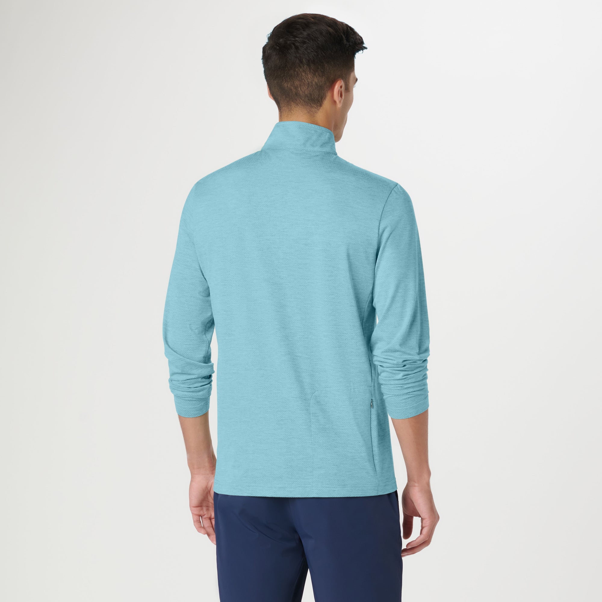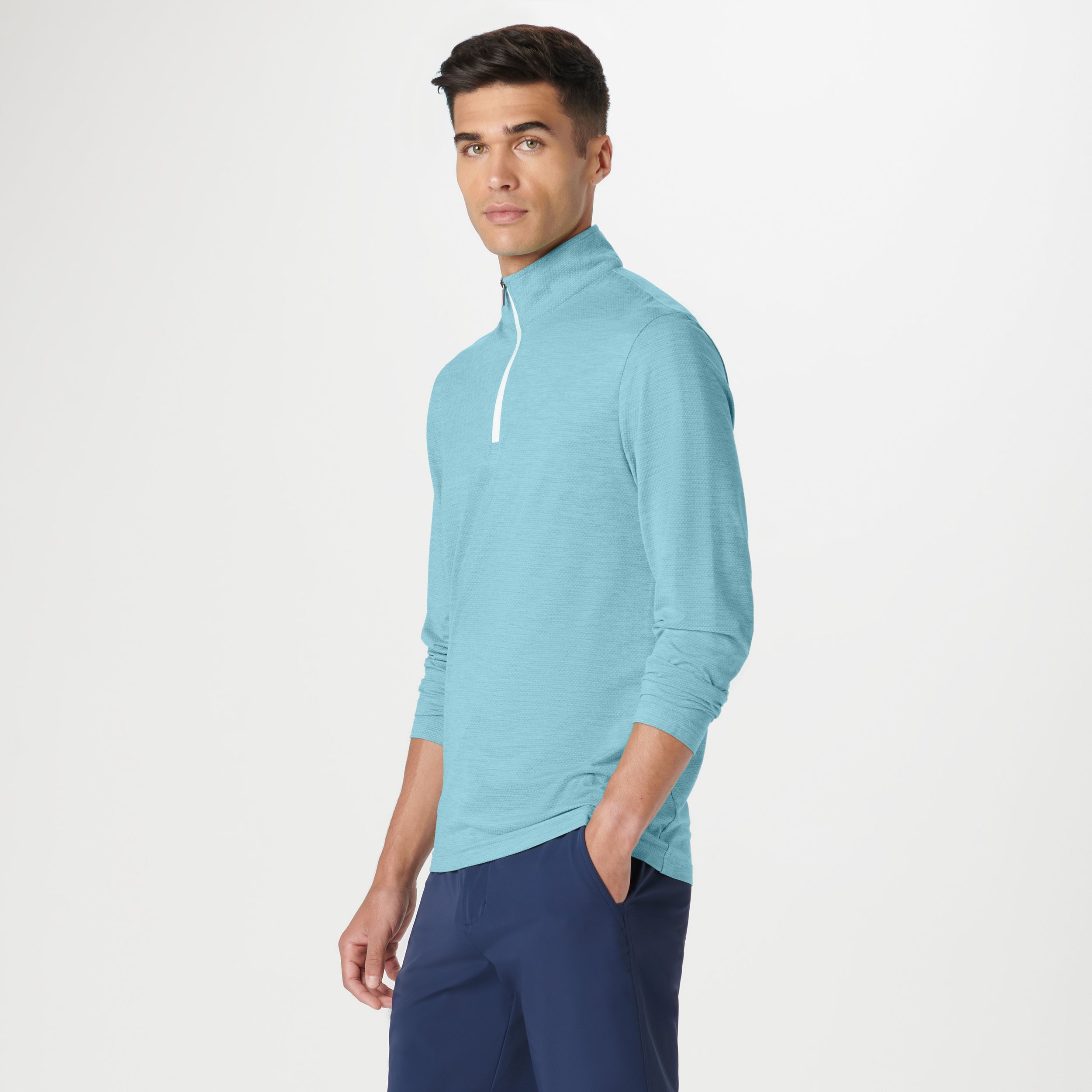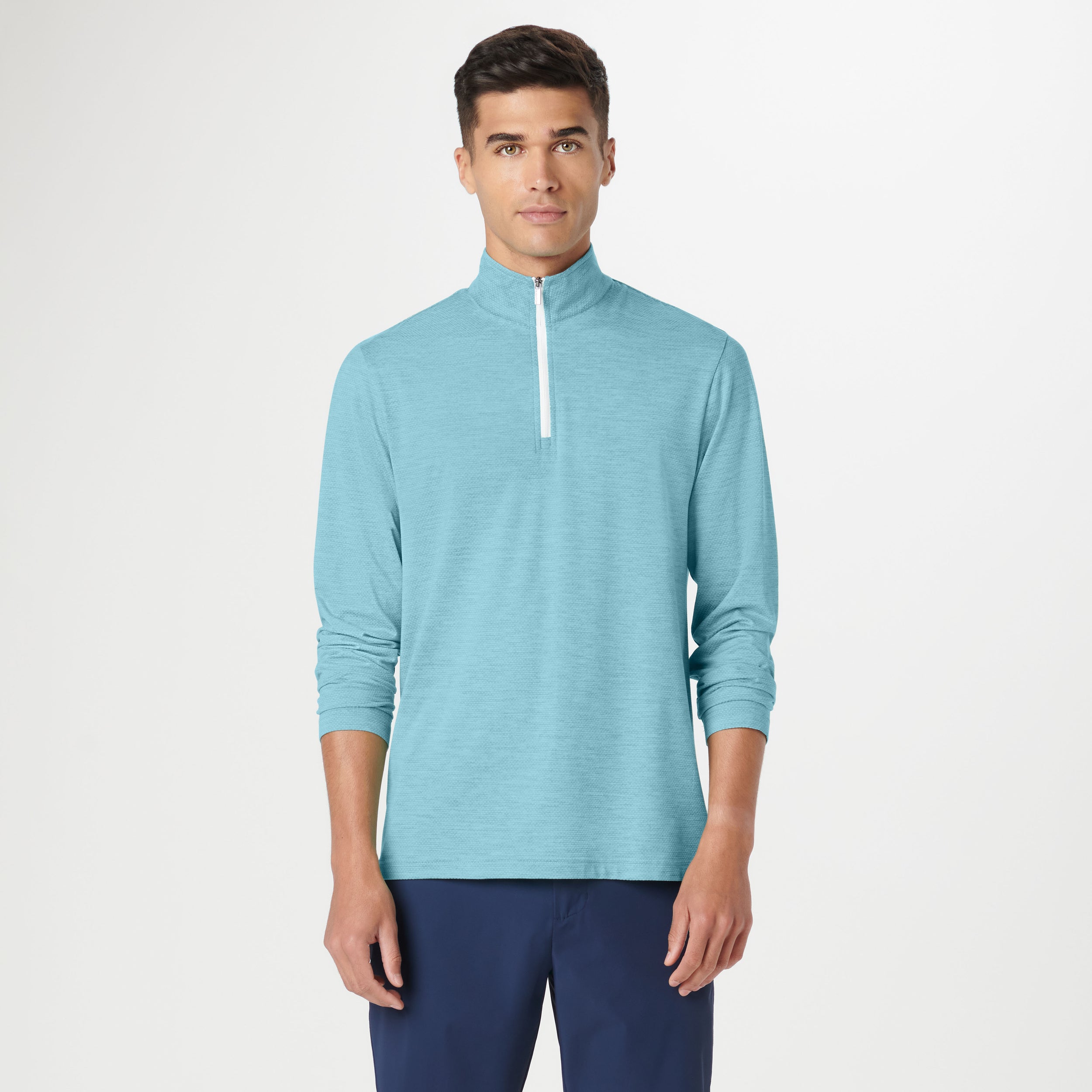 This performance quarter zip pullover in a stylish speckled heather pattern features a mock neck. Beyond style, this garment offers UV50 SPF protection, making it perfect for outdoor activities.