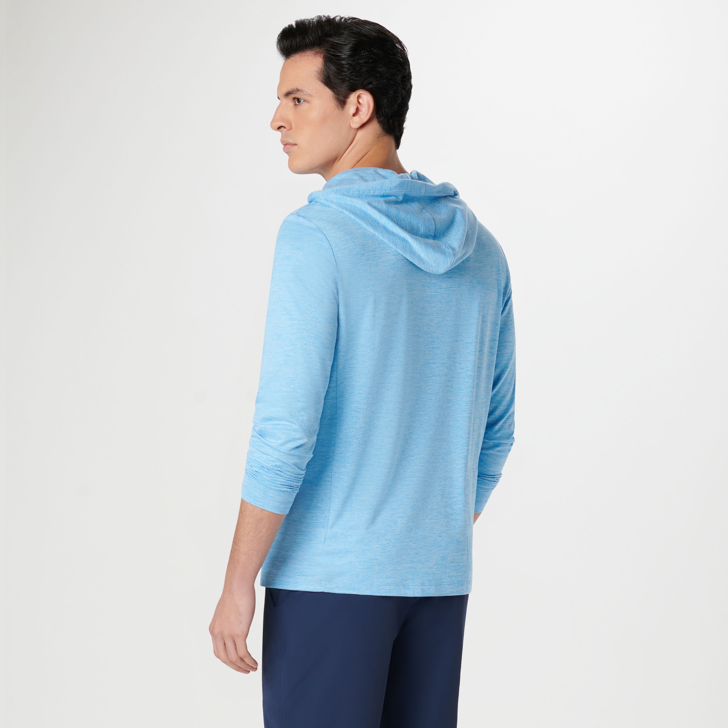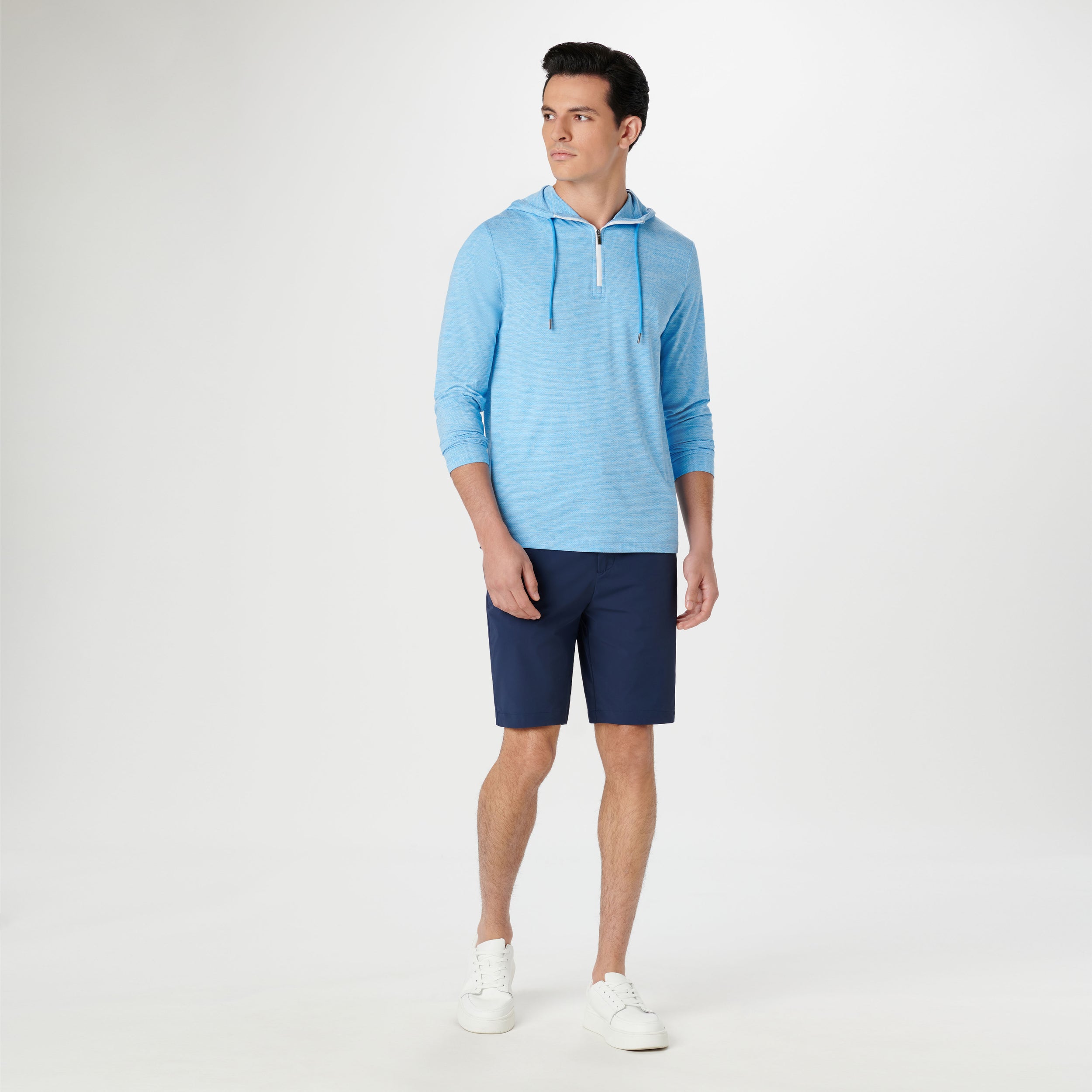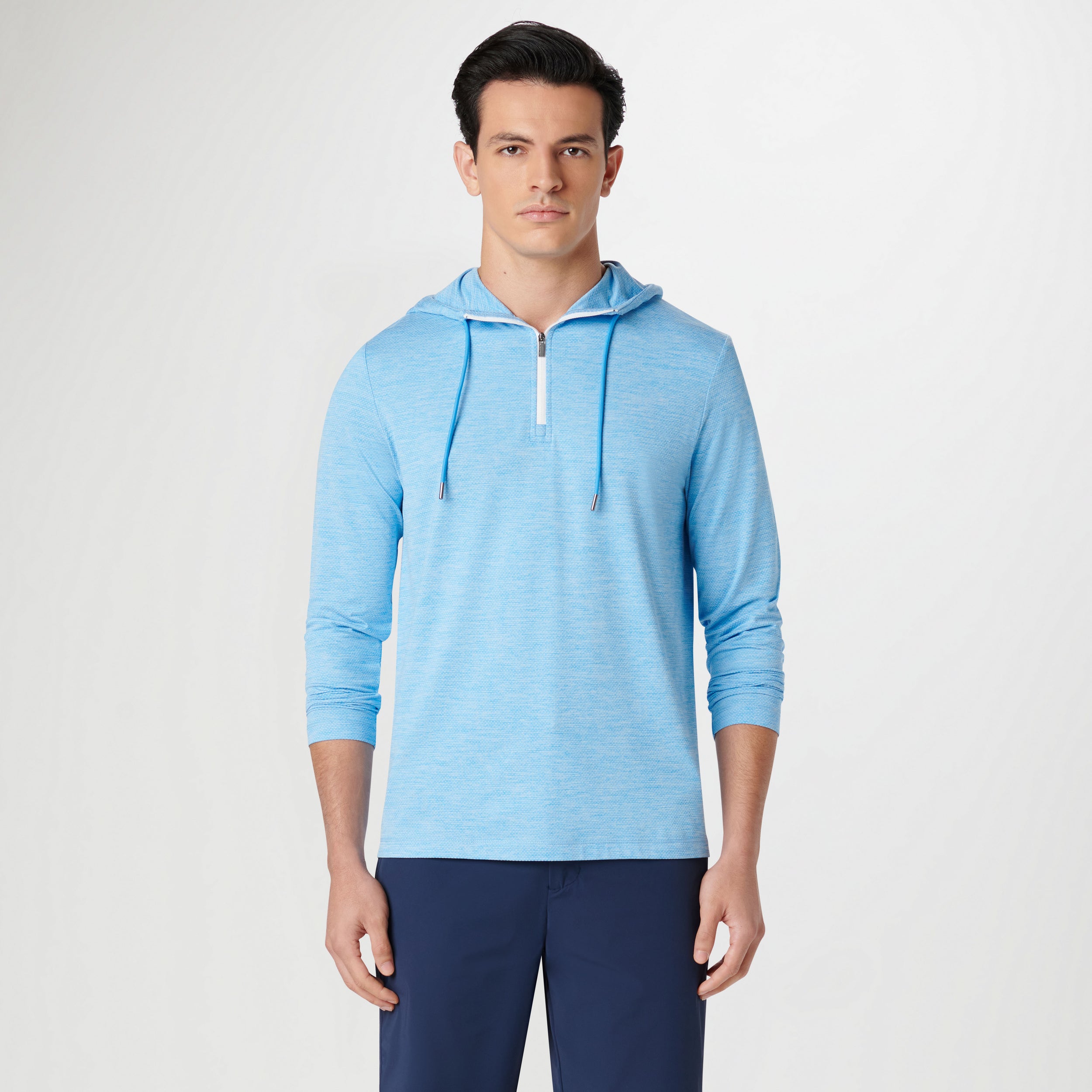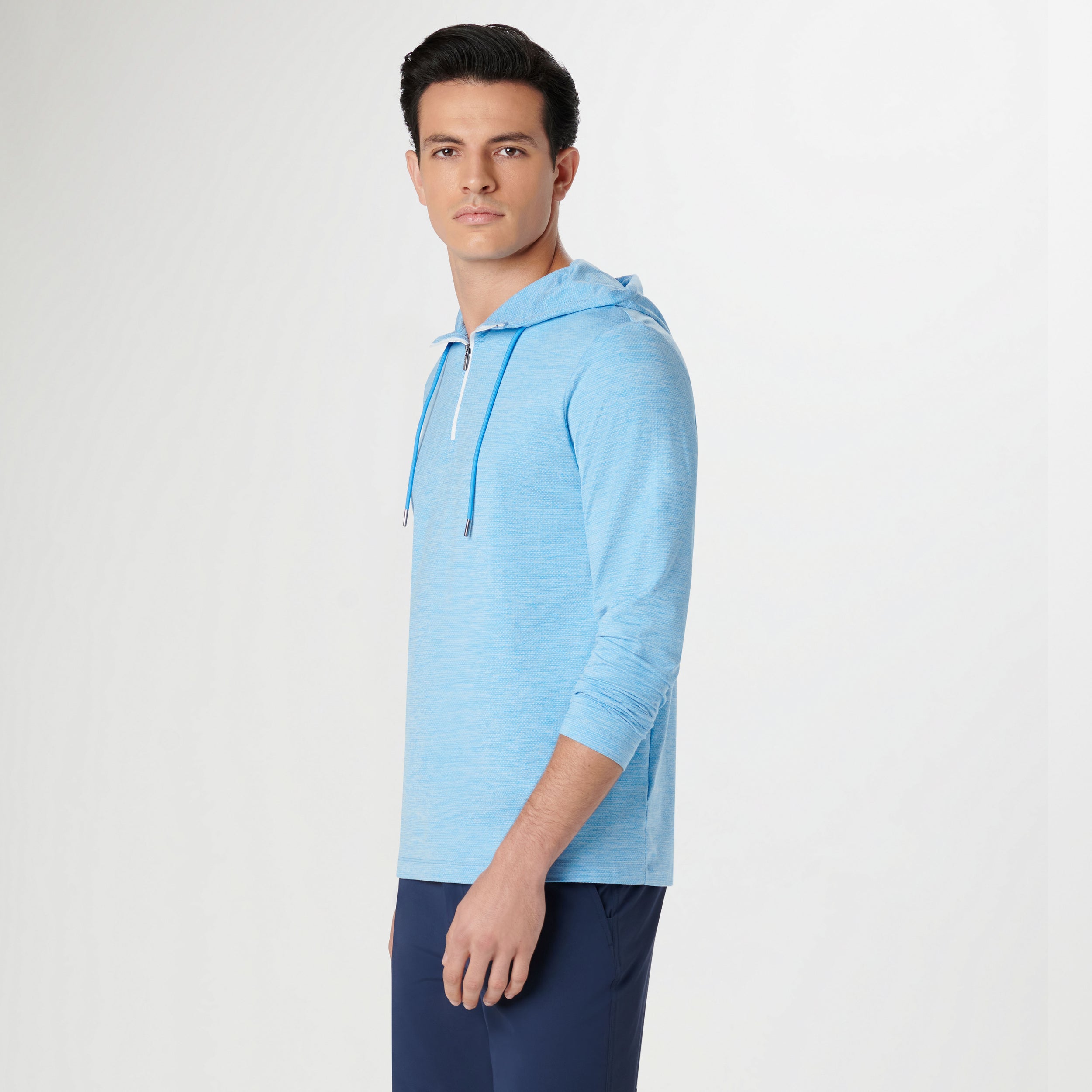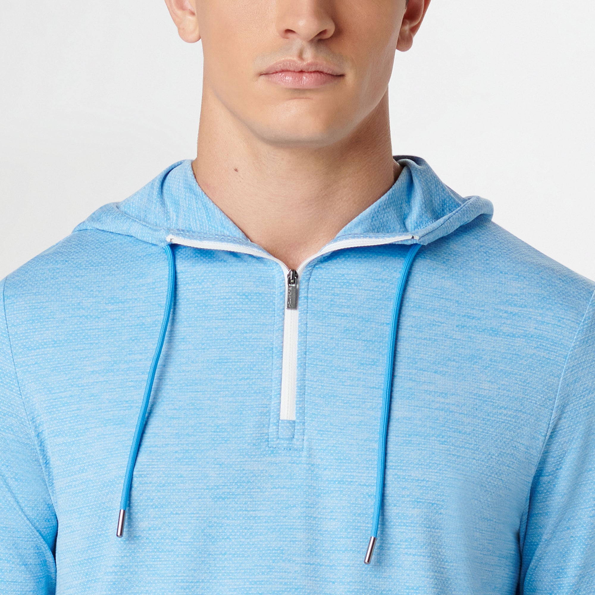 This performance quarter zip pullover in a stylish speckled heather pattern features an adjustable drawstring hood. Beyond warmth and comfort, this garment offers UV50 SPF protection, making it perfect for outdoor activities.