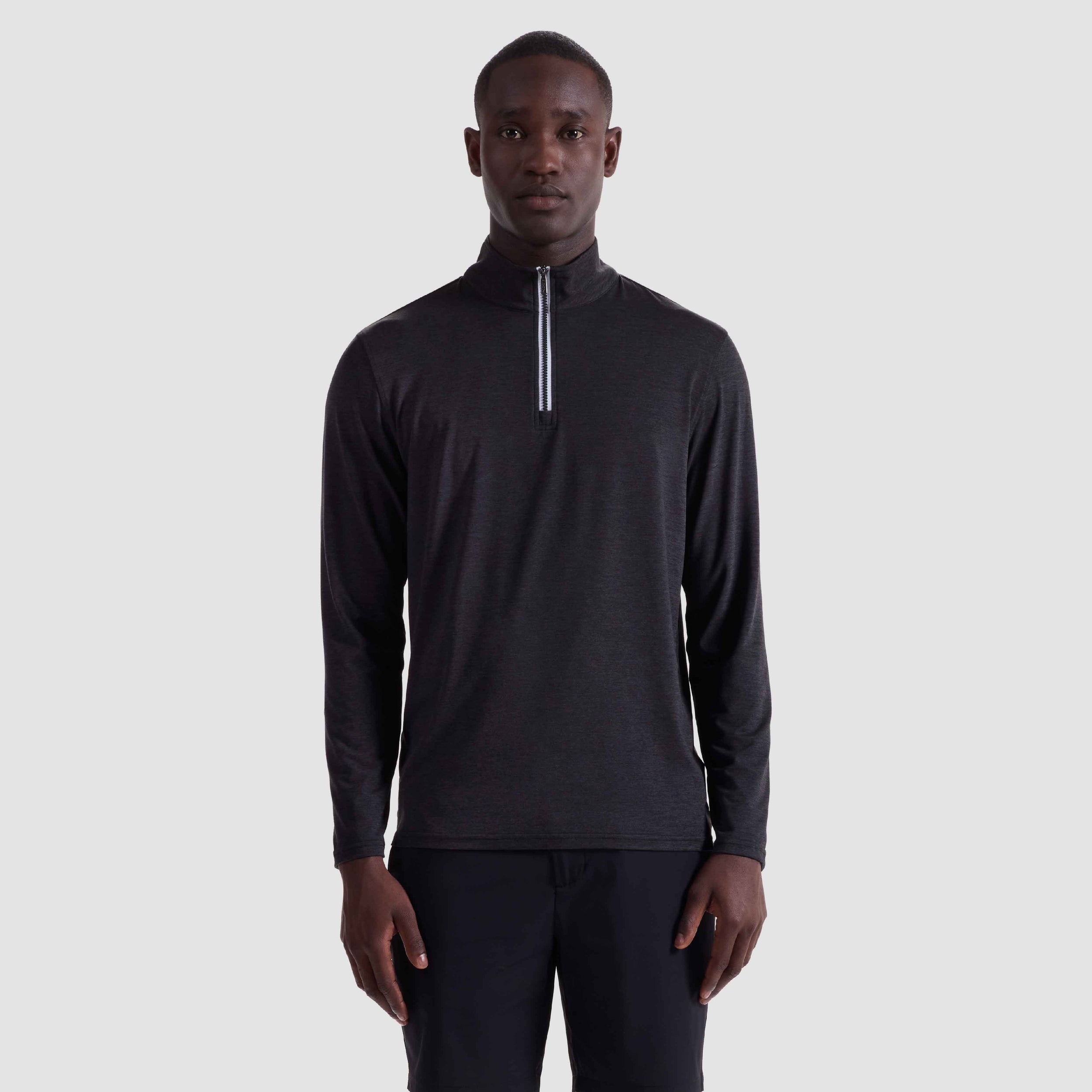 Elevate your resort and weekend style with this premium performance long sleeve quarter-zip pullover, designed with SPF 50+ sun protection to keep you covered under the sun. Crafted in a soft melange fabric, it features a contrast zipper placket and a striking printed inner collar for a pop of personality. Perfect for laid-back weekends and relaxed resort wear.