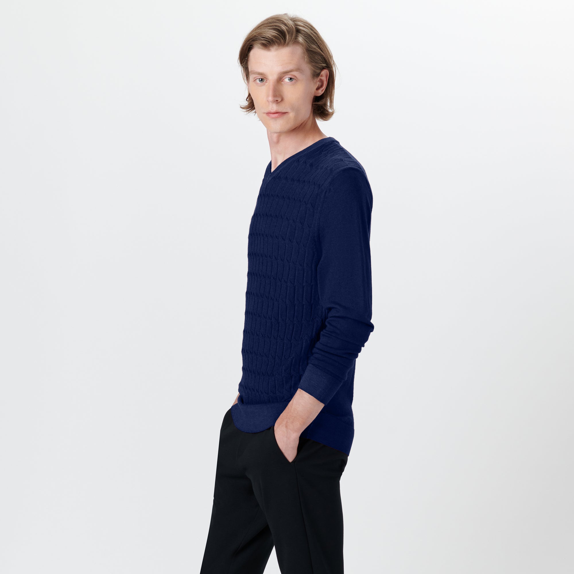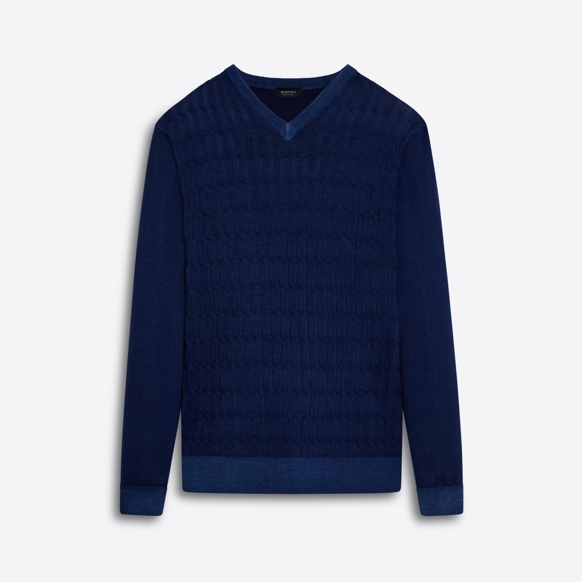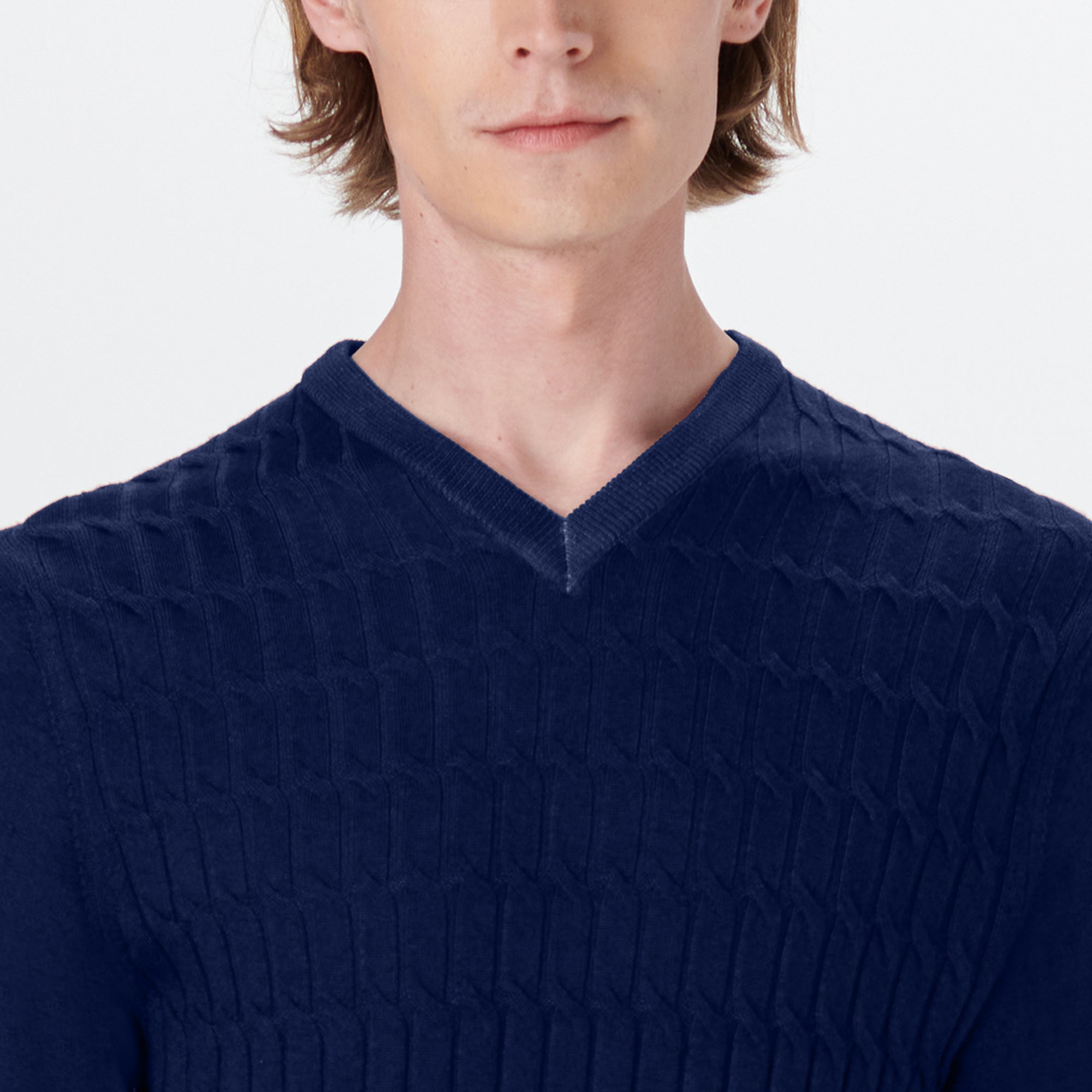 V-neck sweater in cable knit 100% extra fine merino wool with Harmony 4.0 special finishing. This sweater is made with a high twist yarn that is breathable, hygroscopic, water repellent, machine washable and crease proof for long lasting performance wash after wash. Made in Italy.