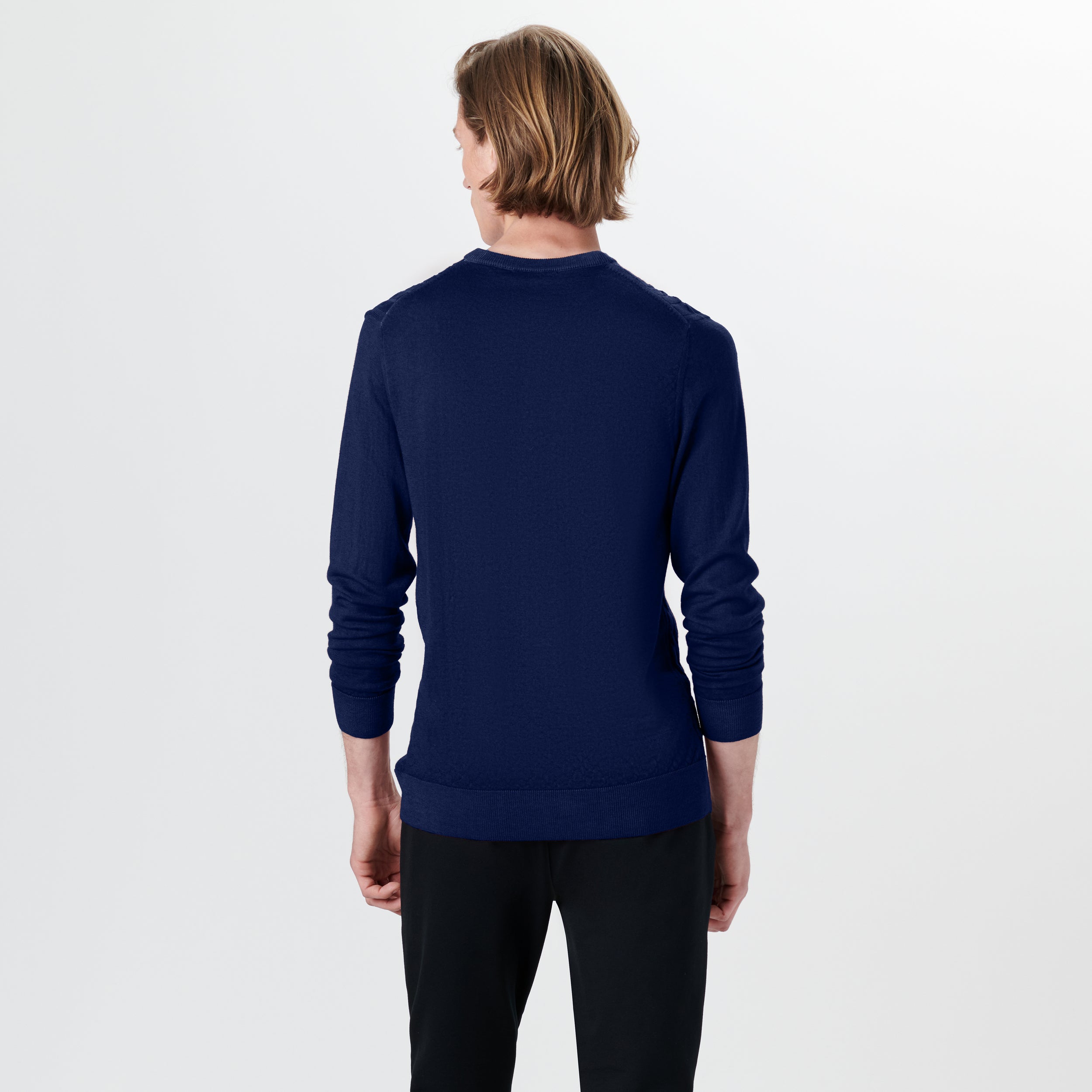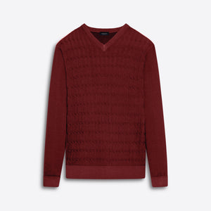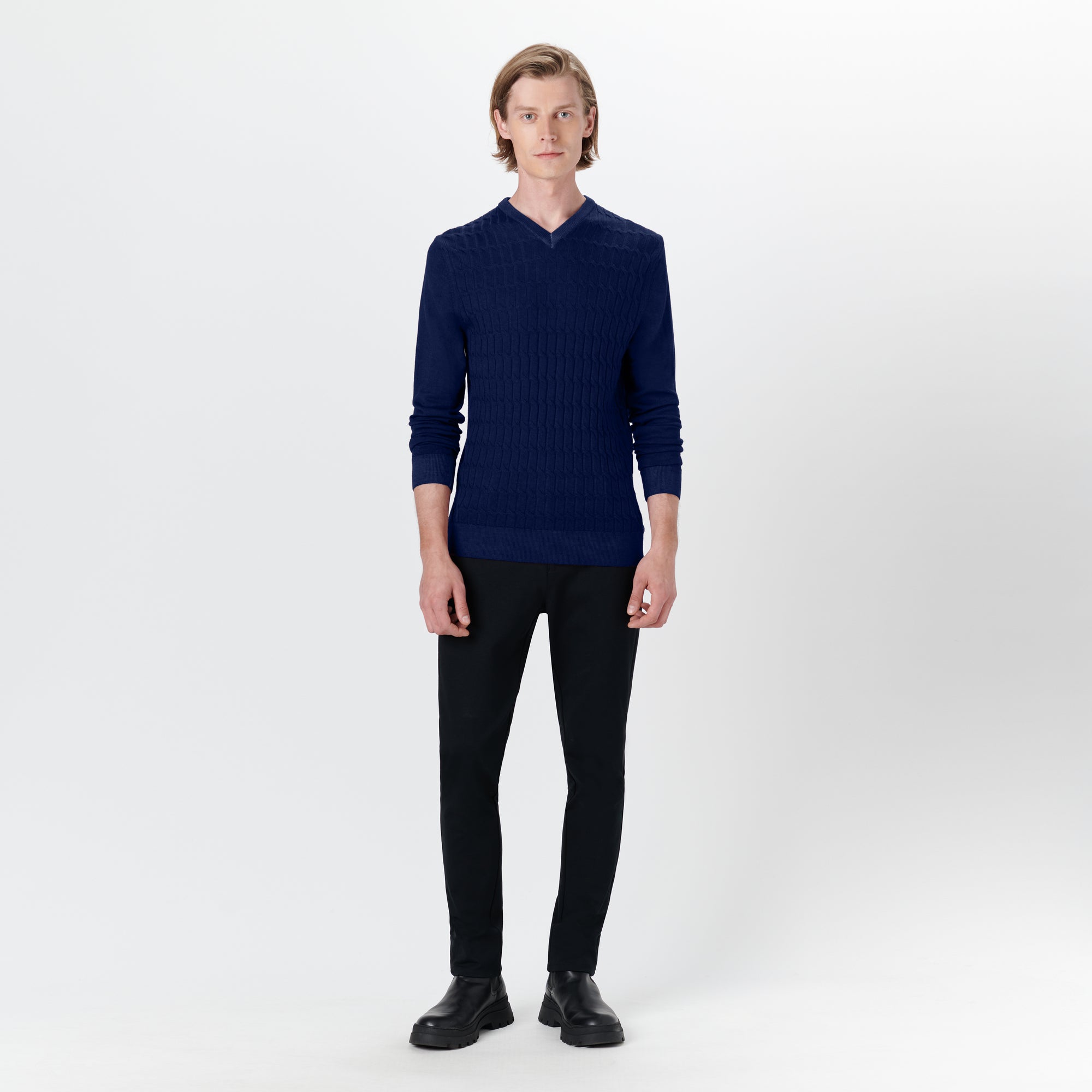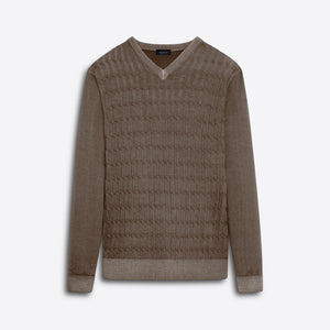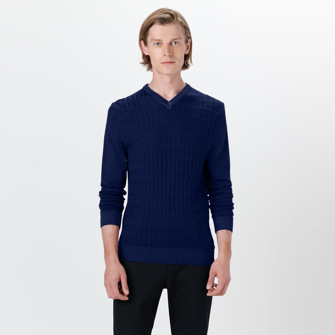 V-neck sweater in cable knit 100% extra fine merino wool with Harmony 4.0 special finishing. This sweater is made with a high twist yarn that is breathable, hygroscopic, water repellent, machine washable and crease proof for long lasting performance wash after wash. Made in Italy.
