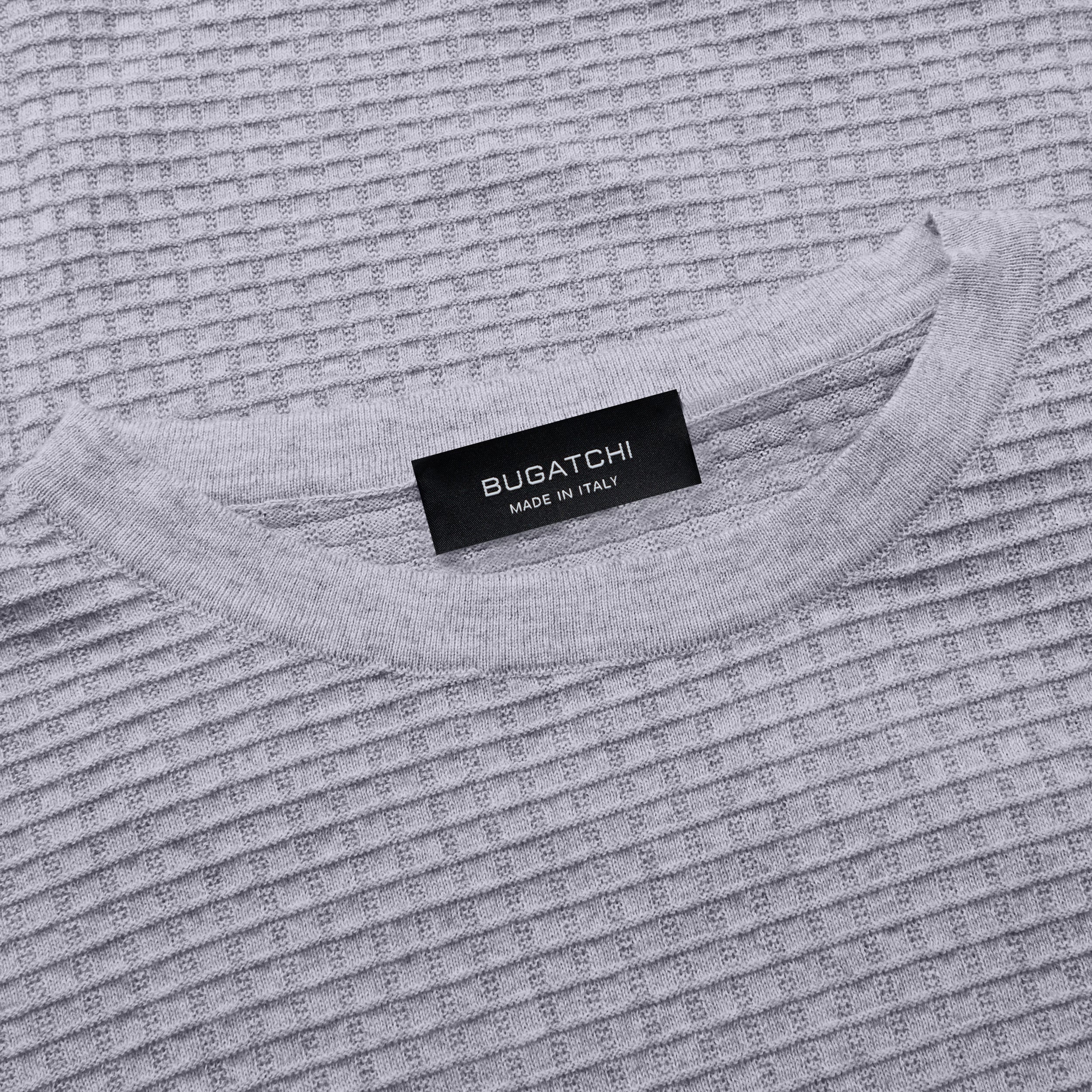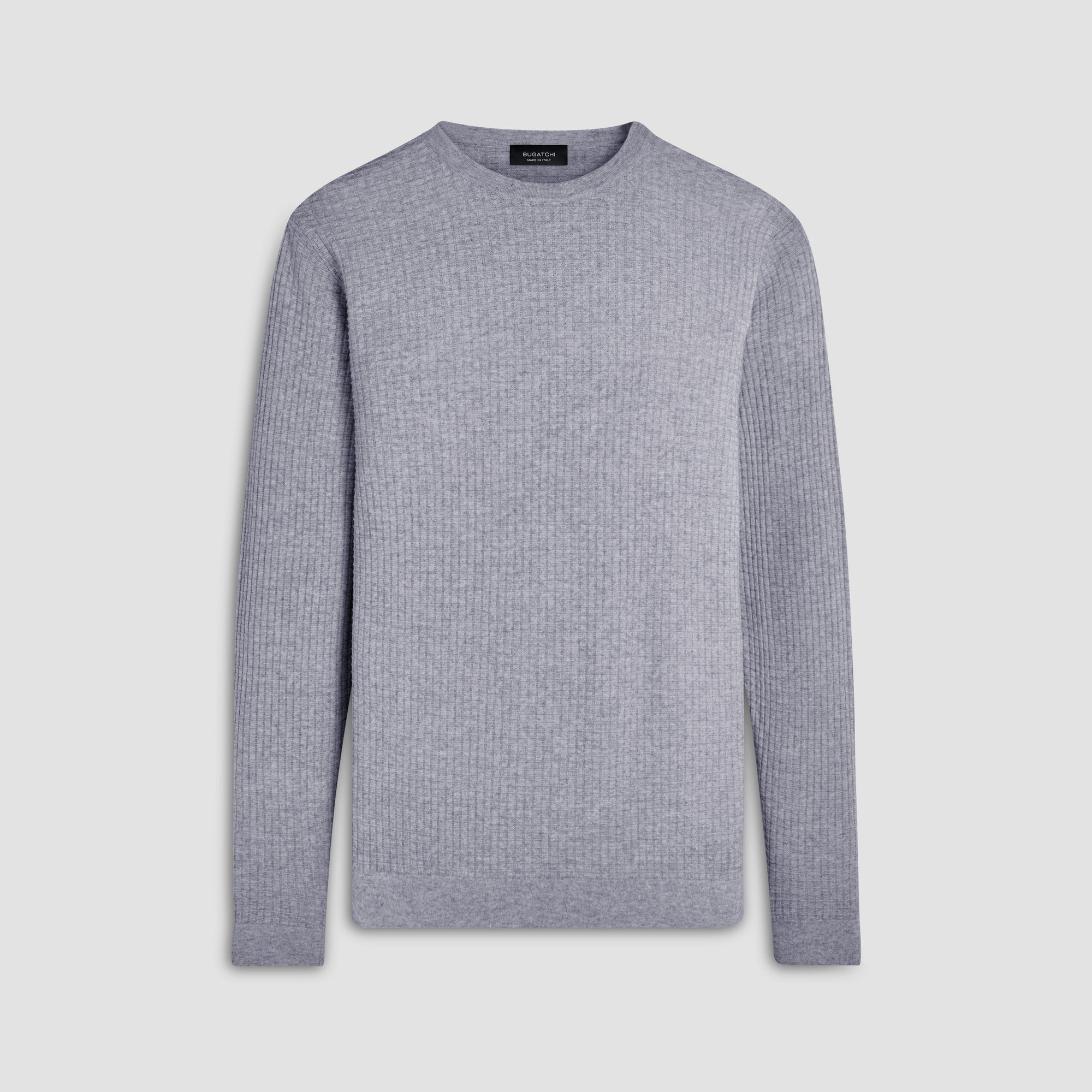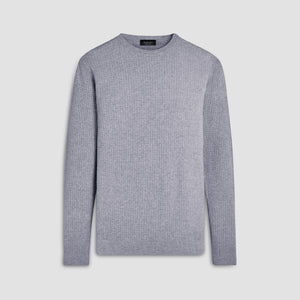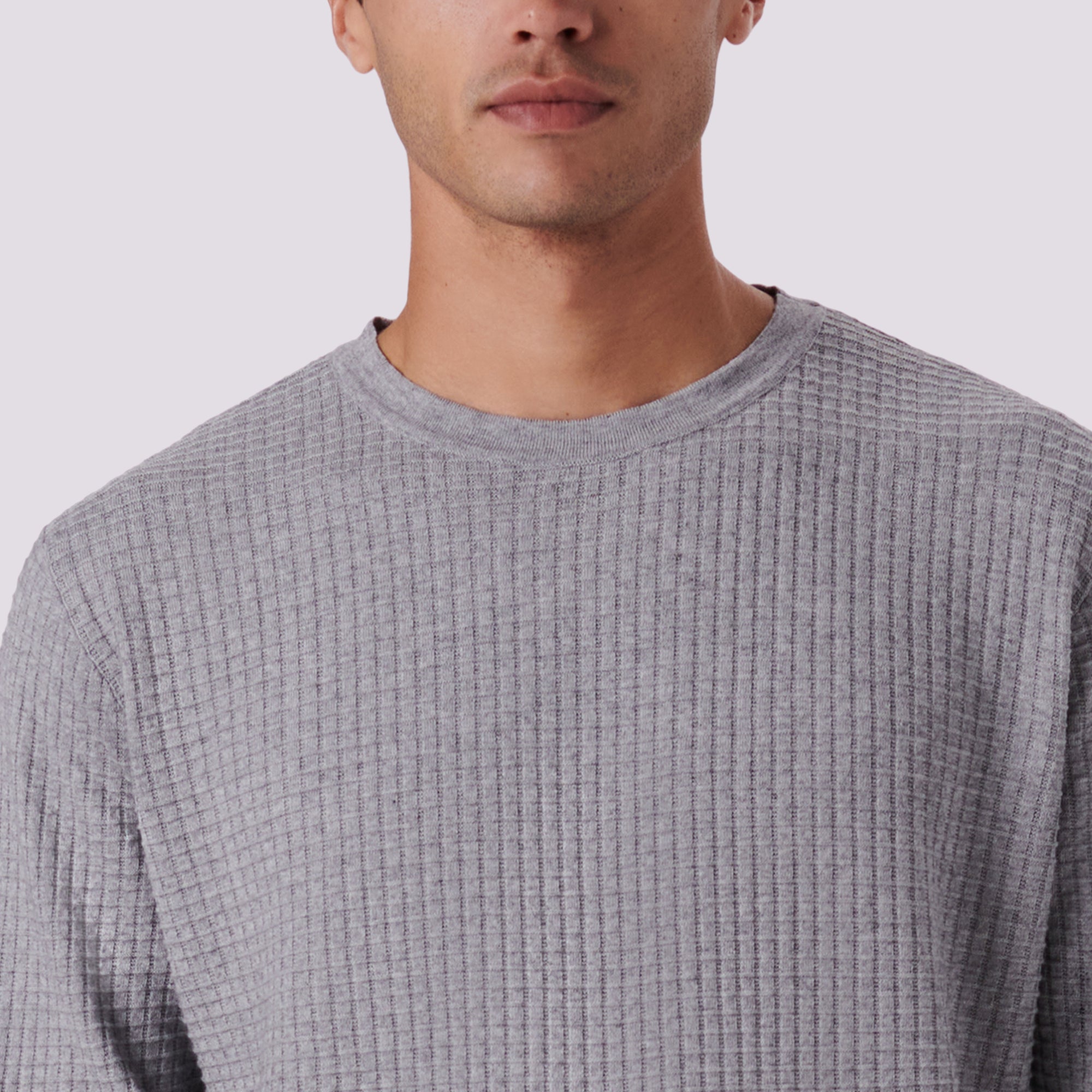 Waffle knit long-sleeved crew neck sweater in cotton and cashmere blend with rib knit collar, cuffs and waistband. Made in Italy.