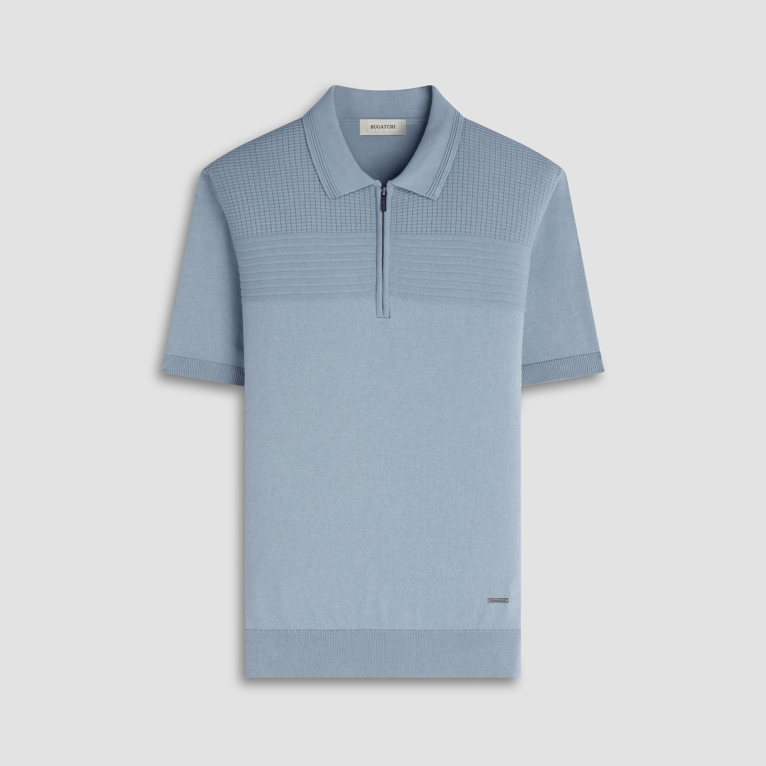Crafted from a soft cotton blend, this short-sleeve quarter zip polo sweater features a distinctive upper chest panel in a textured waffle knit, underlined by horizontal ribbed bands for added dimension. The collar and placket are detailed with refined Ottoman stripe stitching, while ribbed cuffs and hem complete this polished, modern silhouette.