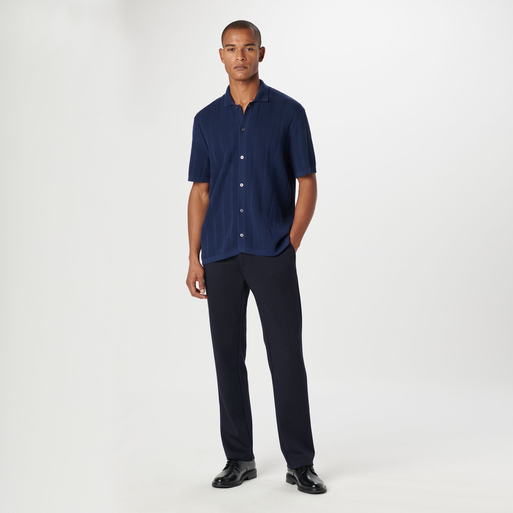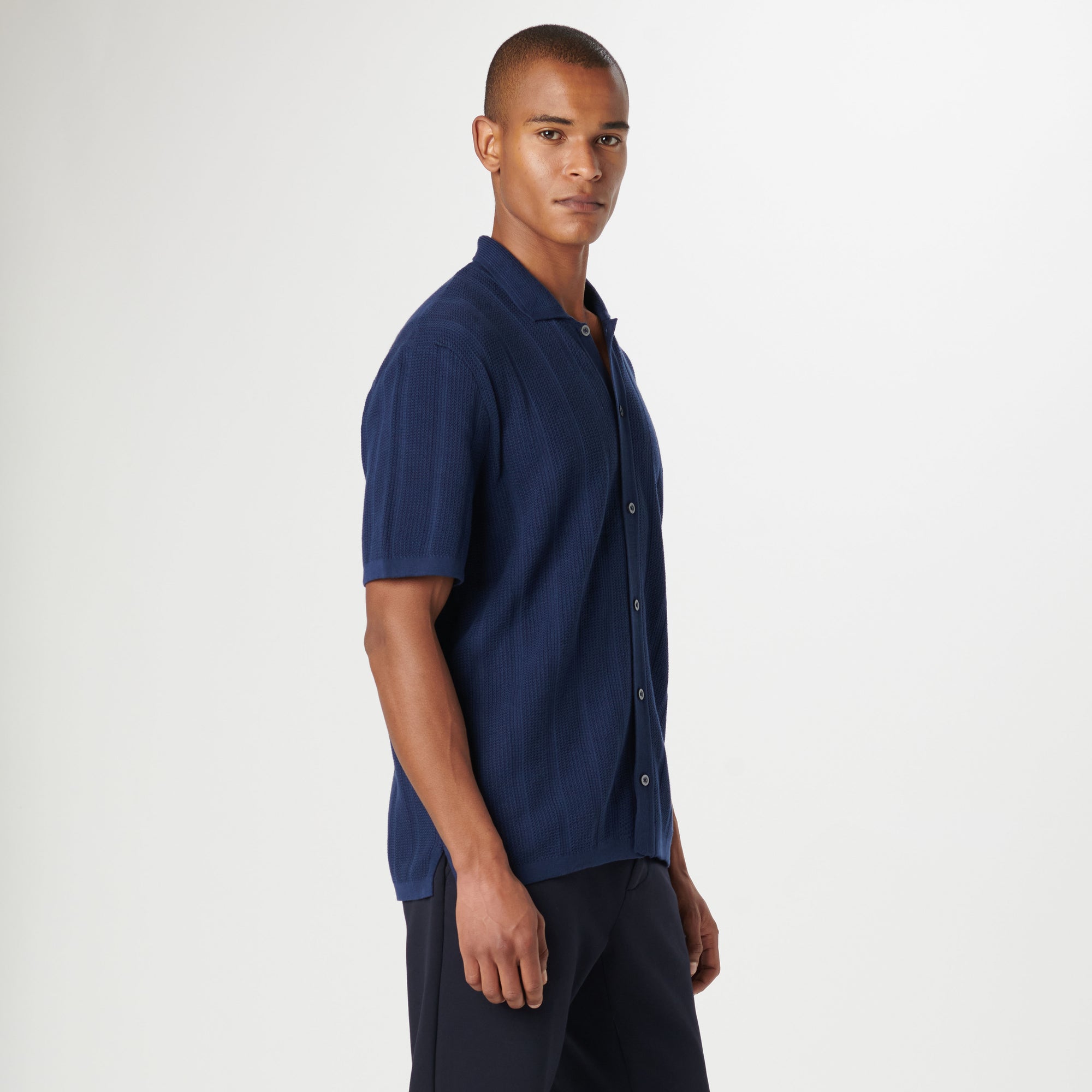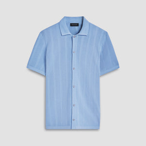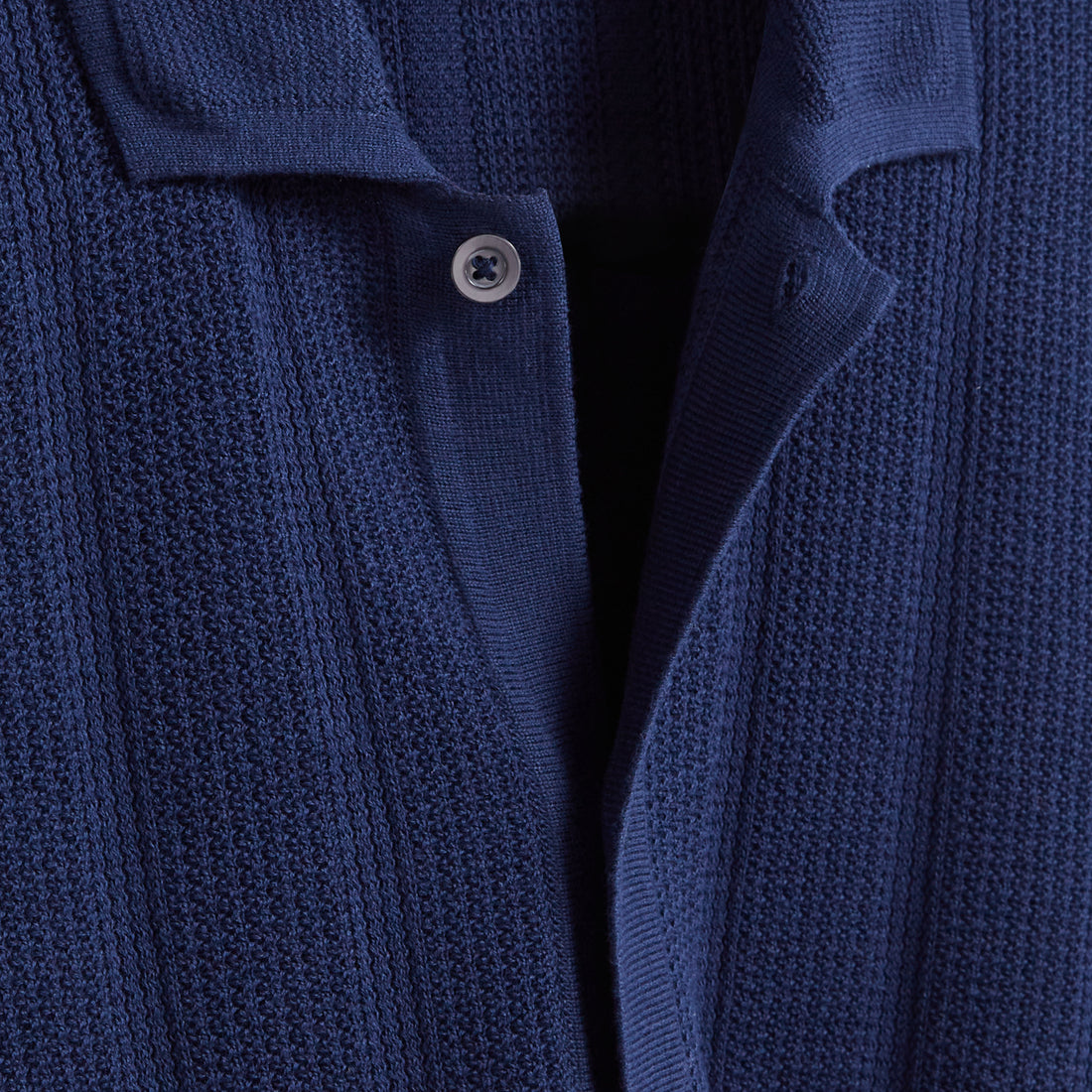 This short-sleeved polo sweater, crafted in 100% cotton yarn with a waffle rib texture, showcases a distinctive full button closure and flat knit trim on the placket, adding refinement and versatility to the classic polo style. Offering breathability, moisture-wicking, chemical-free comfort, and machine washability with low pilling, it ensures durability and year-round comfort.