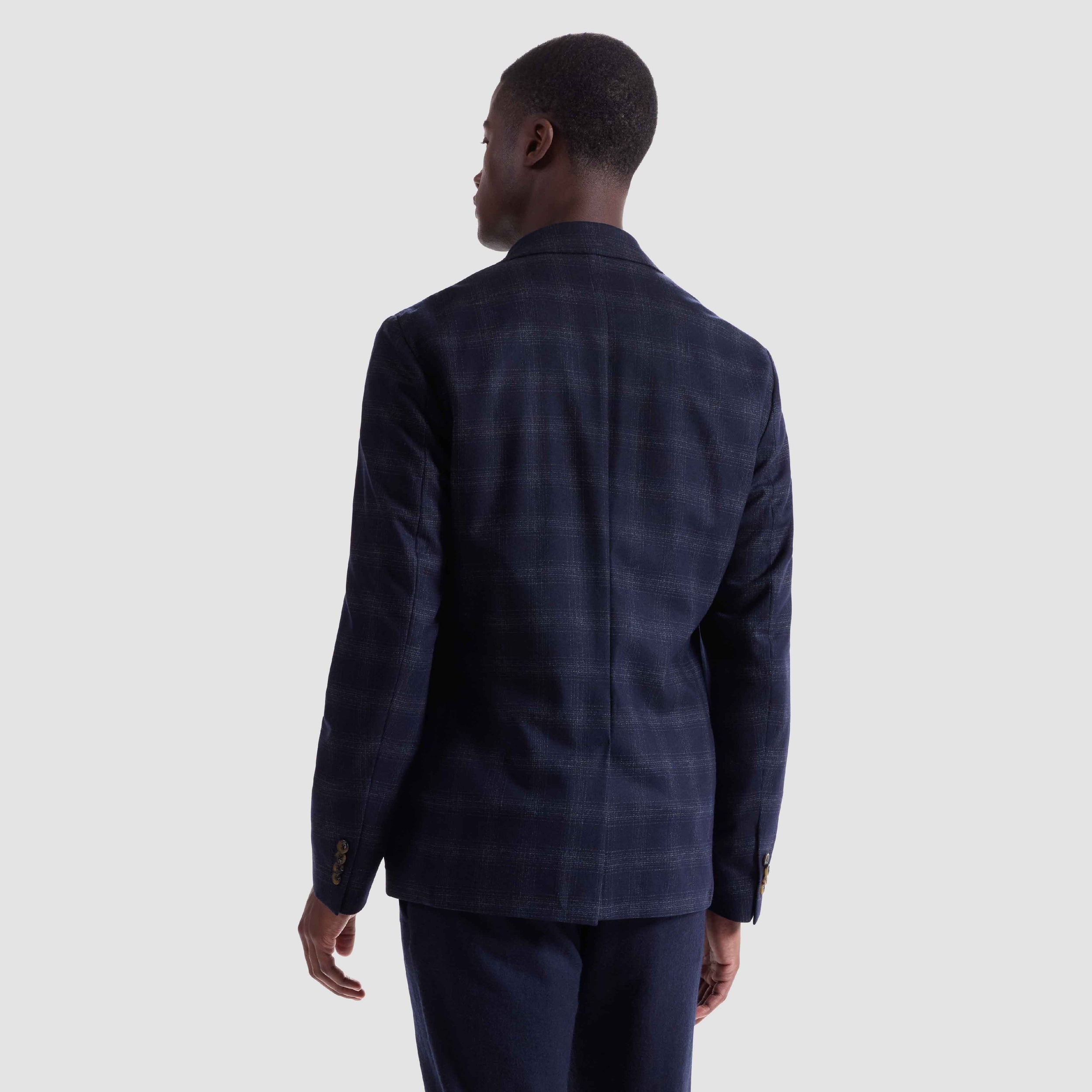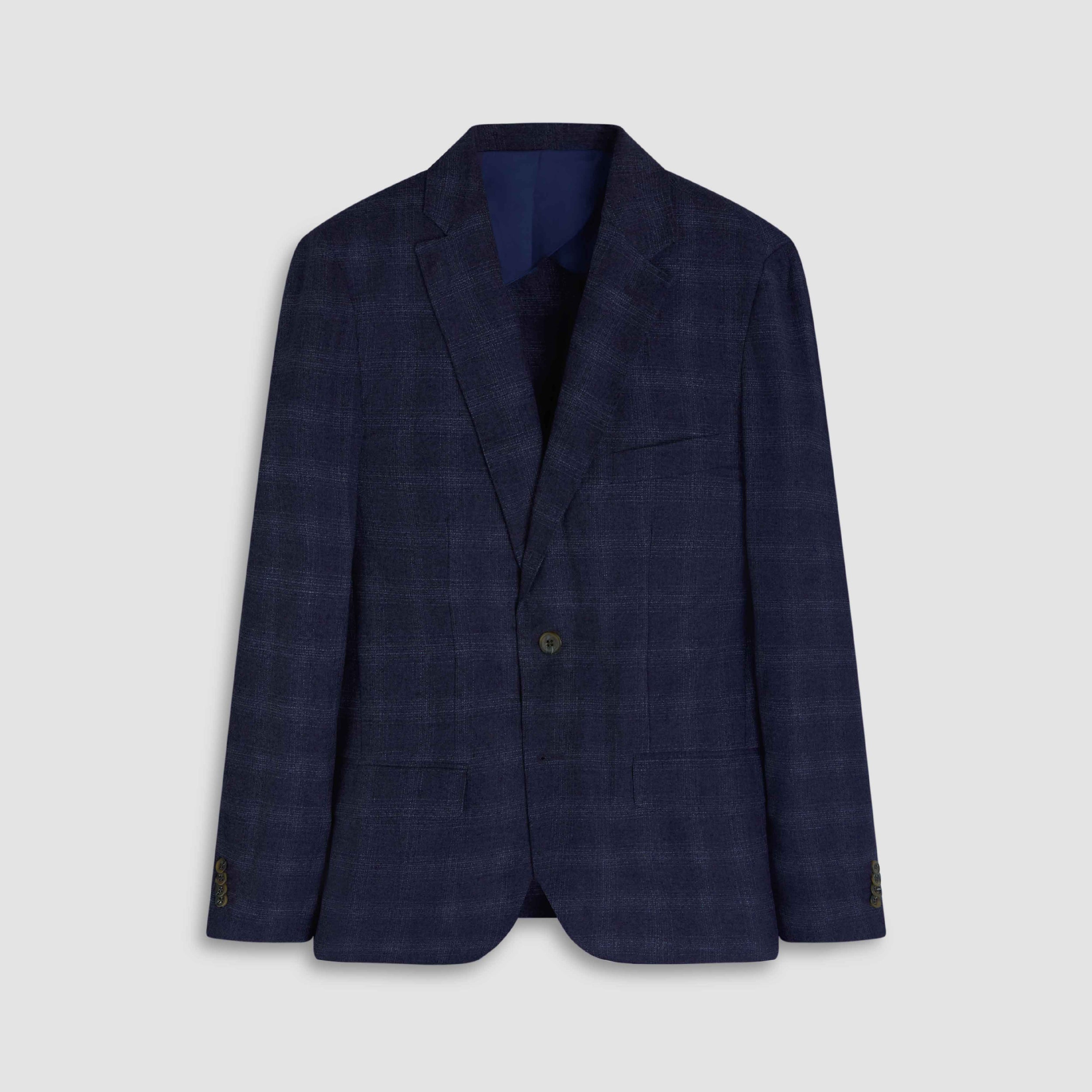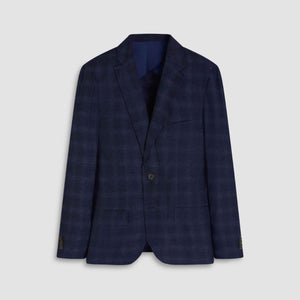 Crafted in Italy, this two-button blazer features a refined wool blend with a subtle windowpane check pattern. Designed with a notched lapel, butterfly lining, and eco-friendly corozo buttons. Functional details include two flap pockets, a welt chest pocket, and two interior buttoned reese pockets.