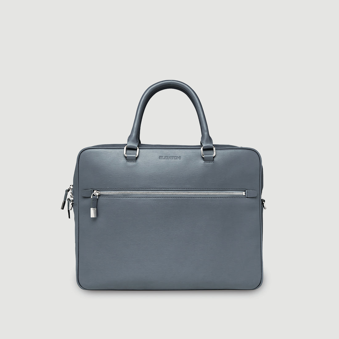 Wood grained semi embossed leather briefcase with rolled top handles detachable adjustable shoulder strap zip top front zip pocket and slip back pocket with snap. Interior includes padded computer pocket pen holders zip and slip pockets. Embossed logo in front silver tone hardware with engraved zipper pull ottoman lining and tonal stitching.
